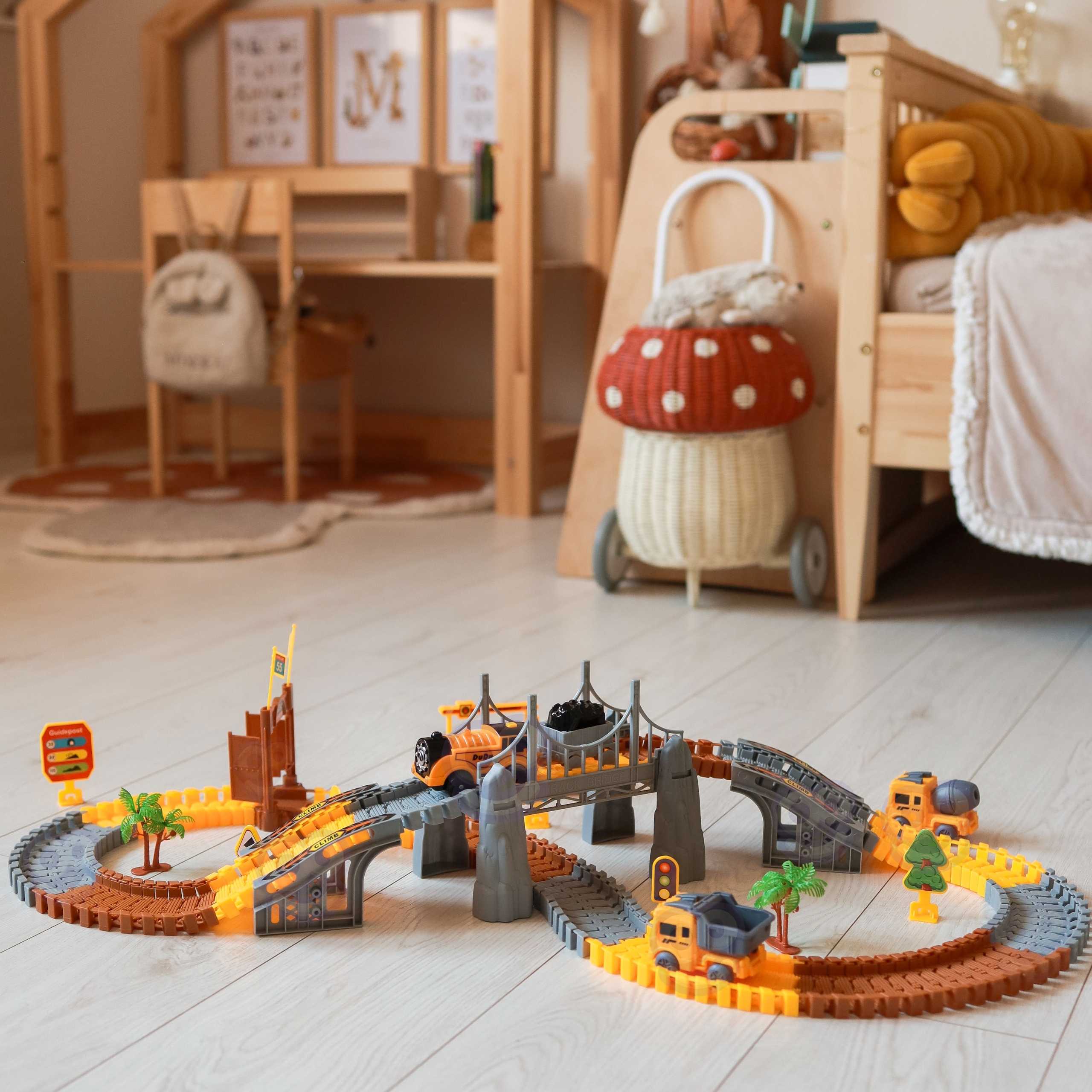 Reisige suurte masinate ja põnevate ehitusplatside maailma Woopie kaubamärgi ehitusraja abil. See rada on tohutu, 174-osaline komplekt, mis viib teie lapse otse põnevaid seiklusi täis ehitusplatsile. Komplekt võimaldab iseseisvalt ehitada ulatuslikke marsruute sildade, väravate ja pööretega, samuti kasutada realistlikke ehitussõidukeid. Tänu värvilistele elementidele ja tugevale töötlusele tõmbab mänguasi tähelepanu ja julgustab mitu tundi loomingulist mängu. See on ideaalne valik igale väikesele insenerile, kes armastab ehitada, planeerida ja avastada uusi võimalusi! Omadused: – Lastele alates 3. eluaastast – Paindlikud rajalõigud – võimaldavad vabalt kujundada marsruuti, luua pöördeid, üles- ja allamäge lõike. – Rikkalik komplekt, mis sisaldab 174 elementi – Väikesed ehitussõidukid – kallur, betoonisegisti ja ekskavaator – Vedur koos ajamiga – võimaldab vedada “koormat” rajal – Mängumaastikku rikastavad tarvikud – Valmistatud kvaliteetsetest materjalidest – Toiteallikas – 2 x AAA 1,5 V patareid (KOMPLEKTIS KOMPLEKT: – Loagon) Kallur – Ekskavaator – 150 roomiku elementi – 14 silla elementi – 2 palmipuud – kleebiste komplekt – värav – plastikust kaunistuste komplekt (4 teeviita, 2 lippu, puu, valgusfoor, bensiinijaam) Mänguasi arendab: – loovust – kujutlusvõimet – motoorseid oskusi
