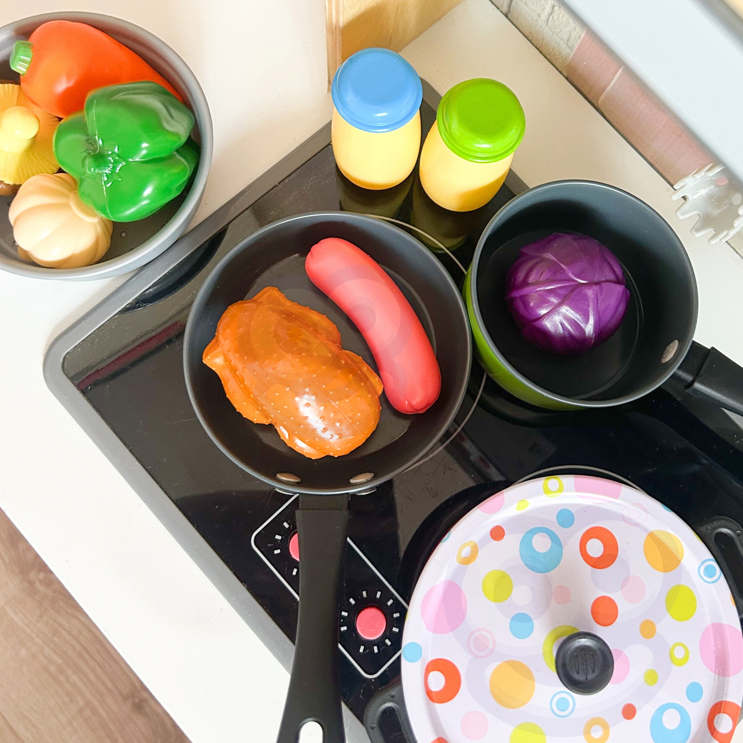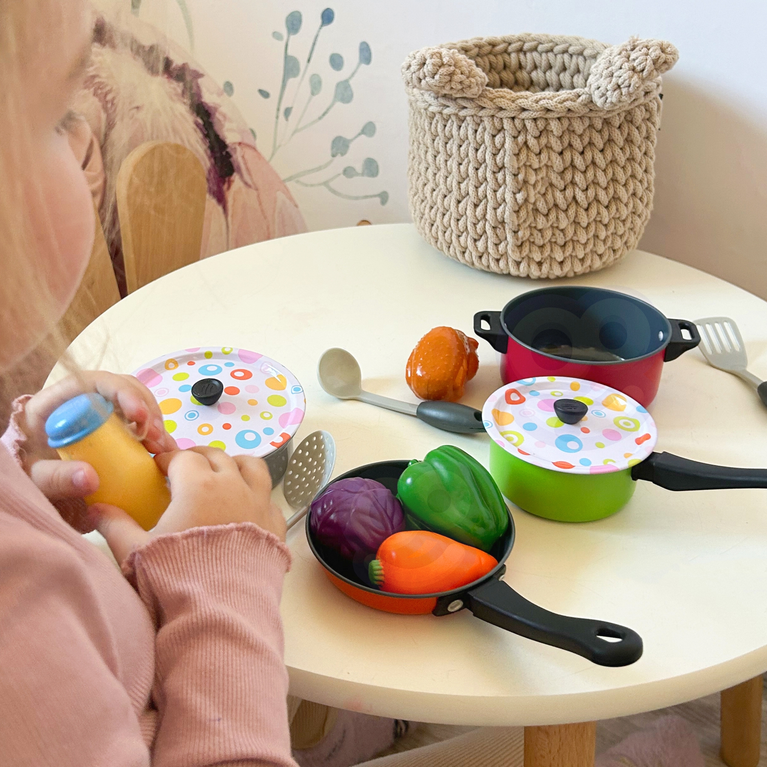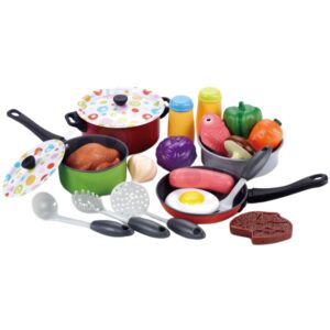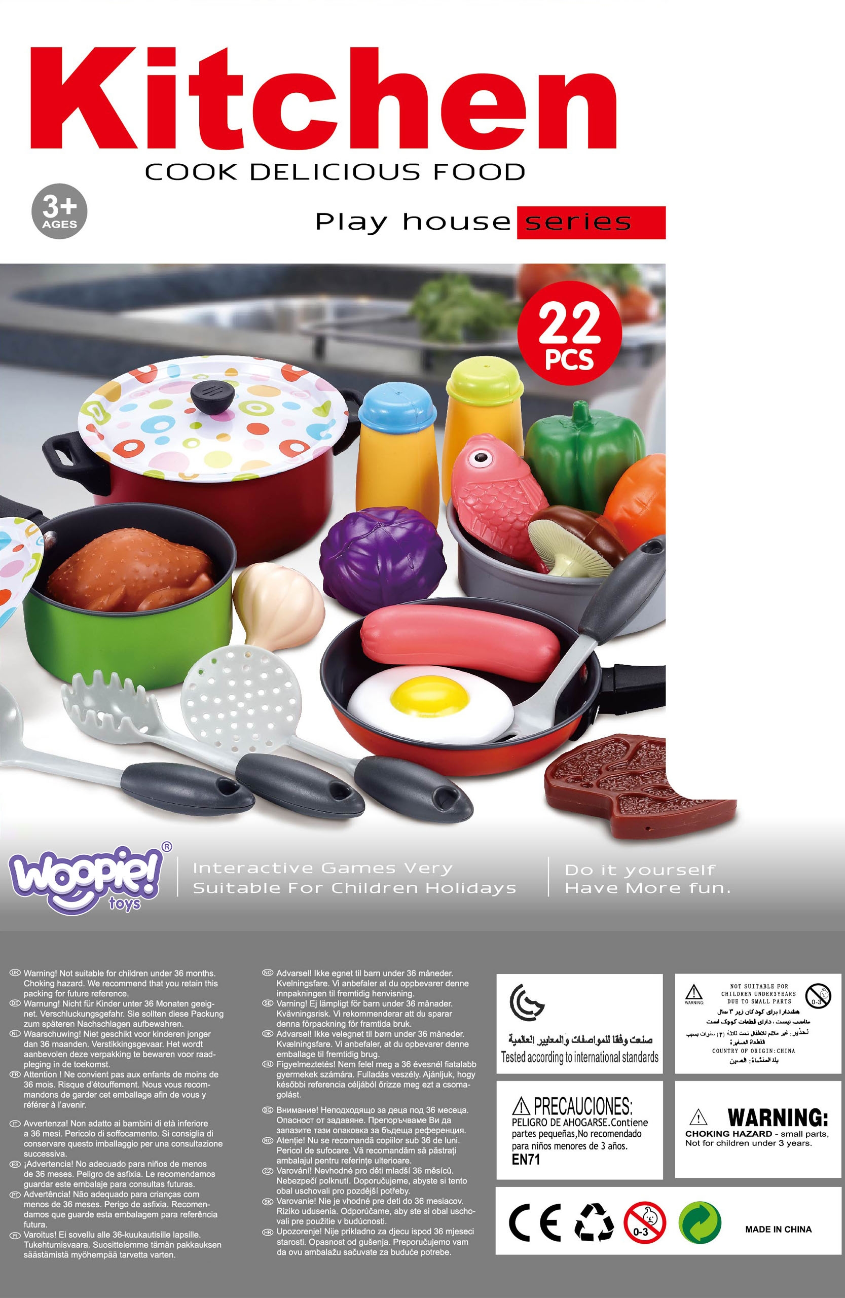 Suur Woopie kokakomplekt on maiuspala igale väikesele kokale. Iga väikelaps jäljendab oma vanemaid ja Woopie komplekt võimaldab teil oma roogasid valmistada ja ise roogasid valmistada. Kõik esemed on valmistatud igale detailile tähelepanu pöörates. Olemas on pott ja kaanega pott, samuti pannid, kauss, toiduained ja kööginõud. Komplekt on mõeldud lastele alates 3. eluaastast. Omadused: – alates 3. eluaastast, – komplekt sisaldab 22 elementi, – realistlik töötlus, – pakendatud kenasse pakendisse, – ilma teravate servadeta Komplekti kuuluvad: – eemaldatava kaanega pott, – eemaldatava kaanega kastrul, – küüslauk, – kala, – roheline pipar, – porgand, – seen, – vorstinõu, – sool, – kapsas, – sool ja pipraga. praemuna, – praad, – kana, – lusikas, – kurn, – pasta lusikas, – spaatliga.