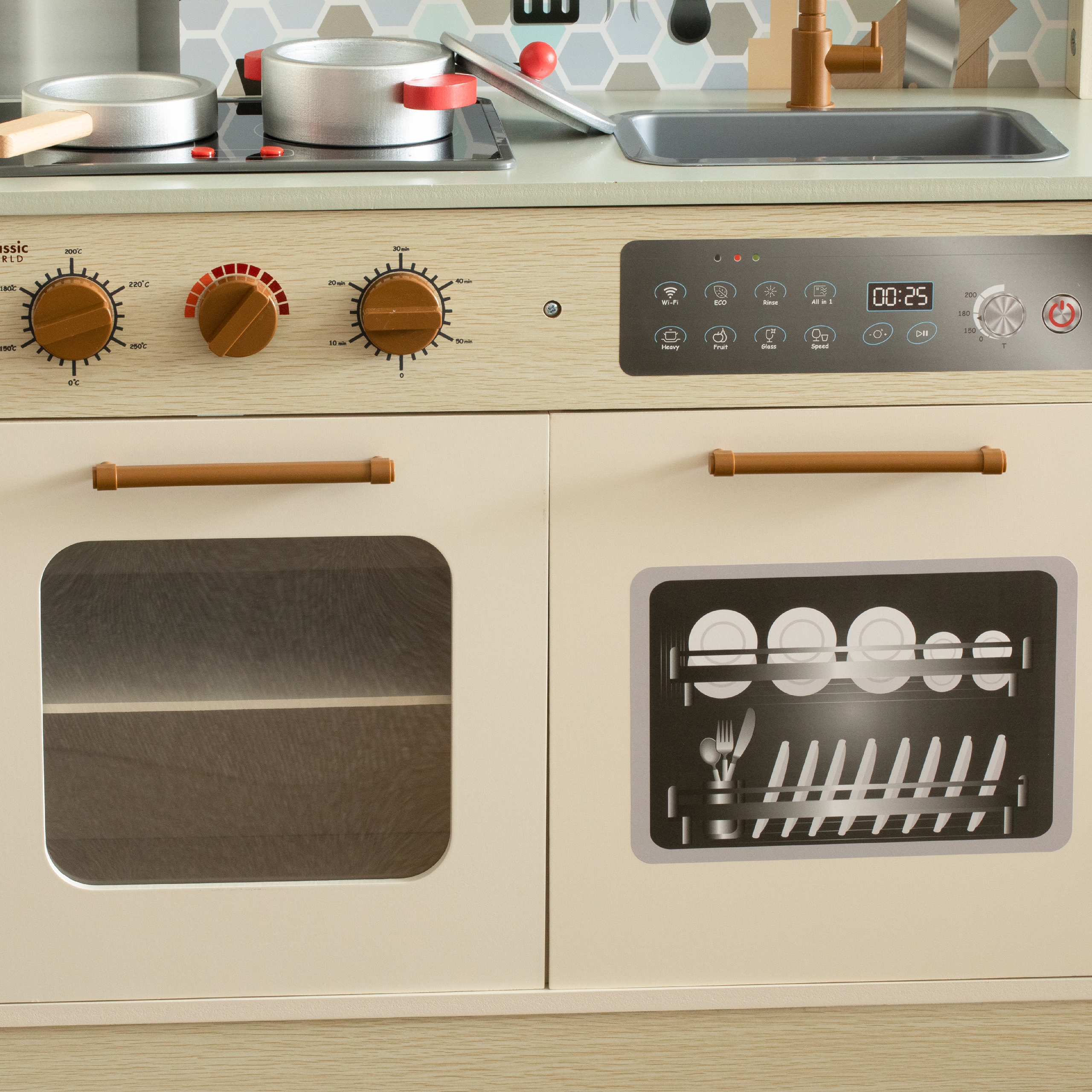 Kombineerides Retro stiili kaasaegsete funktsioonidega, on see Superior Kitchen XXL kaubamärgilt CLASSIC WORLD – see võimaldab lastel avastada ja kogeda laia valikut kaasaegseid köögilahendusi! Funktsioonide hulka kuuluvad: mikrolaineahi, nõudepesumasin, ahi, valgus- ja heliefektidega elektripliit, jäämasinaga külmkapp, kraanikauss ja valgustus. Lapsed saavad puu- ja juurviljade “pesemiseks” kraani lahti keerata, seejärel kasutada pliiti koostisainete “küpsetamiseks”. See täiuslik köök annab neile täieliku kogemuse olla väike kokk. Omadused: – mänguasi vanuses 3 ja vanematele – esitleb kaasaegseid köögifunktsioone – kaasaegseid funktsioone kombineerituna retro disainiga – valgus- ja heliefektid – elektripliit, valgusti – rollimäng – mängib emme, issi või kokka – valmistatud kvaliteetsetest materjalidest Ökomänguasjad on mõeldud kõige väiksematele lastele, mis on valmistatud täiesti looduslikest, biolagunevatest ja ohututest materjalidest, kuid mitte ainult ohutuks ja hüpoallergeenseks materjaliks10 ka oma lapsele.