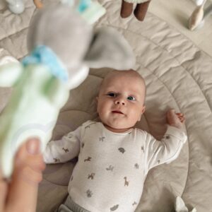 Brändi Woopie Plush Dog lõbustab teie last. Mänguasi sobib beebidele, on beebi kätele ideaalse struktuuriga ja on täidetud pehme vatiga. Lisaks saab vanem käepidemest kinni hoida ja lapsega mängida. Peale varre pigistamist teeb plüüs iseloomulikku piiksuvat häält – see hoiab lapsel meelelahutust ja keskendumist ning sellel on kahisev element, mis ergutab lapse sensoorseid ja meeli. Pehme puudutusega topis saab teie lapse sõbraks juba varakult ja on temaga kaasas ka uneajal. Lisaks saab mänguasja ohutult ja lihtsalt puhastada. Juba väikesest peale arendab koer käeoskusi (peenmotoorikat) ja lapse meeli – kompimis-, kuulmis- ja nägemisvõimet! Omadused: – beebidele mõeldud mänguasi sünnist saati – õrnast materjalist ja vatiga täidetud – helifunktsioonid – varre pigistamisel kriuksumine – kahisev element – lihtne pesta Mänguasi arendab: – kompimismeelt, kuulmist ja nägemist – peenmotoorikat – käte liikumist – keskendumist