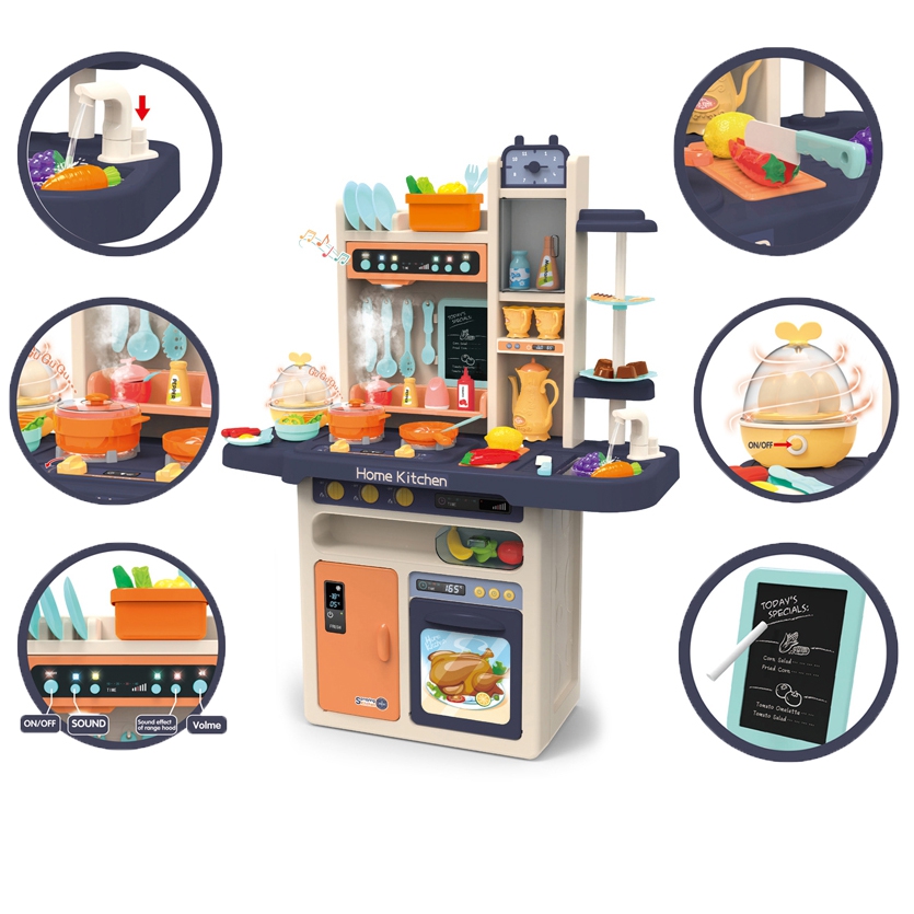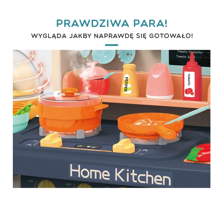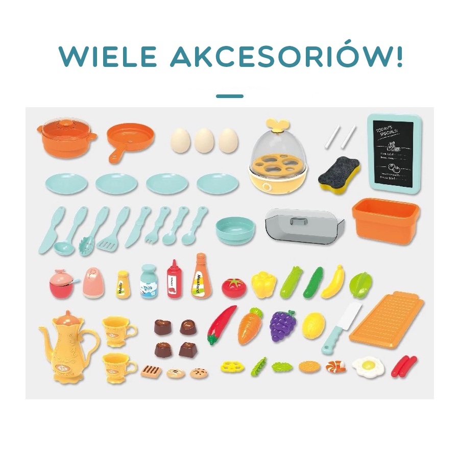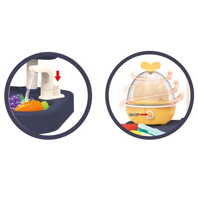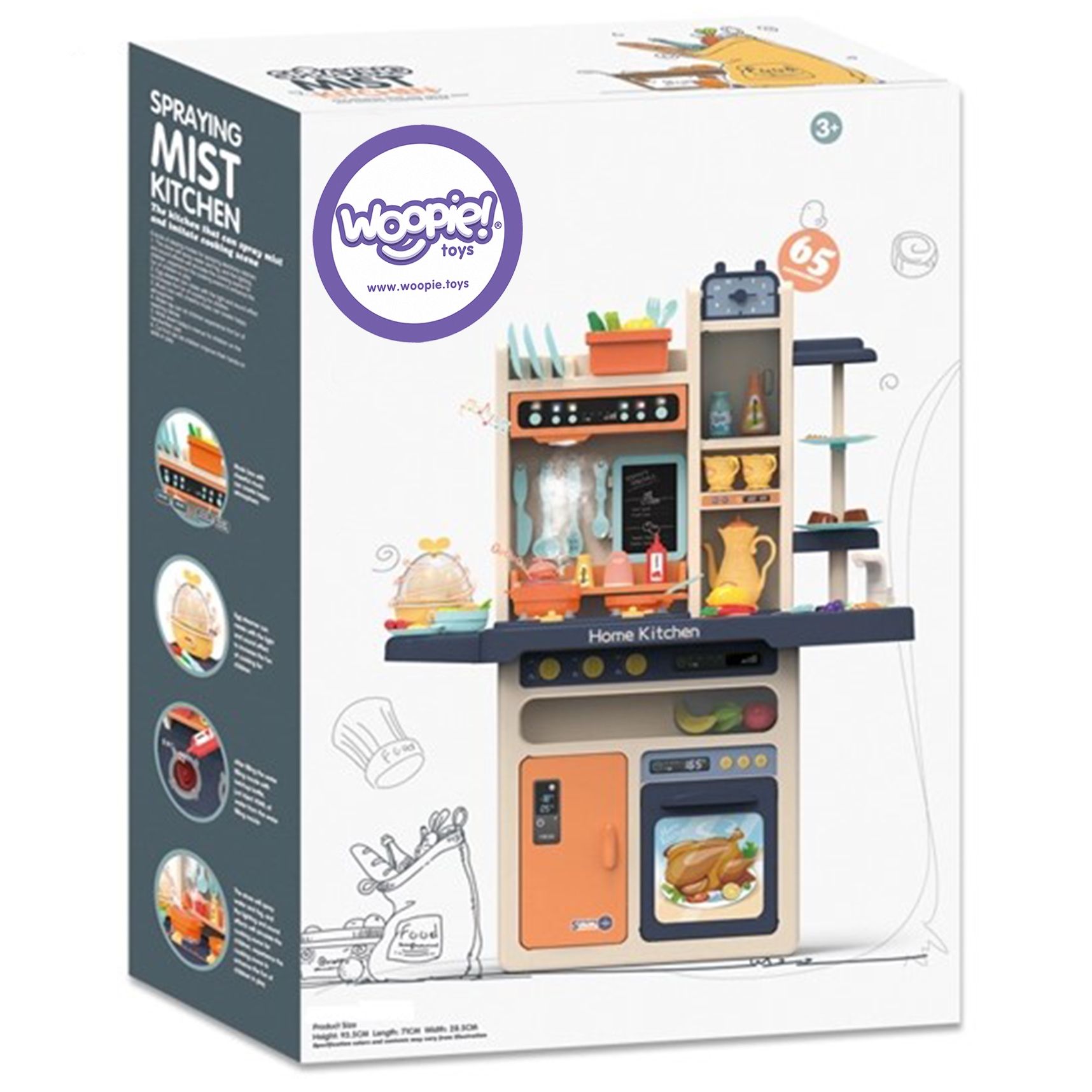 Juhtiva mänguasjatootja Woopie veetsirkulatsiooniga laiendatud lasteköök on ideaalne pakkumine lastele, kellele meeldib süüa teha või majas mängida. Komplekt sisaldab lisaks 65 elementi, mis muudavad lõbususe mitmekesisemaks. Ülemises osas mängib kell ja raadio. Keskosas on minibaar, põletitega köök, munakeetja ja kraan koos kraanikausiga, millest saab voolata päris vett. Otse nende all on külmkapp ja ahi. Omadused: – Interaktiivne veetsirkulatsiooniga köök, – tänu paigaldatud pumbale, peale vee valamist kraanikaussi voolab vett kraanist, – köögi ülaosas on raadio mängimine ja kell, – keskmises osas on kriiditahvel kirjutamiseks, kraanikauss, minibaar, munakeetja ja põletitega köök, – alumine osa sisaldab tervet avanevat ust ja ahi: 8 x 1,5 AA (ei kuulu komplekti), – mõeldud lastele alates 3. eluaastast, – komplekt sisaldab 65 elementi, sh; kann, potid, tassid, – kõik pakendatud papppakendisse, – kvaliteetsest materjalist mänguasi, mis on ohutu lastele, – puuduvad teravad servad.