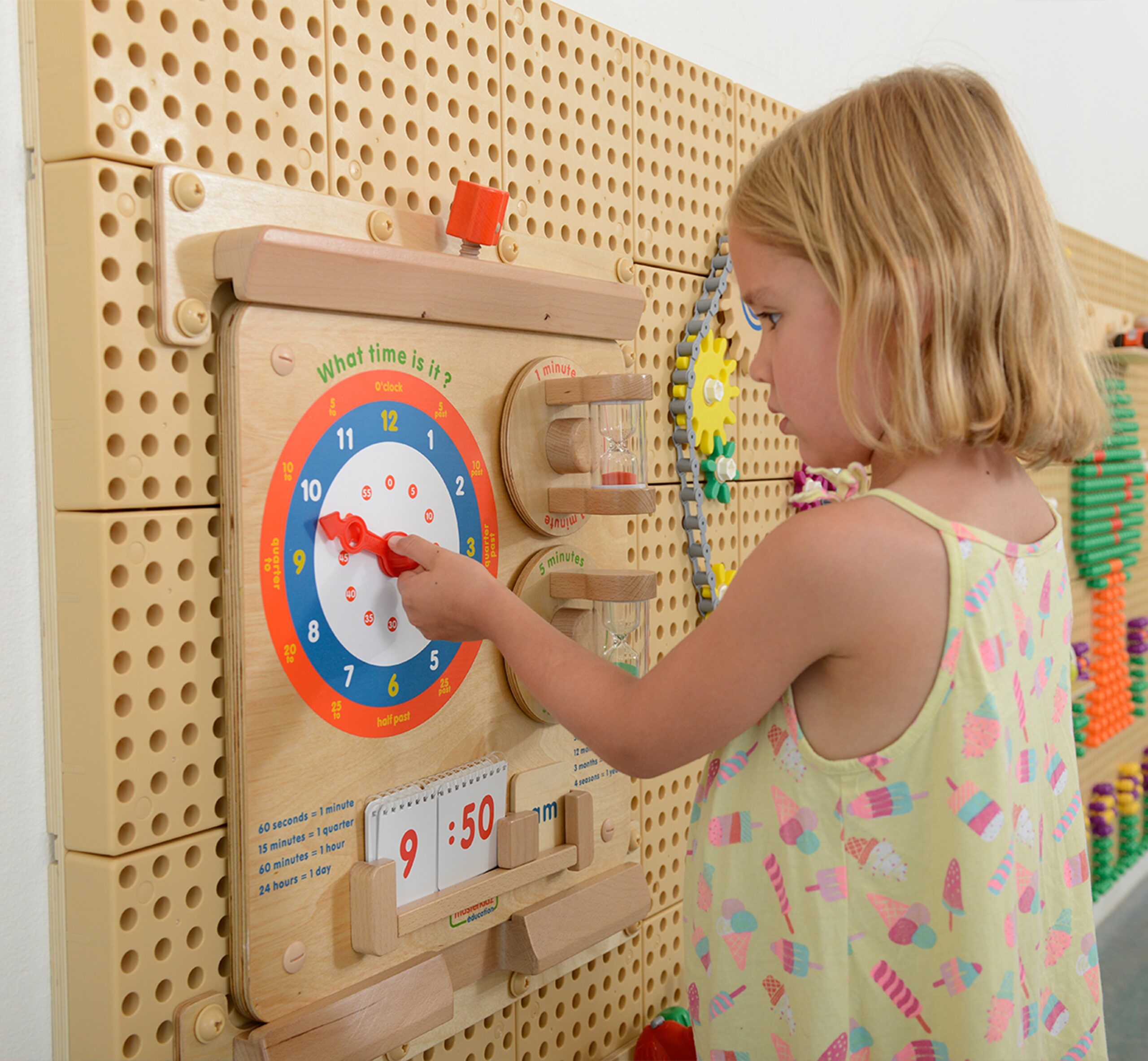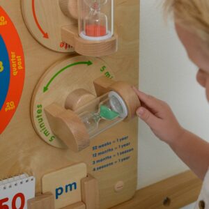 Fantastiline Masterkidzi õppetahvel, mida saab kinnitada otse seinale või Masterkidz Flex süsteemi – nii seinale kinnitatuna kui ka eraldiseisvana. Seda mänguasja kasutatakse klassikaliste kellade tundide lugemise õppimiseks. Tahvlil on kella sihver koos kätega, mida laps saab vabalt pöörata. Õpetaja saab tunde dikteerida ja laps peab seejärel seadma osutid nii, et kell näitaks dikteeritud aega. Laps saab mängida ka iseseisvalt kuna komplektis on märkmik erinevate kellaaegadega. Laps keerab lehti ja paneb paika kellaajad, mis seal on. Tahvel kirjeldab ka ajaühikute vahelisi seoseid – mitu sekundit on minutis, mitu minutit veerandtunnis, mitu minutit on tunnis, mitu tundi on päevas jne Tänu sellele teabele saab laps õppida palju kasulikku. Mänguasja teiseks elemendiks on kaks liivakella, tänu millele saab väikelaps aru, kui pikk on minut ja 5 minutit.