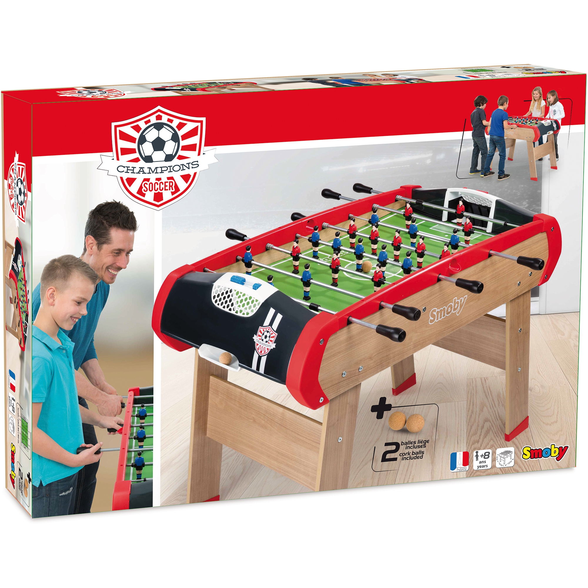 Large Champions lauajalgpall Prantsuse firmalt Smoby. Omadused: Jalgpallilaud, ergonoomiliste käepidemete ja torudega, millele mängijad asetatakse, punktide märgistamiseks mõeldud aabitsaga, kaasas kaks palli. 22 mängijat on paigutatud kaheksale mugavate käepidemetega juhikule – 11 igast meeskonnast järgmises koosseisus: 3, 5, 2, 1. Staadioni põrandal on veidi kõrgemad nurgad, tänu millele on pall lauajalgpalluritele alati käeulatuses. Mängus saab korraga osaleda 4 mängijat. Laud on valmistatud kvaliteetsetest materjalidest, see on massiivne ja stabiilne. Valmistatud Prantsusmaal. Isemonteeriv komplekt. 8 aastaks.