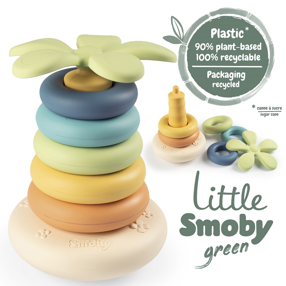 Little Smoby sari loodi kõige väiksematele lastele mõeldes. Siit leiate palju mänguasju – garaaže, sõiduteid, kööke ja väikseid mänguasju. Kõik on tehtud pastelsetes toonides. Need on laste poolt armastatud mänguasjad – täiesti uues versioonis. Keskkonnast hooliv Smoby tutvustab Green kollektsiooni – suhkruroost taimsest plastikust mänguasju. Tunnused: – pastellkomplekt koosneb 6 elemendist – 5 rõngast ja 1 palmilehekujuline klots, – laps asetab rõngad koonusele järjekorras suurimast väiksemani, lõpetades palmipuuga, – alusel on nööpnõel elementide kinnitamiseks, – mänguasi sobib suurepäraselt lastele, kes hakkavad kokku panema taimsetest plokkidest ja bioplastist valmistatud torne, -, arenevad motoorsed oskused, mis on valmistatud bioplastikust suhkur.