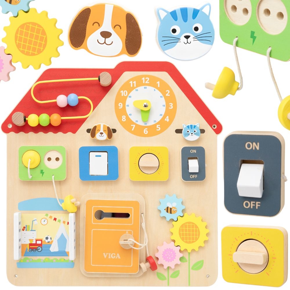 See armas värviline manipulatsioonitahvel ”House” kaubamärgilt Viga! on fantastiline mänguasi, mis äratab teie lapses koheselt uudishimu ja julgustab aktiivset, sõltuvust tekitavat mängu! Läbimõeldud majakujuline disain sisaldab koguni 8 interaktiivset elementi, mis pakuvad pikki tunde loomingulist tegevust. Avatavad uksed, liugurid, liikuvad käigud ja helmeste labürint – need on vaid mõned motoorseid arengut ja koordinatsiooni toetavad atraktsioonid. Plaati saab hõlpsasti seinale kinnitada või lauale asetada, mis teeb selle äärmiselt praktiliseks ja universaalseks. See on ideaalne kingitus beebidele alates 18. elukuust, tagades õppimise läbi lõbu! Omadused: – Mänguasi alates 18. elukuust – Saab kinnitada seinale või asetada lauale. – Majakujuline mänguasi, mis tõmbab tähelepanu ja julgustab avastama. – Vastupidav ja ohutu konstruktsioon. Komplekti kuulub: – 8 interaktiivset elementi: – Helmeste labürint (liuguriga) – Liugur: Lihtne liugmehhanism. – Kell: aitab õppida aja mõistet. – Hammasrattad (3 tk.): Liigutatav pööramismehhanism – Lülitid/nupud – Avatavad luugid – Võtmelukuga uksed – Pistikupesa (pistikuga) Mänguasi arendab: – Peenmotoorikat – Silma-käe koordinatsiooni – Loogilist mõtlemist. – Ajataju – Vaatlusvõime – Uudishimu ja aktiivsus