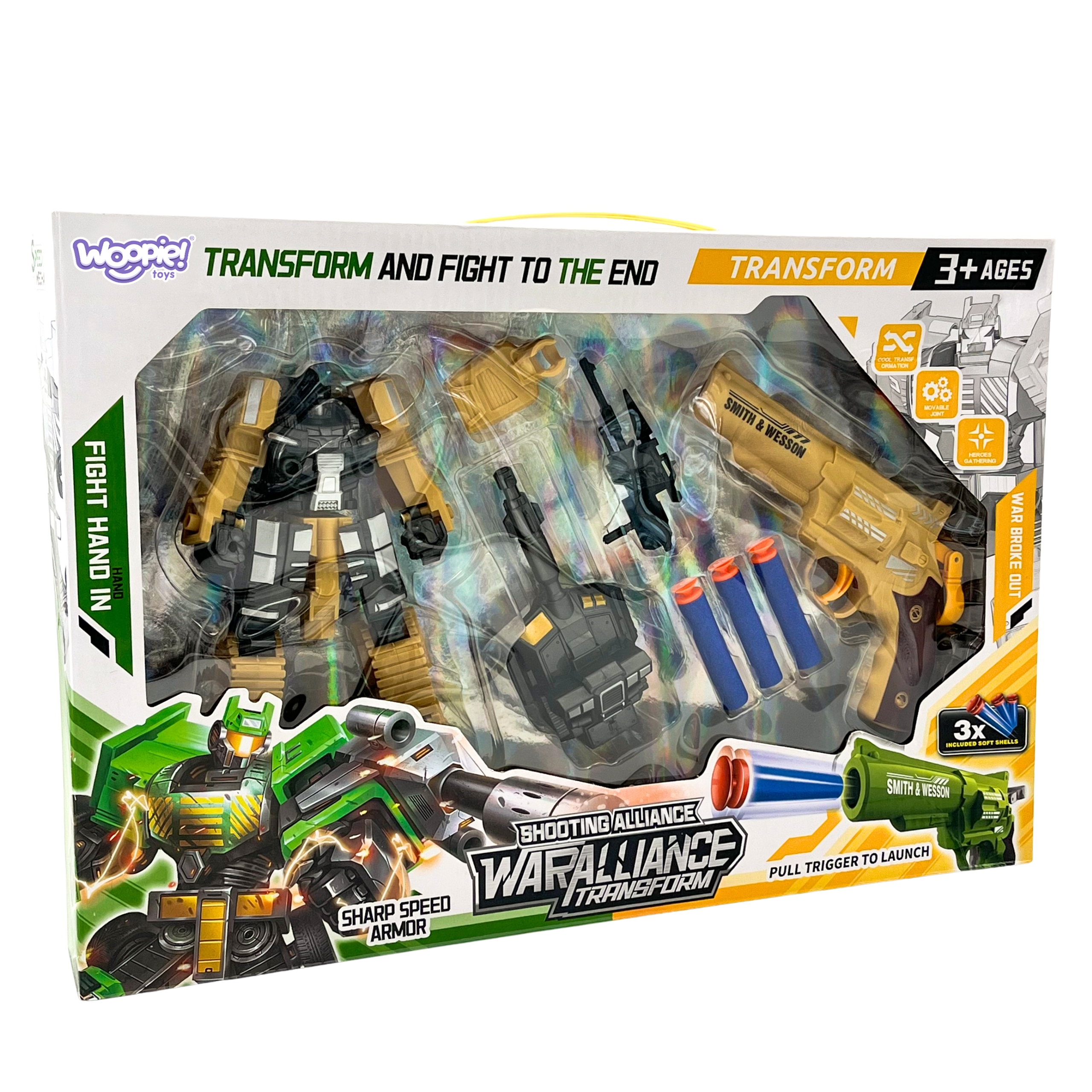 Pange end Woopie lahingurobotiga põneva tegevuse keskele! See dünaamiline komplekt on ideaalne pakkumine väikestele strateegidele ja kosmoselahingute austajatele. See sisaldab võimsat robotit, mis muundub kergesti lahingumasinaks, ja ohutute kuulidega revolvrit, mis on valmis koheseks võitluseks. Olge valmis lugematuteks tundideks loominguliseks lõbutsemiseks, mängides rollilahinguid ja arendades oma strateegilisi oskusi. On aeg muutuda ja võidelda lõpuni! Omadused: – Lastele alates 3. eluaastast – Robotil on võime transformeeruda – Sisaldab elemente lahingustsenaariumide mängimiseks – Revolver – Komplekti elemendid on kaasaegse võitlusliku välimusega. Komplekti kuulub: – 1 x Transformeeriv robot – 1 x Revolver – 3 x Pehmed kuulid revolvri jaoks – Täiendavad lahingutarvikud (nt väiksem relv, robotile paigaldatud element). Mänguasi arendab: – loovust ja kujutlusvõimet – käelisi oskusi – loogilist mõtlemist – sotsiaalseid oskusi – põhjuse ja tagajärje mõistmist.