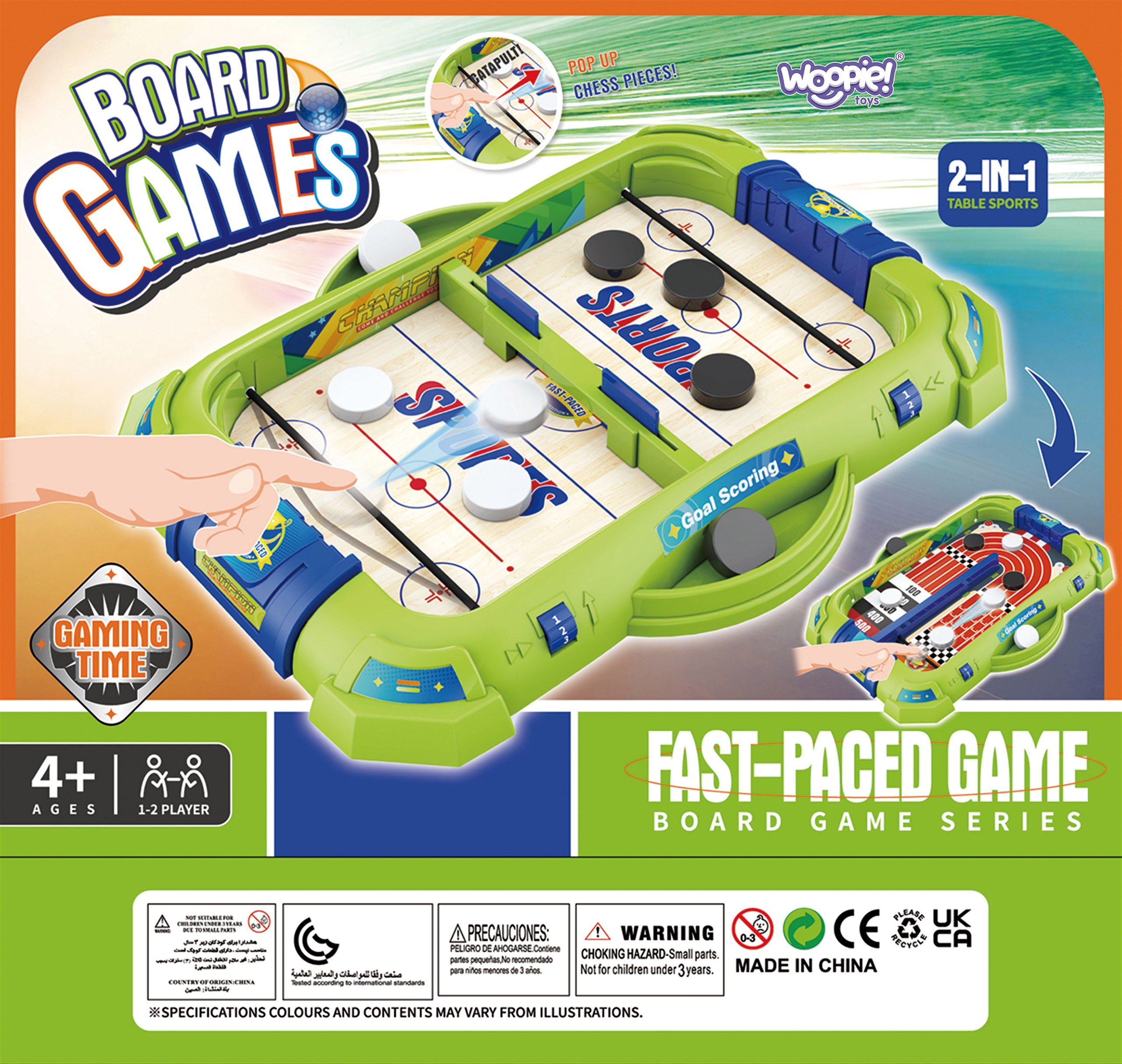 Brändi WOOPIE 2-in-1 arkaadmäng on uuenduslik mäng, mis ühendab kaks distsipliini: minihoki ja pinball. Mõlemad minimängud mõjutavad positiivselt lapse arengut, ergutavad kujutlusvõimet, strateegilist mõtlemist ja planeerimist. See on suurepärane lõbu kogu perele ja iseseisvaks mängimiseks. Tänu oma ainulaadsele ja värvikale disainile tõmbab see mäng kohe väikese lapse tähelepanu, pakkudes garanteeritud meelelahutust pikaks ajaks! Omadused: – Mänguasi vanusele 4 ja vanematele – Isetegija mäng – panete lauad ise kokku! – 2 mängu ühel laual – Arendab keskendumisvõimet, loogilist mõtlemist ja käelisi oskusi Minihoki Litterite laskmiseks on mõlemale lauapoolele venitatud kummipaelad. Keskel on sein, väikese avaga mängu alustamiseks. Külgedel on kaks riiulit, kuhu saab panna võidukettad. Iga mängija saab 3 etturit – nüüd lihtsalt siruta kummipaela koos etturiga ja tulista vastase väljakule! Mängu eesmärk – nagu hokiski – on lüüa rohkem väravaid kui vastane. Mängija, kes lööb vähem kordi väljaku vastaskülje väravat, kaotab. 2. Pinball – võidusõit Kõige ainulaadsem peremäng igas vanuses. Toetage oma lapse arengut ja nautige koos! Kummi sobivalt venitades lasevad mängijad oma litrit nii, et see jõuaks väljakule võimalikult paljude punktidega. Osalejatel on 3 katset – nii palju plaate igaüks saab. Võidab see, kellel on kõige rohkem punkte! Lisaks sellele, et mänguasi avaldab soodsat mõju lapse keskendumisvõimele, kinnistab see ka matemaatilisi tehteid, lisades sellele järgnevaid mängu käigus saadud punkte.