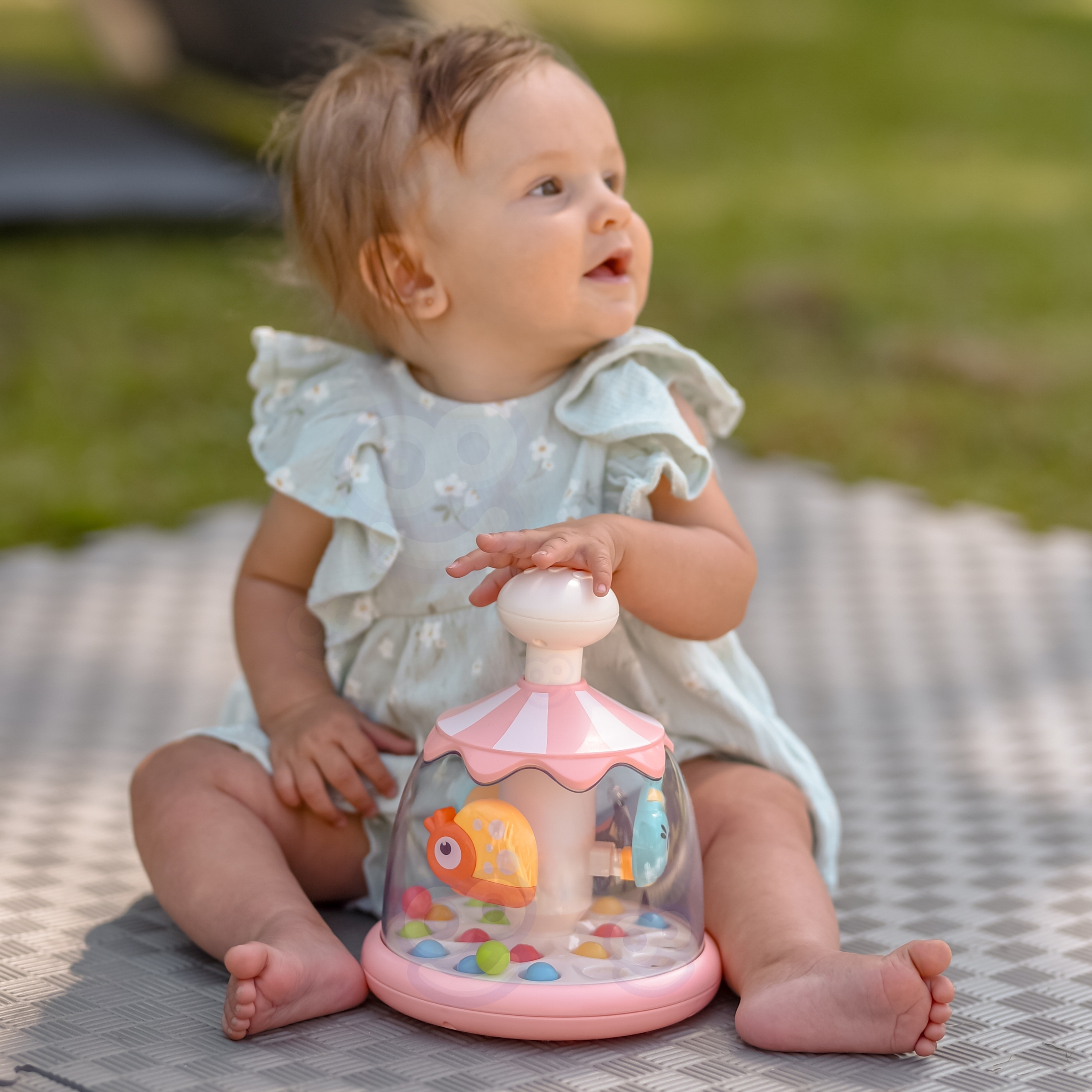 Woopie Baby värvikas interaktiivne pallidega keerutav tigu / mobiiltelefon on imearmas mänguasi umbes 6 kuu vanustele beebidele. Pärast nupule vajutamist hakkavad loomad tiirlema ​​ja vurrja sees olevad värvilised pallid põrgatavad, jättes mulje minikarussellist. Tänu sellele jälgib laps liikumist, kuuleb helisid ning tegeleb silmade ja kätega. Mänguasi on valmistatud turvalisest, vastupidavast materjalist, kohandatud lapse vanusele ja seda on lihtne kasutada. See on ideaalne kingiidee! Omadused: – Ealine kasutus: alates 6. elukuust – Värvid: erksad, pastelsed värvid loomamotiiviga – Interaktiivne funktsioon: pärast nupule vajutamist – pallide liikumine ja hüppamine – Toime: kaasab nägemist ja kuulmist, liikuvaid elemente Mänguasi arendab: – Nägemist – Kuulmise arendamist – Käe-silma koordinatsiooni – Käelised suhted / peenmotoorika ja motoorika mõju all