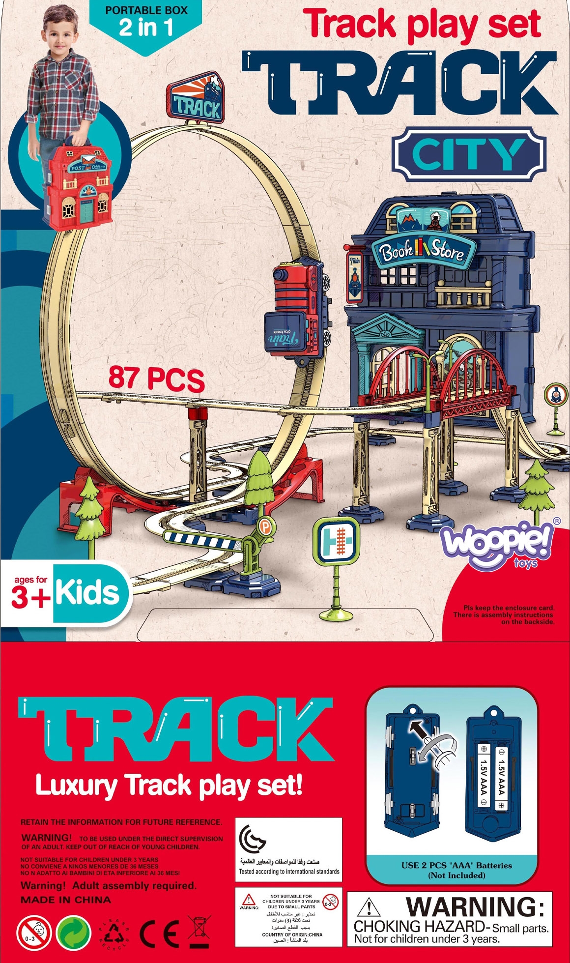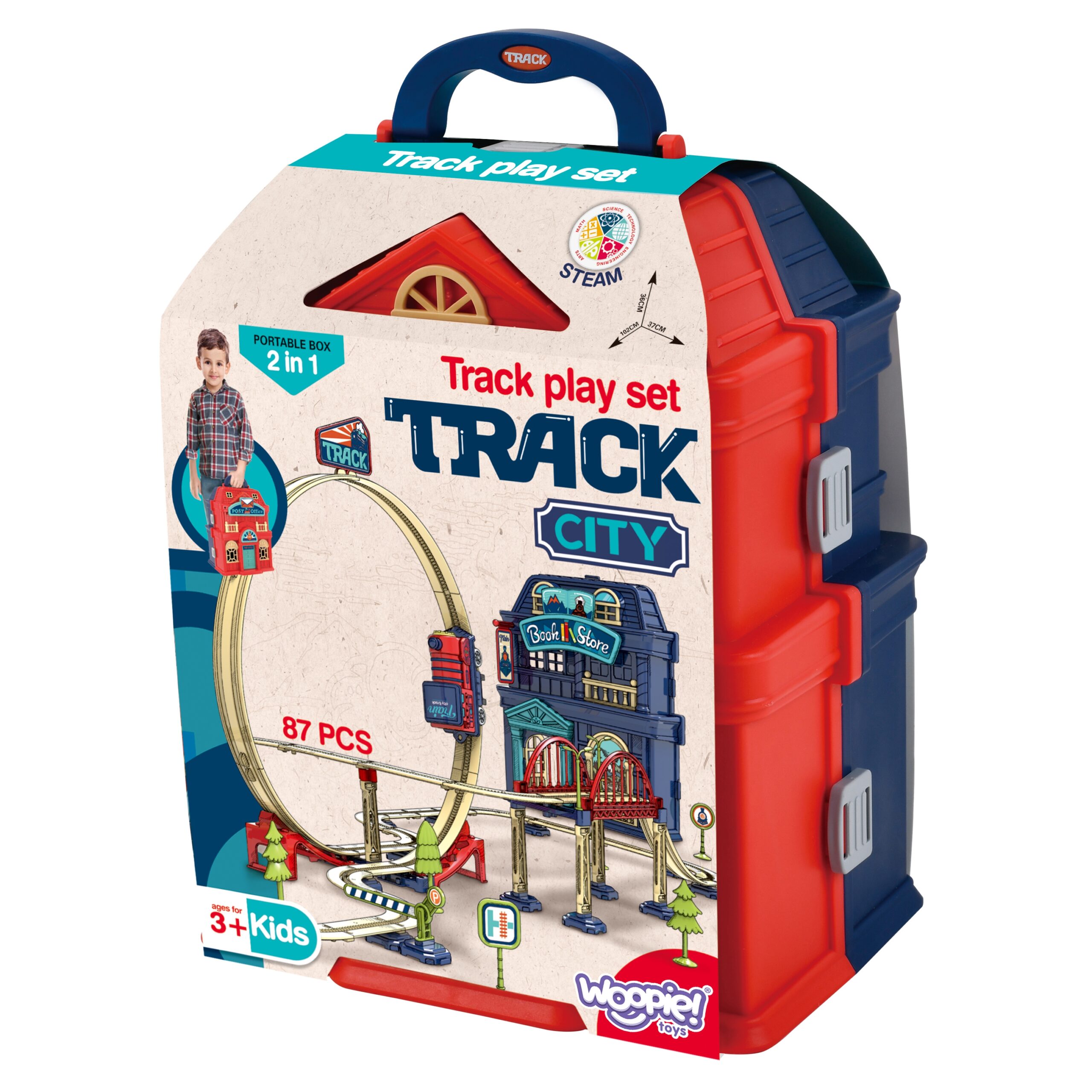 Brändi Woopie kohvriks kokkupandav 2-ühes elektrirong on ideaalne pakkumine väikestele loomingulise mängu austajatele. Komplekti kuuluvad rajad kogupikkusega 3,5 m koos aasa, viadukti ja tõkkepuuga, mis annab palju võimalusi lõbutsemiseks. Heliefektidega vedur muudab melu veelgi atraktiivsemaks (AAA patareid ei kuulu komplekti). Kohver toimib praktilise pakendi ja raja elemendina, luues kaks hoonet. Mänguasi on mõeldud üle 3-aastastele lastele ja on ohutu. Omadused: – Mänguasi lastele alates 3. eluaastast – Radade kogupikkus on kuni 3,5 m! – Arvukalt tarvikuid – Rööbastee silmuse, viadukti ja tõkkepuuga – Veduri heliefektid – Kohver raja osana – Valmistatud ohututest materjalidest – Vajab AAA patareisid (ei kuulu komplekti) Komplekti kuulub: – Raudtee tee – Silmus – Viadukt – Tõkkepuu – Vedur – Kohver, mis loob kaks hoonet