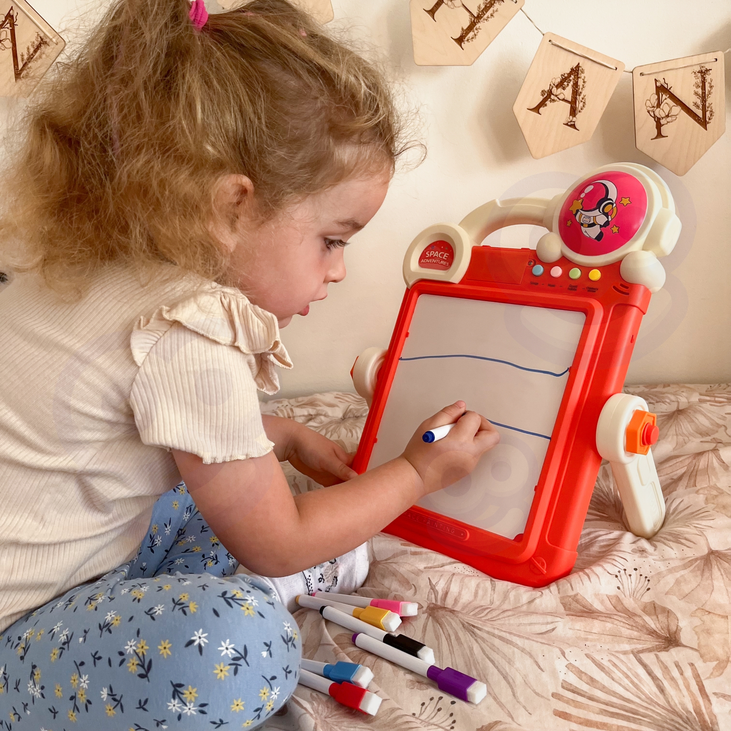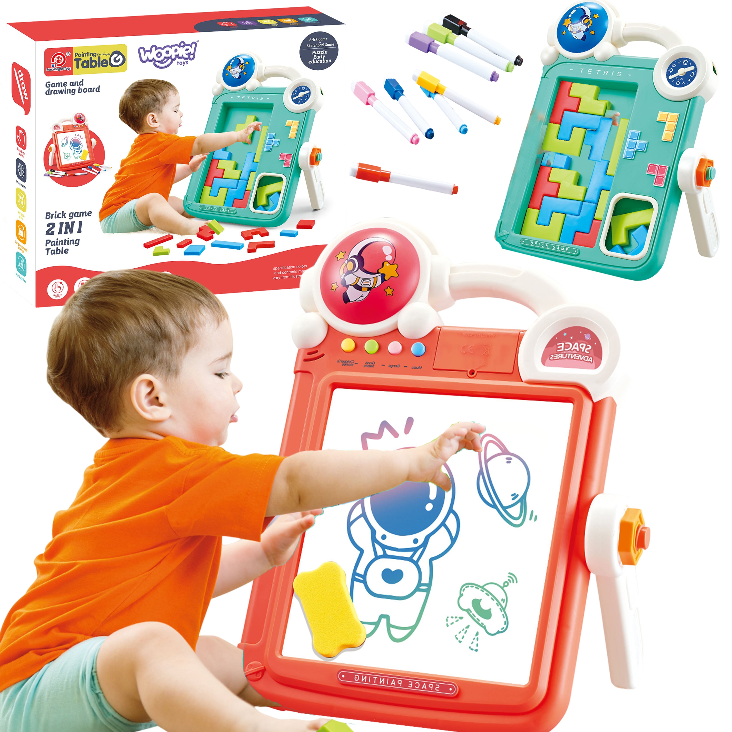 Kas otsite mänguasja, mis mitte ainult ei paku meelelahutust, vaid ka õpetab? See on ainulaadne 2-in-1 õppetahvel WOOPIE – laste loomingulise mängukeskuse poolt. Mänguasi ühendab endas värviliste markeritega joonistamiseks mõeldud tahvli ja Tetris-tüüpi klotside paigutamise tahvli funktsioonid. Joonistuslaual on 8 markerit, kustutuskumm ja 18 kahepoolset kustutatavat kaarti värvimiseks või kirjutamiseks. Tahvli teisel poolel on naljakas Tetrise pusle, mis pakub huvi igale lapsele ning arendab tema kujutlusvõimet ja loovat mõtlemist. Värvilisi plokke saab laduda vertikaalselt või tasaseks, et luua huvitavaid kujundeid ja pilte või eraldada 3D-hooneid. Meeleolu lisab 4 sisseehitatud muusikanuppu. Sarnane kell korpusel aitab teil õppida kellaaega näitama. Tunnused: – Tahvel lastele alates 3. eluaastast – 2 in 1 mänguasi, joonistuslaud ja Tetrise mäng – Stabiilne konstruktsioon jalgade ja käepidemega – Sisseehitatud nupud koos helidega (muusika, laulud, head harjumused, muinasjutud) – Sisseehitatud kellasint liikuvate osutitega – Vajalik on 2 AA patareid. Komplekti kuulub: – Kahepoolne tahvel (plokkide joonistamiseks ja paigutamiseks) – 8 värvilist kuivkustutusmarkerit – Svamm joonistuste kustutamiseks – Värviliste klotside komplekt (Tetris) – 18 kahepoolset kustutatavat kaarti – Kell tundide õppimiseks Mänguasi arendab: – peenmotoorikat – käe-silma koordinatsiooni – loogilist mõtlemist
