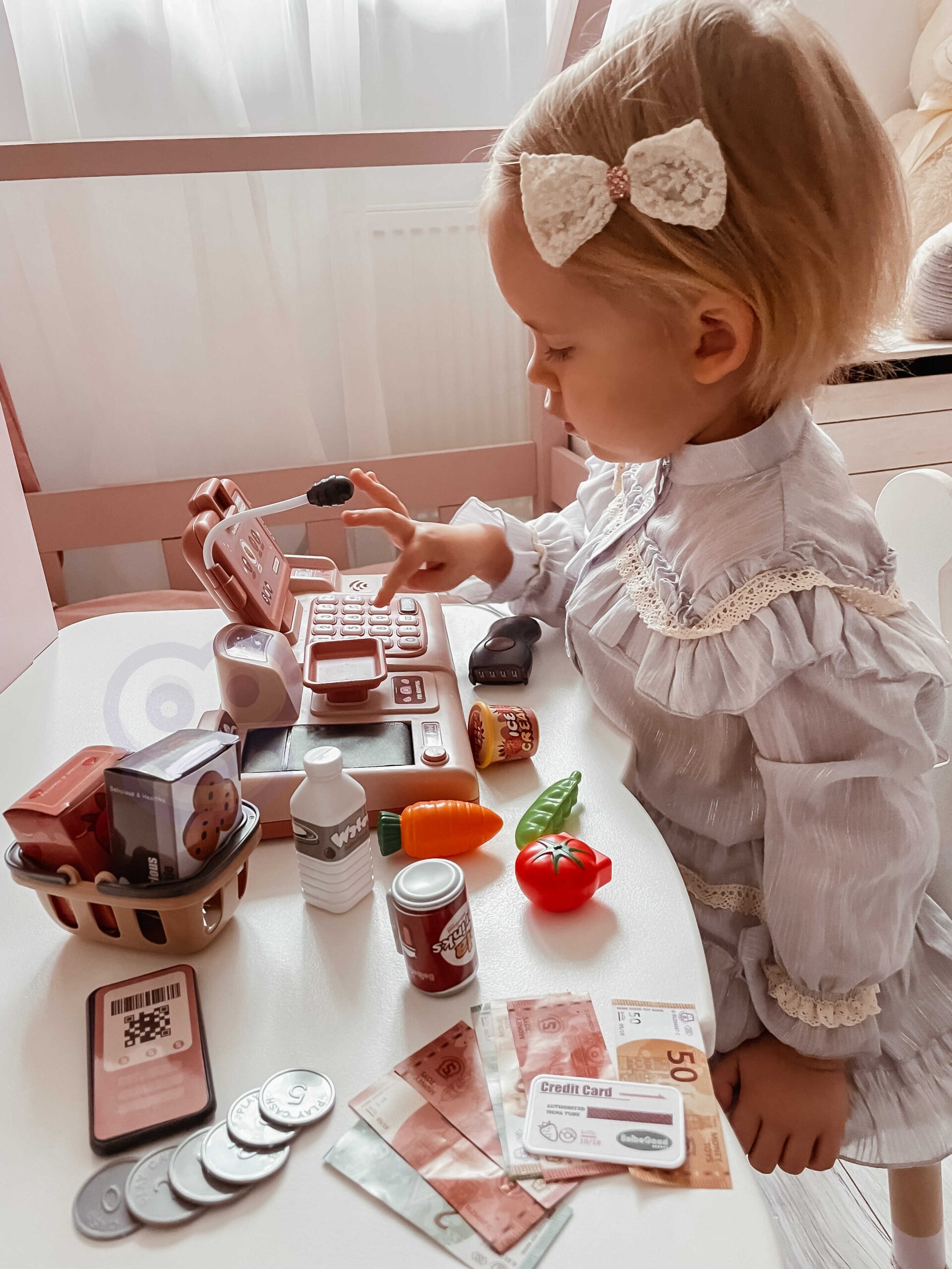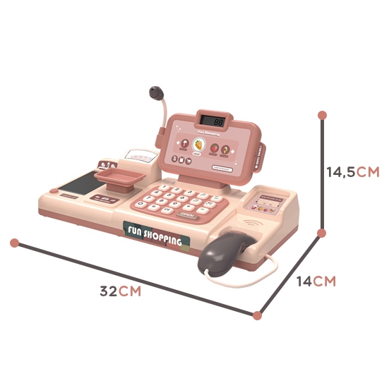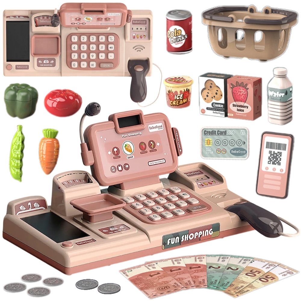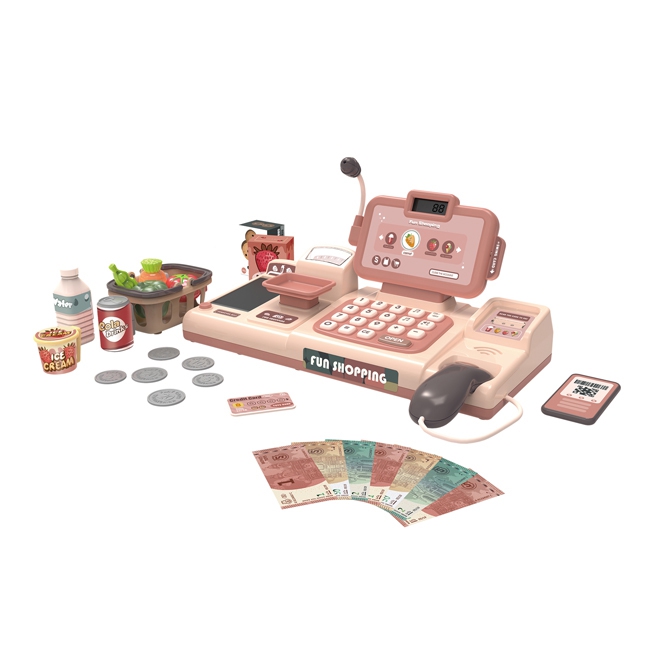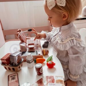 WOOPIE kassaaparaat on interaktiivne mänguasi, mis viib lapsed ostlemise ja kaubanduse maailma. See sisaldab koguni 25 lisatarvikut, sealhulgas skanner, kaal, mikrofon ja makseterminal, mis võimaldab realistlikku poes mängimist. Tänu heli- ja valgusfunktsioonidele saavad lapsed tunda end tõeliste kassapidajatena. Sobib suurepäraselt lastele alates 3. eluaastast, arendab sotsiaalseid ja kognitiivseid oskusi läbi rollimängude. See on suurepärane viis loendamise, toodete äratundmise ja raha haldamise õppimiseks. Omadused: – Mänguasi, mis on mõeldud lastele alates 3. eluaastast – Valmistatud kvaliteetsetest materjalidest, lastele ohutu – Koguni 25 tarvikut – Kassa töötab 3 AA patareiga (ei kuulu komplekti) – LCD ekraan Komplekti kuulub: – Ekraaniga kassaaparaat – Heli ja valgusega teisaldatav skanner – Elektrooniline kaal – Ostukaart ja terminal kunstlike pangakaartide väljakuulutamiseks – Krediitkaardi reklaam Mängutarbed: puuvili, juurviljad, joogid, jäätis, küpsised – Mobiiltelefon kassapidajale Mänguasi arendab: – matemaatilisi ja loendamisoskusi – käe-silma koordinatsiooni – kujutlusvõimet ja loovust – sotsiaalseid oskusi grupimängu kaudu – vastutustunnet ja organiseeritust Interaktiivsed funktsioonid: – Lülitage kassa sisse, kasutades nuppu ”sisse/välja” Sõber kuuleme seda toimingut skanneris kuulme fraasi ”Skanner” inglise keel. – Skänner suudab skaneerida ainult komplekti kuuluvaid tooteid ja see tekitab iseloomuliku skaneerimisheli (skanneri nupule vajutamine ilma tooteta aktiveerib heli/lause ”Hi Little Friend…” – Kassa töötab nagu kalkulaator – ütleb valjult inglise keeles konkreetse toimingu, nt 1+2=3 – Sellel on kaks noodiga nuppu, millest üks helin B lülitab sisse klassikalise laulu kaardi. ”terminali” lähedal, kaarti libistades aktiveeritakse ingliskeelne lause ”Hi Little Friend…” – Kui kassa on sisse lülitatud, saab kasutada mikrofoni, mis töötab nagu tavamikrofon – Kassa kõrval olev nupp aktiveerib selle, st liigutab seda – ”OPEN” nupp avab selle kohal olevat indikaatorit.