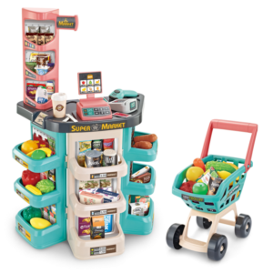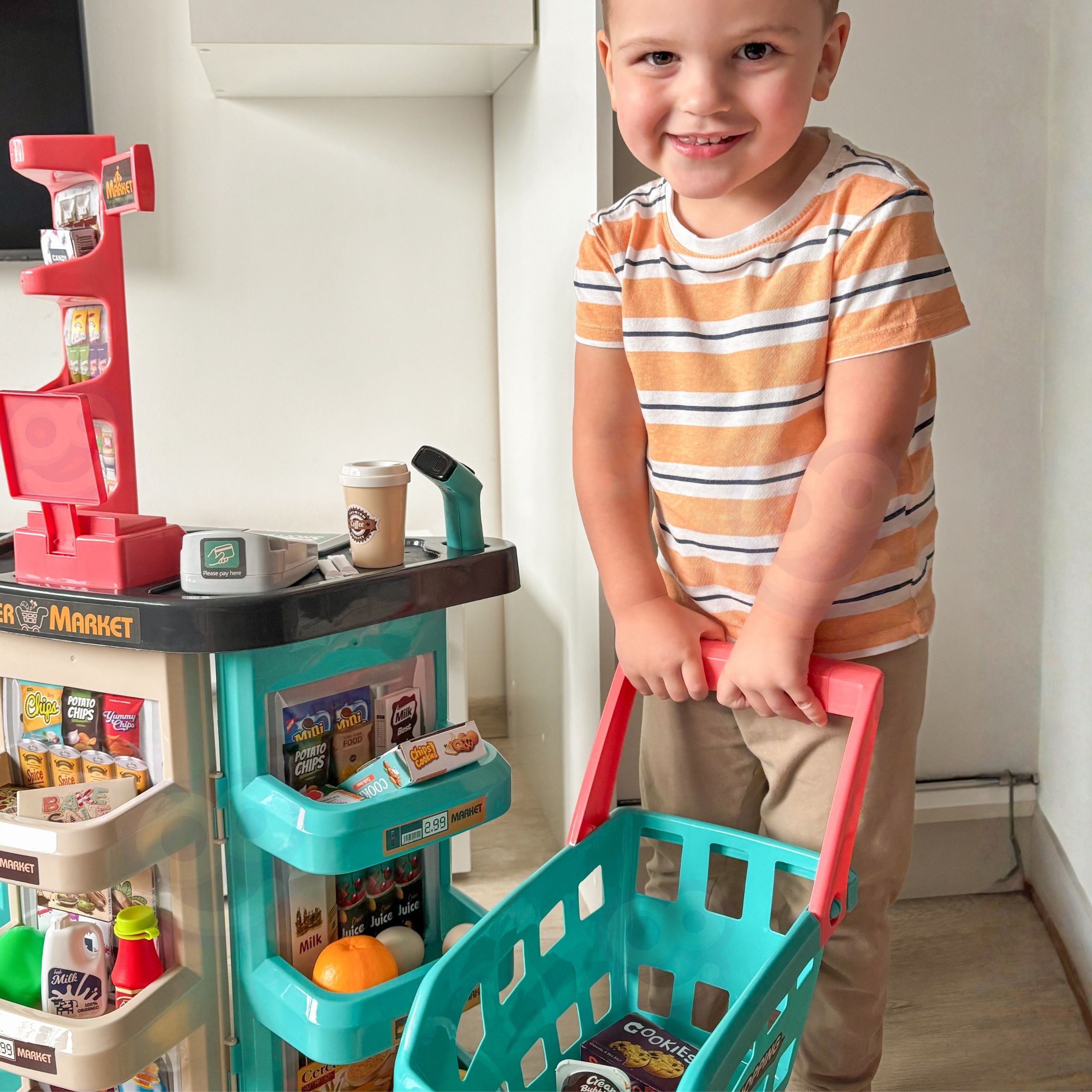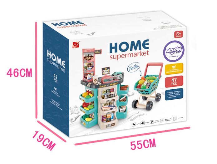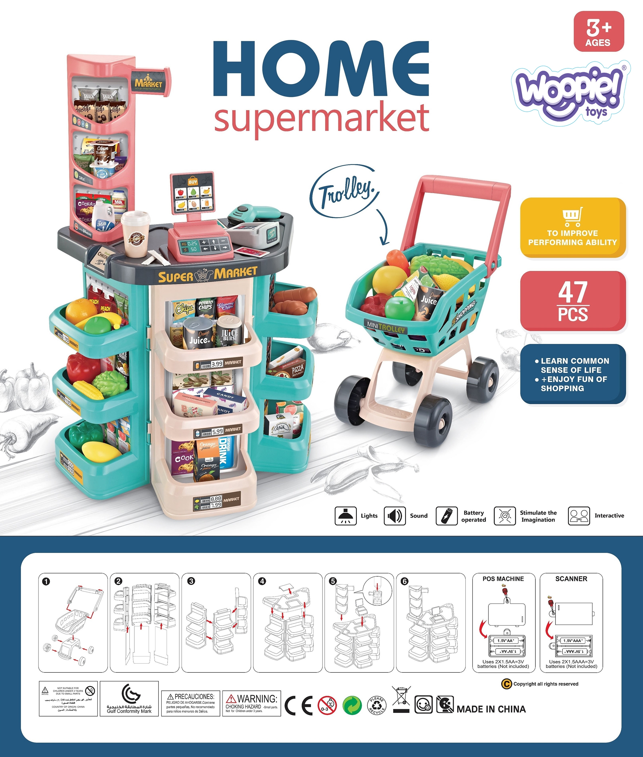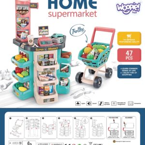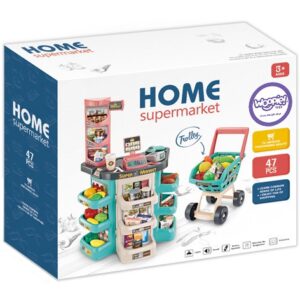 Usaldusväärse Woopie kaubamärgi 47 tarvikuga ostukäruga supermarket on ideaalne pakkumine üle 3-aastastele lastele. Lastele meeldib oma vanemaid jäljendada, seega on see komplekt teie lapsele ideaalne. Rollimäng arendab suuresti lapse kujutlusvõimet ja loovust. Komplektis on kõik vajalikud elemendid väikemüüja töökoha sisustamiseks, sh: kassa koos kaaluga, skanner ja maksekaardilugeja. Kaasasolev ostukorvi võimaldab sõpradega lõbutseda olenemata sellest, kus ja millal ning teie laps teab alati, kuidas supermarketis käituda! Omadused: – punaselt helendav ja iseloomulikku häält tegev skanner, – maksekaardilugeja, mis väljastab heli koos helendava lambiga, – kassaaparaat imiteerib täiuslikult ehtsat, – alus on varustatud riiulitega hinnaga toodete jaoks, – suurepäraselt reprodutseeritud toidukaubad, – esteetilised ja vaoshoitud värvid muudavad selle sobitumiseks igasse interjööri, – maapinnast kuni 5 kinkekarbi letti – 4 poodi. cm. Komplektis on 47 tarvikut: – supermarket, – ostukorv, – poekaal, – vöötkoodilugeja, – krediitkaardilugeja + krediitkaart, – paberraha, – mündid, – toidukaubad (puuviljad, juurviljad, joogid, piimatooted jne). Mänguasi arendab: – kujutlusvõimet ja loovust – sotsiaalseid oskusi – kognitiivseid oskusi – peenmotoorikat