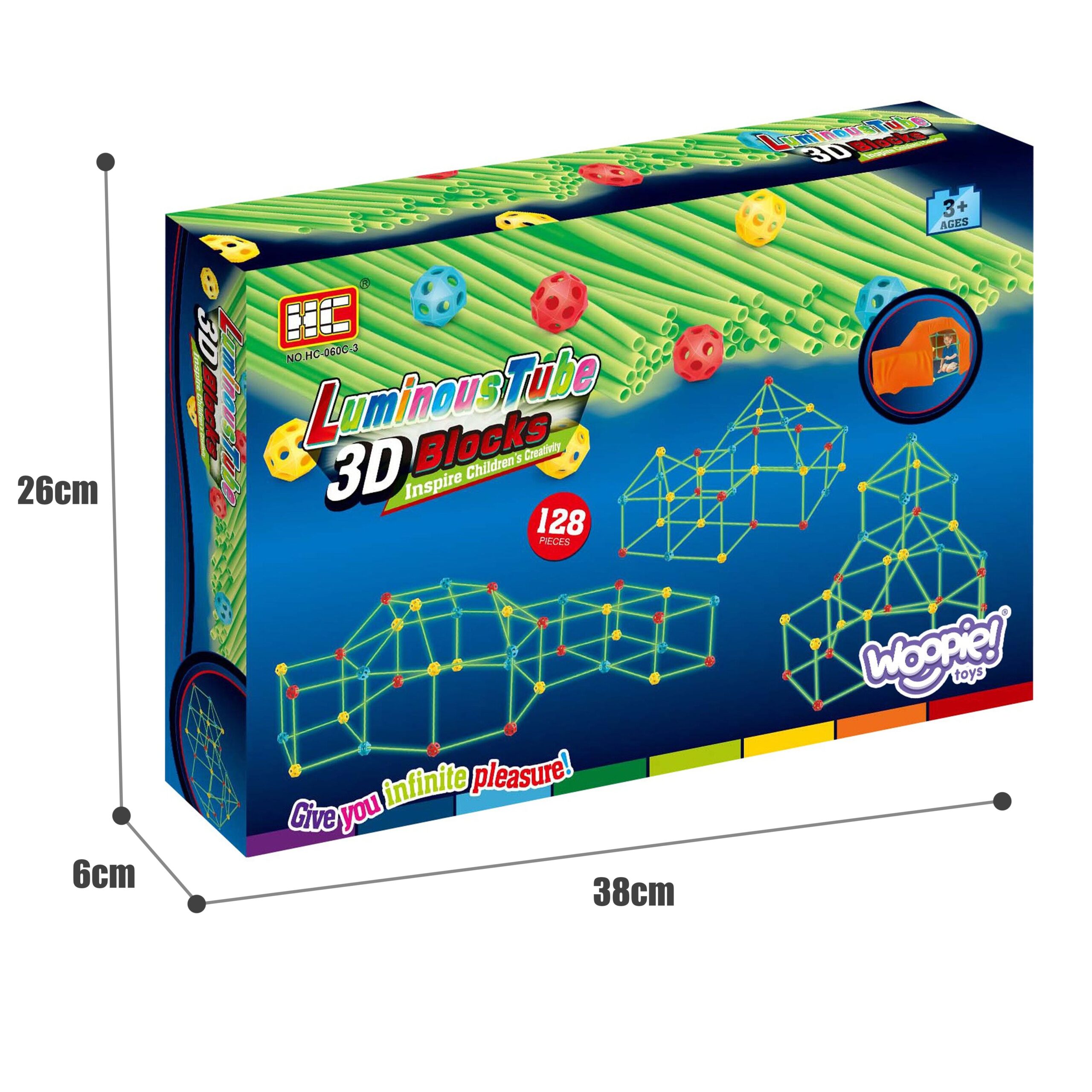 PAKKUMINE ON 3 SUURELE EHITUSPLOKKILE. WOOPIE kaubamärgi ehituskomplekt äratab teie lapses suurepärase konstruktori! Komplekt sisaldab 128 elementi, sealhulgas toruliitmikud ja materjali konstruktsiooni katmiseks. Elemendid võimaldavad ühendada need ruumiliseks struktuuriks nagu telk, mis on kaetud materjaliga. Komplekt helendab pimedas, mis võimaldab loominguliselt lõbutseda kodus ja õues. Omadused: – mänguasi vanuses 3 ja vanemad, – komplekt sisaldab 128 elementi, – võimaldab ehitada ruumilise struktuuri, nt. telk, – saab ehitada sise- ja välistingimustesse, – helendab pimedas. Komplekti kuulub: – materjal konstruktsiooni katmiseks, – 80 x torud/kõrred, – 48 x ühendusdetailid. PAKKUMINE ON 3 SUURELE EHITUSPLOKKILE