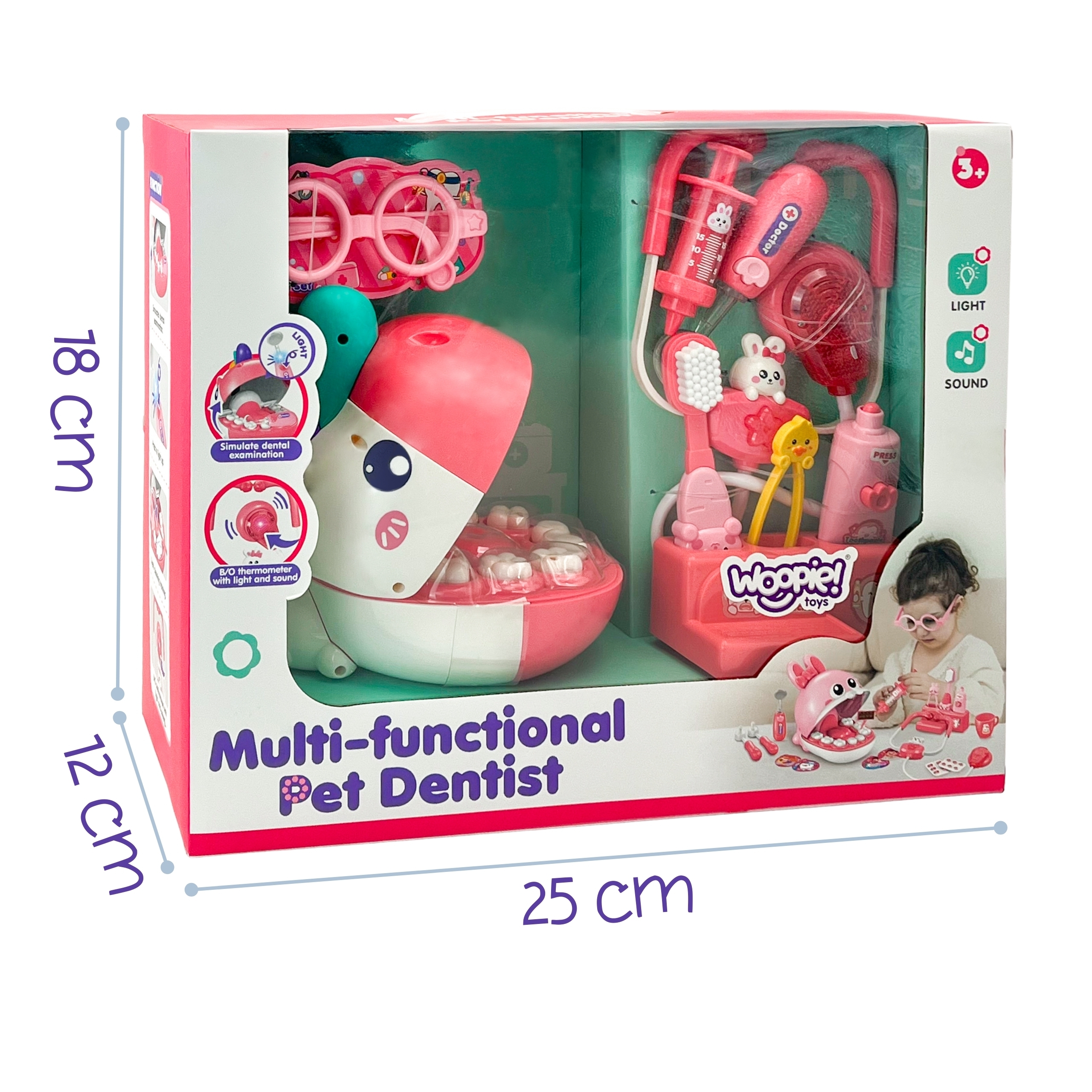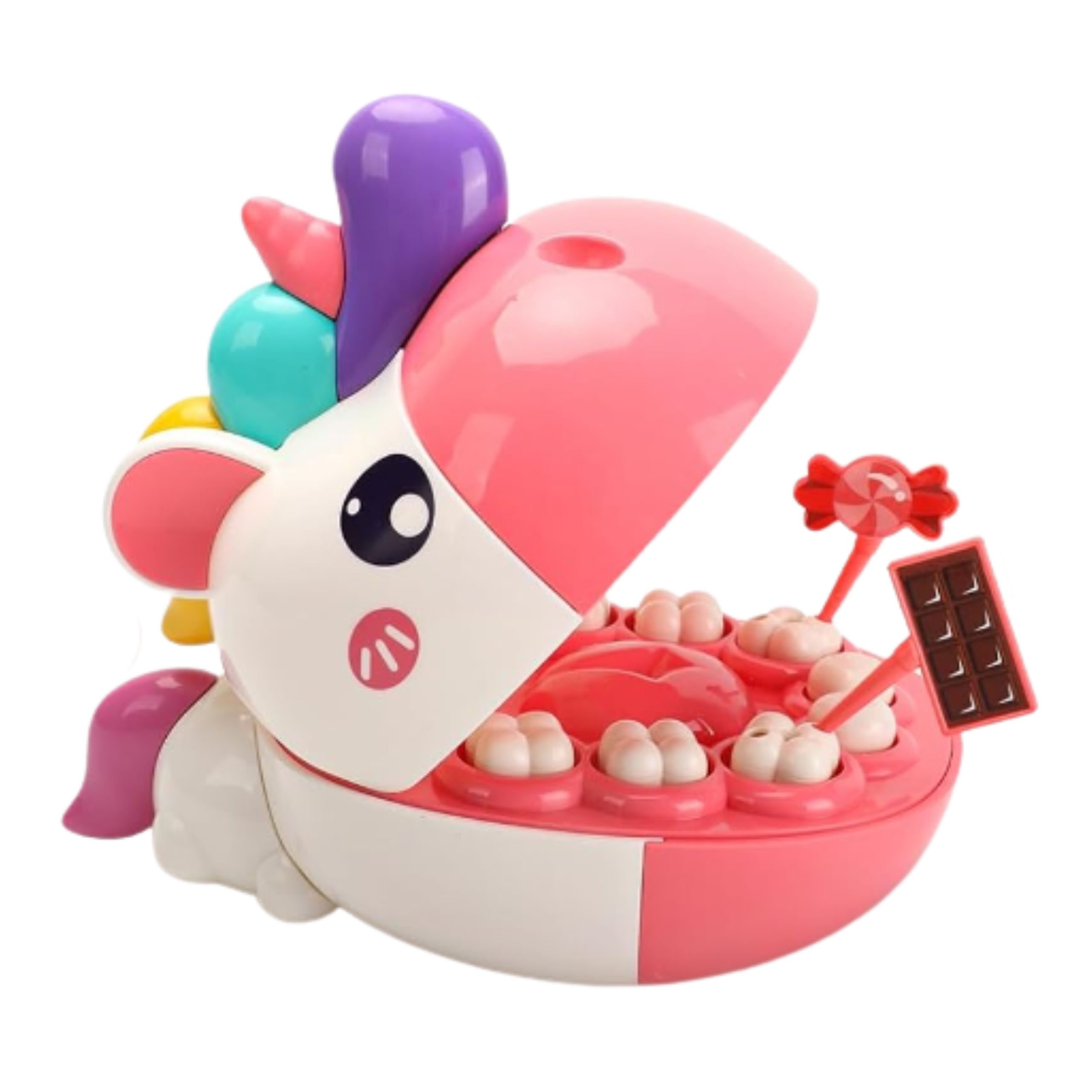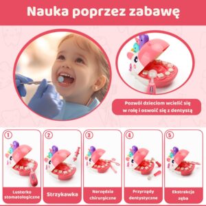 Väike ükssarvikupea hambaarstikomplekt on ainulaadne hariv mänguasi, mis tutvustab lastele rõõmu ja fantaasiaküllasel viisil meditsiini ja suutervishoiu maailma. Tänu sellele komplektile saab teie väikelaps mängida väikese hambaarsti rolli, teha analüüse, ravida patsiendi hambaid ja õppida hügieeni põhitõdesid lõbusal ja turvalisel viisil. Hammaste realistlik kuju ja värvilise ükssarviku sõbralik välimus panevad lapse iga mängu elementi huviga avastama. Avanev suu koos hammaste komplektiga võimaldab simuleerida tõelist hambaarsti kontrolli – väikelaps saab sisse vaadata, tööriistu kasutada ja ”ravi” teha. Komplektis on kõik väikese hambaravikliiniku jaoks vajalik: peegel, tangid, süstal, hambahari, valgus- ja heliefektidega stetoskoop. Laps saab täita arsti, patsiendi või abilise rolli – tänu sellele muutub mäng dünaamiliseks, kaasahaaravaks ja emotsiooniderohkeks. Komplekt on mõeldud mitte ainult meelelahutuseks, vaid ka õpetamiseks. Laps saab teada, milline on suuõõne ehitus, miks on hammaste pesemine nii oluline ja kuidas vältida kaariese tekkimist. Mänguasi aitab taltsutada ka hirmu hambaarsti külastamise ees, muutes järgnevad kohtumised tõelise arstiga rahulikumaks. Kõik elemendid on valmistatud vastupidavatest, lastele ohututest materjalidest ja siledate ümarate servadega. Kogu asi on kaunistatud esteetilistes pastelsetes toonides, mis tõmbavad tähelepanu ja julgustavad mängima. Komplekt on detailirohke ja võimaldab teie lapsel tunda end tõelise hambaarstina. Kõik elemendid on kerged, väikeste kätega hõlpsasti haaratavad ja hoolikalt kohandatud vastavalt lapse vanusele. Sobib suurepäraselt nii koju kui ka lasteaeda õppevahendiks. Omadused: – Mänguasi lastele alates 3. eluaastast – Võimaldab simuleerida tõelist hambauuringut – suu avanemine ja realistlikud hambad – Komplektis on hambapasta imitatsiooniga hambaravipunkt, hambahari ja tass – Sisaldab helendavaid ja heli tekitavaid elemente – nt. tööriist ja stetoskoop, mis suurendavad mängu realistlikkust – Rikkalik tööriistade komplekt: peegel, puur, tangid, süstal, pintsetid – kohandatud väikestele kätele – Aitab taltsutada hirmu hambaarsti külastamise ees ja õpetab hambaravi ennetamise põhitõdesid – Valmistatud turvalisest, mittetoksilisest plastikust, sileda pinnaga, pastelsete värvidega komplekt sisaldab: – Esteetilist värvi. Avaneva suuga ükssarvik ja hammaste komplekt uurimiseks – Hambaravijaam imitatsiooniga hambapasta, hambaharja ja loomafiguuridega – Valgus- ja helifunktsiooniga stetoskoop – Professionaalsete hambaravivahendite komplekt: peegel, süstal, tangid, puur ja pintsetid – Tass – Prillid väikesele arstile – Loomingulisus – Rollimäng – Ravim – Pudeli loomine oskused – käelised oskused ja liigutuste täpsus – terviseteadlikkus ja teadmised suuhügieenist – empaatiavõime ja teistest hoolimine – kannatlikkus ja keskendumisvõime