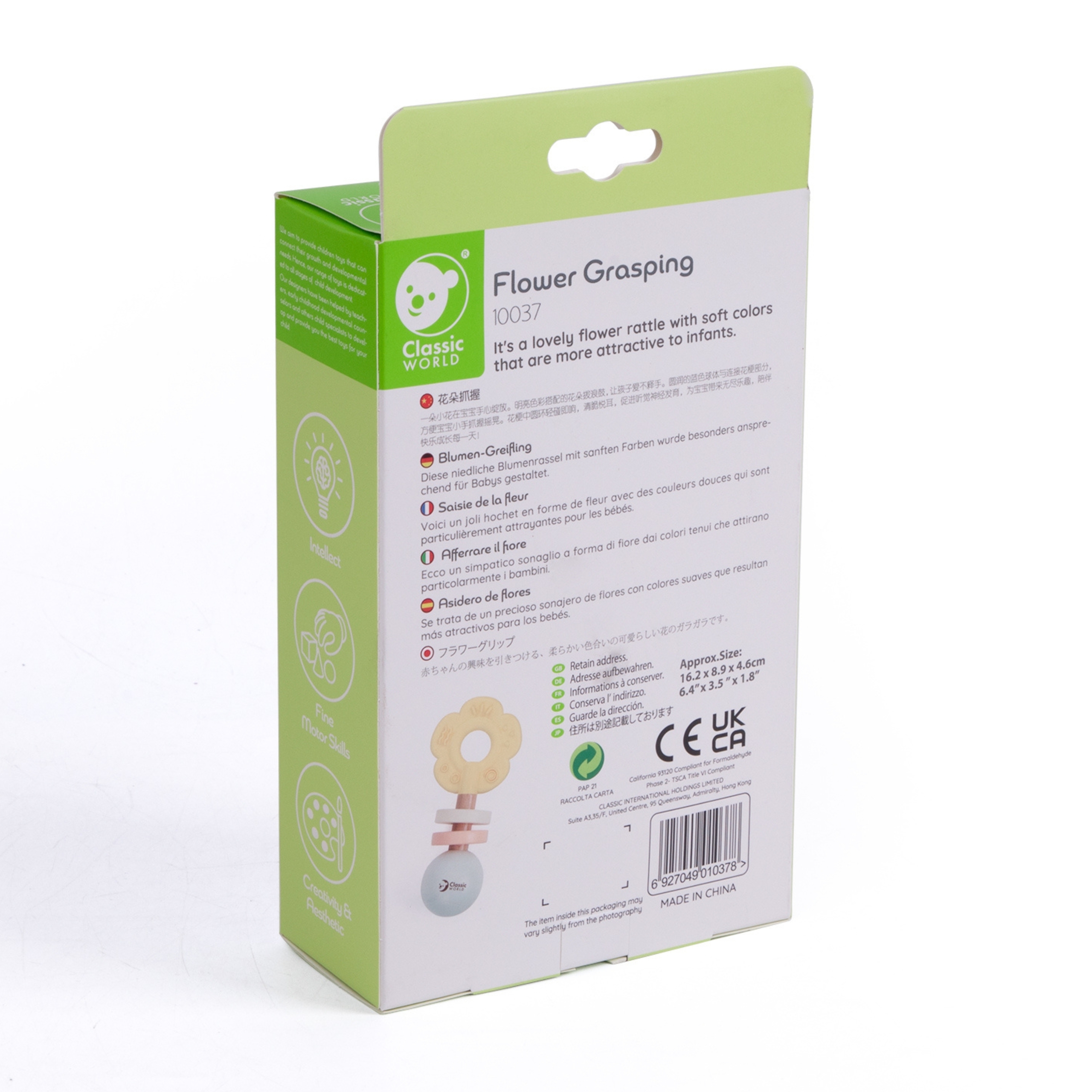 Võluv lillekujuline kõrist sai disainitud just kõige pisematele lastele. Õrnad, pastelsed värvid köidavad beebi tähelepanu ning meeldivalt puudutatav pind ja sobiv suurus muudavad selle haaramise ja raputamise lihtsaks. Mänguasi on valmistatud ohututest materjalidest – puidust ja silikoonist –, mistõttu sobib see lastele alates esimestest elupäevadest. Omadused: – Lastele alates esimesest elupäevast – Ergonoomiline väikestele kätele kohandatud kuju – Valmistatud vastupidavast puidust ja turvalisest silikoonist – Pastelsed värvid ergutavad lapse nägemist – Erinevad tekstuurid, mis toetavad sensoorset arengut – Õrn ragisemine mängule julgustav Mänguasi arendab: – Motoorikat – Käe-silma koordinatsiooni, – Nägemis- ja kuulmismeelt