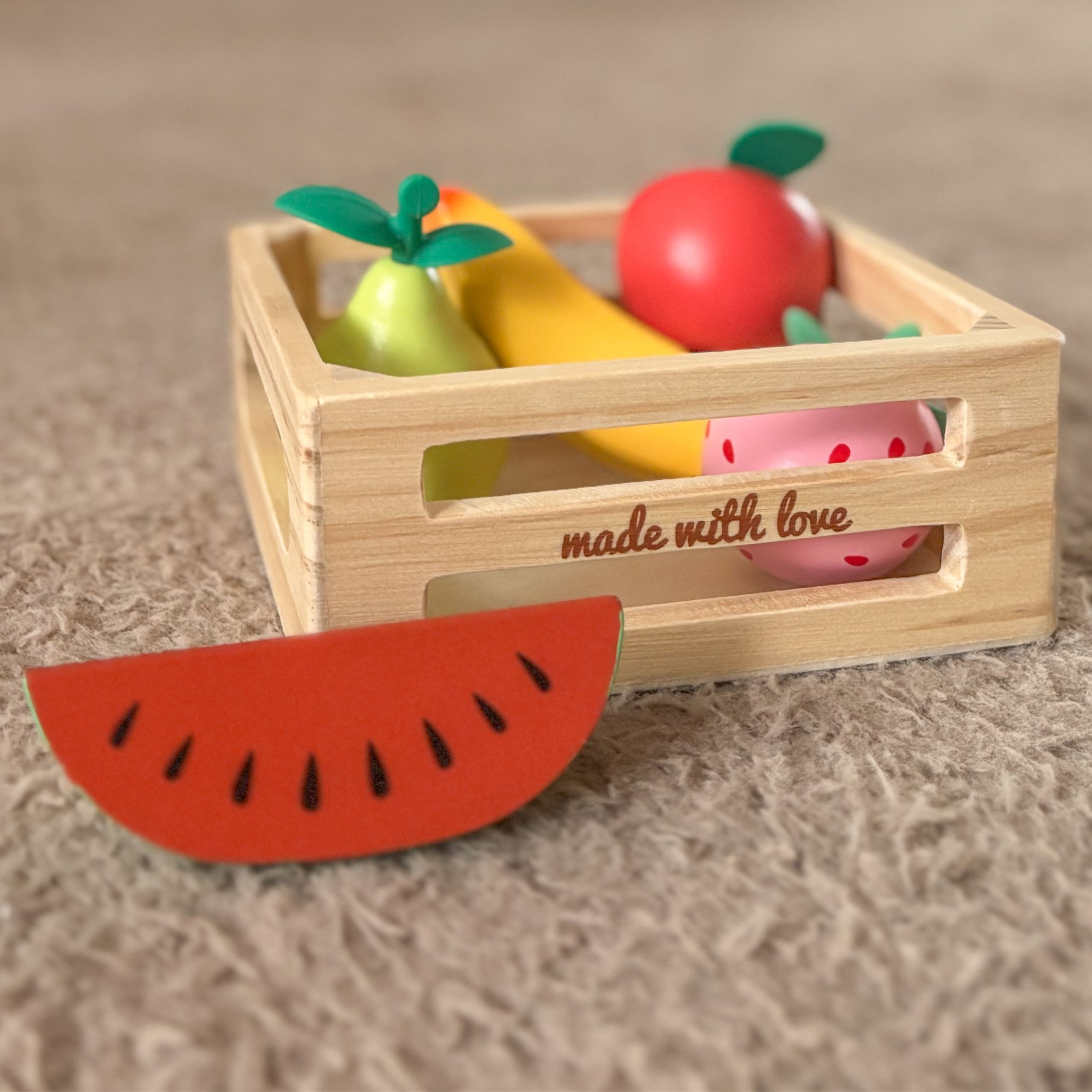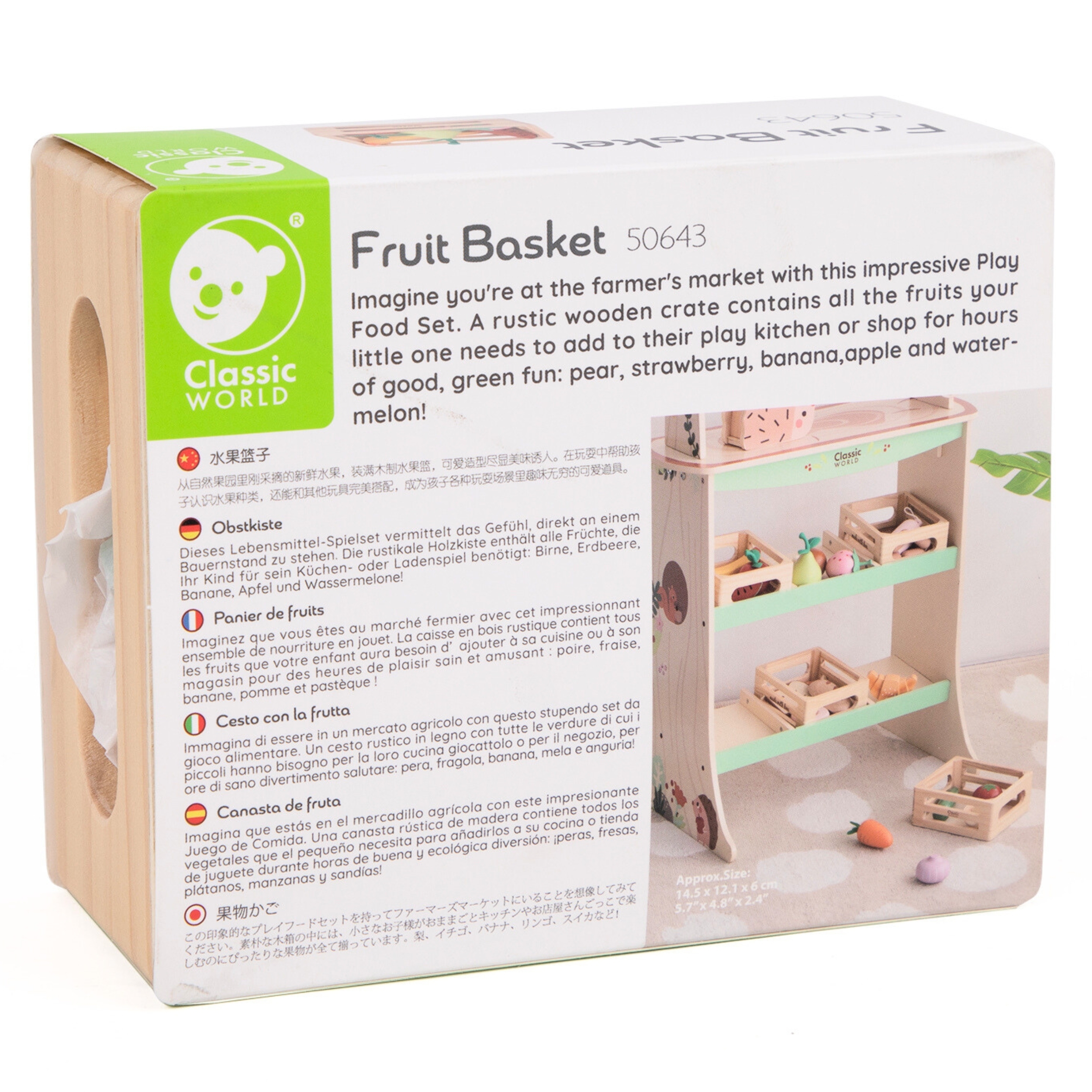 Classic Worldi puuviljakorv on komplekt lastele, kes armastavad loomingulist mängu köögis või poes. Erinevat tüüpi puuvilju imiteerivad puitelemendid võimaldavad vaba rollimängu, kujutlusvõime ja sotsiaalsete oskuste arendamist. Iga komplekti komponent on valmistatud kvaliteetsest puidust. Komplekt sobib suurepäraselt nii iseseisvaks mängimiseks kui ka koostööloomeks eakaaslaste või täiskasvanutega. Omadused: – Lastele alates 18. elukuust. – Valmistatud kvaliteetsest puidust – Sobib suurepäraselt poodi või kööki mängimiseks – Värvilised elemendid tõmbavad tähelepanu ja julgustavad mängima Komplekti kuulub: – Puidust korv – Pirn – Maasikas – Banaan – Õun – Arbuus Mänguasi arendab: – Kujutlusvõimet – Loovust – Sotsiaalseid oskusi