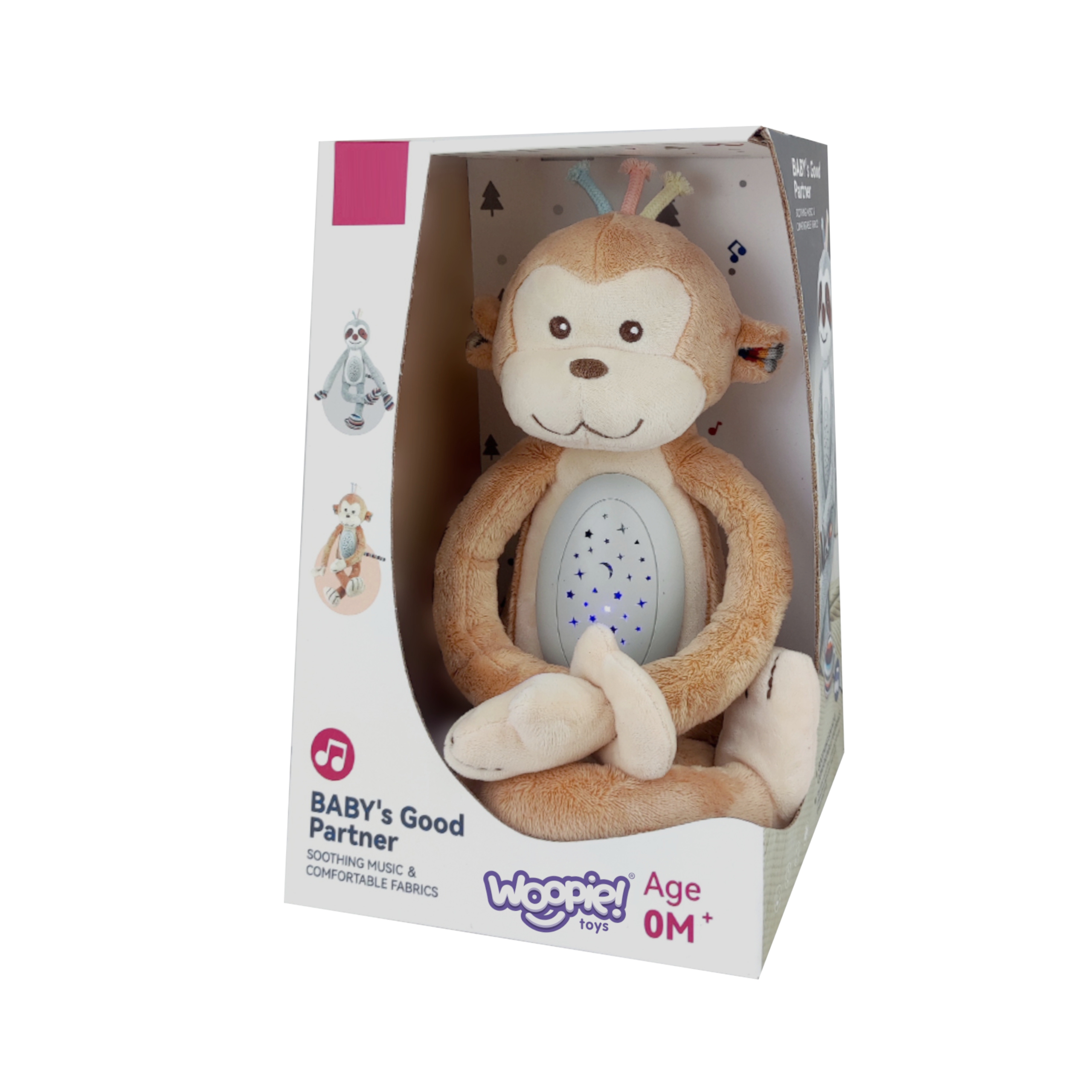 Brändi WOOPIE Plush Monkey Sleeper on teie beebile võluv unekaaslane. Maskott sobib suurepäraselt beebidele ja suurematele lastele, kellele ei meeldi ise uinuda. Ahvist saab täiuslik sõber heade unenägude jaoks ja päästja kapis olevate koletiste eest. Kaisulisel on funktsioonid, mille sisselülitamisel kuuleme imelisi meloodiaid ja kõht hakkab erinevatest värvidest virvendama. Mänguasjal on ka koguni 10 erinevat hällilaulu. Mänguasi sobib beebidele, seega on täidetud pehme vatiga. Lisaks saab plüüsist mänguasja ohutult ja lihtsalt puhastada, eemaldades mehhanismi ja seejärel lihtsalt kokku pannes. See võimaldab vanemal lapsel mänguasja maskotina ilma mehhanismita kasutada. Iga laps armub ahvisse! Omadused: Mänguasi mõeldud imikutele. Lülitage mänguasja nuppu all hoides sisse ja välja. Mänguasja väljalülitamiseks hoidke toitenuppu all. Olen täiuslik toisena, mida on vaja magama jääda. See on valmistatud õrnast materjalist ja täidetud puuvillaga. Valgus- ja heliefektid – meloodiad/hällilaulud, mis aitavad uinuda + projektor, mis muudab 6 värvi. Tervelt 10 hällilaulu!!! Sees olevat mehhanismi saab plüüsi pesemiseks lahti võtta. Ahviprojektor töötab kolmes valguse projitseerimisrežiimis, mida saab nupuvajutusega muuta. Nõuded: 3 x AAA patareid (ei kuulu komplekti). Mänguasi arendab: Meeli. Uudishimu ja avastus. Keskendumine.