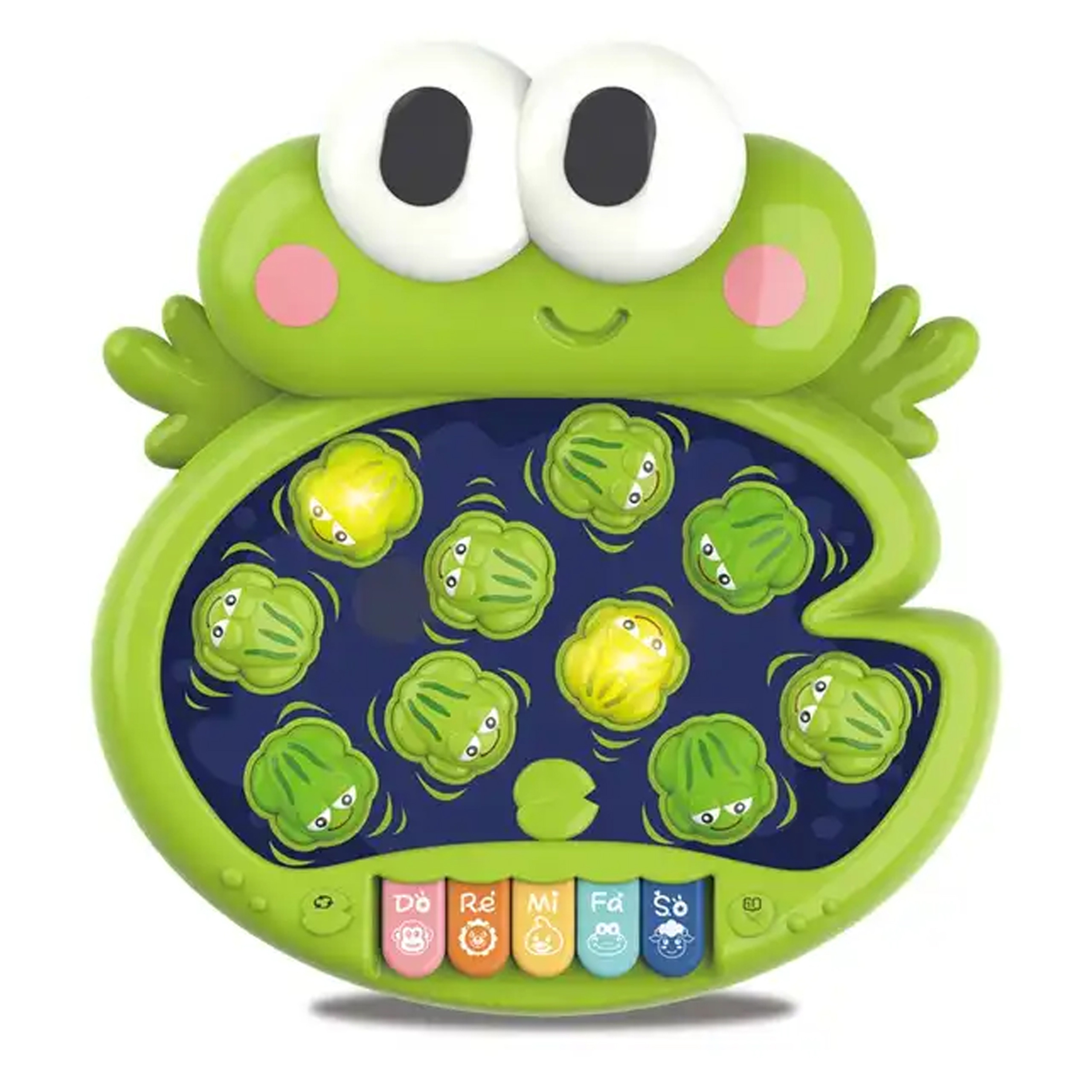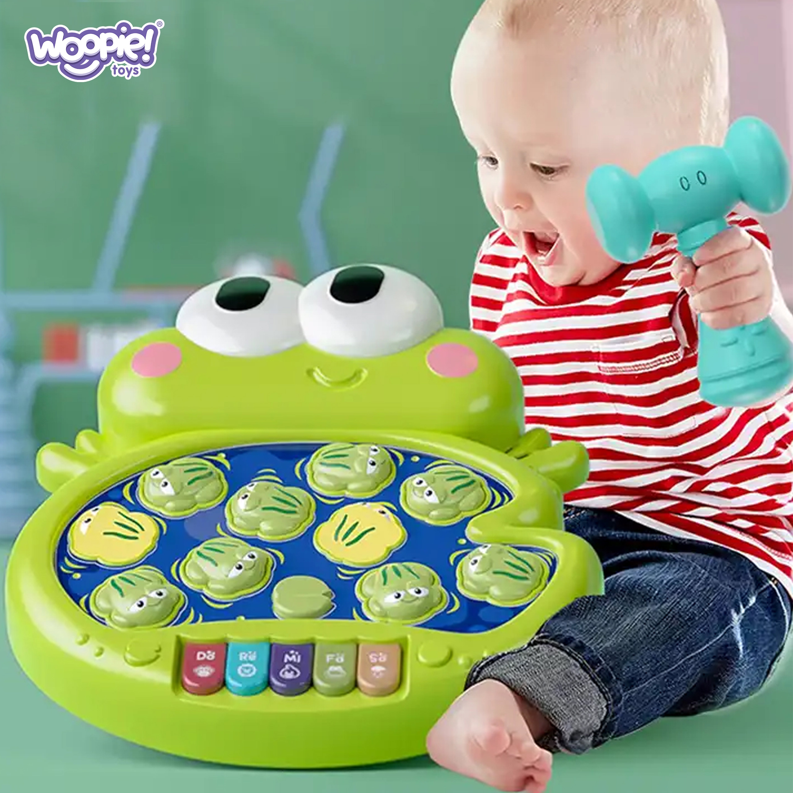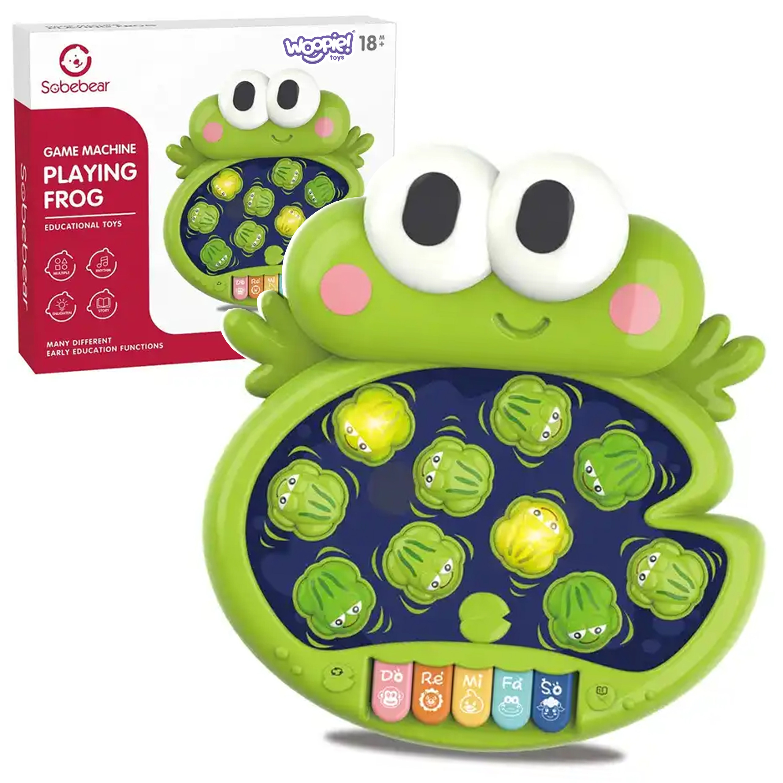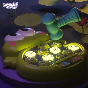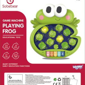 Brändi Woopie “Knock Frogs” on lõbus interaktiivne mäng, mis tutvustab teie väikesele valguse, helide ja liikumise maailma! See on ideaalne pakkumine kõige noorematele avastajatele alates 18. elukuust, kes armastavad uusi tegevusi. See mäng on rohkem kui lihtsalt lõbus – see on tõeline seiklus, mis arendab meeli, ergutab kujutlusvõimet ja ergutab liikumist. Mäng on lihtne, kuid äärmiselt sõltuvust tekitav! Kui värvilised konnad süttivad, on beebi ülesandeks neid pehme haamriga lüüa. See on väljakutse, mis nõuab teie pisikeselt kiiret ja tähelepanelikkust – konnad ilmuvad erinevatesse kohtadesse, nii et igav ei hakka! Lisaks aktiveerib iga klahv ühe meeldiva meloodia, luues ainulaadse heliseade, mis lisab igale mänguhetkele rõõmu. Kuid sellega üllatused ei lõpe! Knock Frogs pakub kuni 4 erinevat funktsiooni: rõõmsatest konnade löömisest klaverimänguni, loomade helideni ja meloodiliste lauludeni, mis kõlavad klahvide vajutamisel. Tänu sellele leiab iga laps endale midagi, mis talle huvi pakub ja kauemaks tegevust hoiab ning vanemad on kindlad, et nende lapsel on loovalt ja arendavalt lõbus. Mänguasi töötab AAA patareidega. Omadused: – Mänguasi, mis on mõeldud lastele alates 18. elukuust – Valgustatud konnad, meloodiad ja helid – Pehme haamer – 5 värvilist meloodiaga klahvi – Toiteallikaks on 3 AAA patareid (ei kuulu komplekti) – Sõbralikud värvid, mis ergutavad lapse kujutlusvõimet Mänguasi arendab: – Loomingut – Klaveri funktsioon võimaldab lapsel arendada oma esimest melodialist muusikat. Laps saab katsetada erinevaid helisid ja luua omapäraseid kompositsioone. – Uudishimu – klahvide alla peidetud loomade hääled ja meloodiad panevad lapse innukalt avastama, mis saab pärast järgnevate nuppude vajutamist. See on suurepärane võimalus lõbusalt aega veetes õppida – Osavus ja täpsed liigutused – valgustatud konnade löömine nõuab täpsust ja reflekse ning pehme vasar sobib suurepäraselt väikestele kätele. See on suurepärane võimalus käe-silma koordinatsiooni harjutamiseks – Koordinatsioon – konnade püüdmine ja klaveriklahvide vajutamine on tegevused, mis haaravad nii väikelapse käsi kui ka nägemist. Laps õpib oma liigutusi nähtu-kuulduga sünkroniseerima, mis toetab peenmotoorika arengut ja muudab ta üha tõhusamaks.