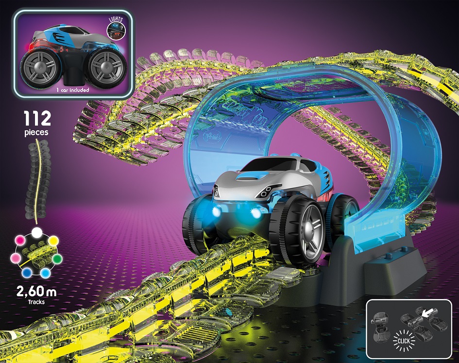 See komplekt annab teile võimaluse luua paindlikke radu, et saaksite kogeda hingematvaid laskumisi, hämmastavaid loope, põnevaid pöördeid ja palju muud. Olgu need aasad, ekstreemsed tõusud, põnevad spiraalid või kitsad kurvid – Smoby Flextreme võidusõidurajal ei tule enam kunagi nüri hetke. Paindlik ja modulaarne võidusõidurada pakub pööraseid marsruute ja põnevaid sõite lastetoas. Kui kõik raja ehitustööd on lõpetatud, asetatakse kinnine võistlusauto pole-positsioonile. Teekond marsruudil on põnevusega oodatud. Kas väike võidusõiduauto saab kõigi ülesannetega hakkama? Omadused: – Komplekt koosneb 112 värvilisest elemendist, millest saame ehitada kuni 2,6 m pikkuse võidusõiduraja. – Komplekti kuulub vahetatava kerega võidusõiduauto. – Clip-on süsteemiga roomikud (tänu millele roomikud ei lähe laiali, püsivad koos ning kogu struktuur on stabiilne ja painduv). – Saate igal ajal raja ümber ehitada, luua põnevaid spiraale, äärmuslikke kaldeid. – Rööbastee elemendid helendavad. – Auto käivitatakse start/stopplüliti abil. – Tänu spetsiaalsele ajamile ei saa auto ümber minna ja võib kergesti tagurpidi sõita aasadel. – Valgustatud esi- ja tagatuled tagavad põneva öise sõidu pimedas ruumis. – 10 cm auto. – Kaasas LED-loend, millele raja ehitatakse, tänu millele valgustab kogu loodud trassi pikkuses ja tunneli koos elektrimooduliga. – Vaja on 6 x AAA patareid (3 autole, 3 tunnelile) – komplekti kuuluvad testpatareid.