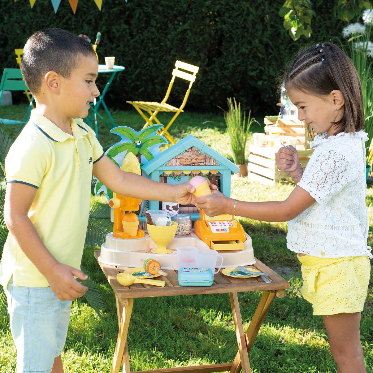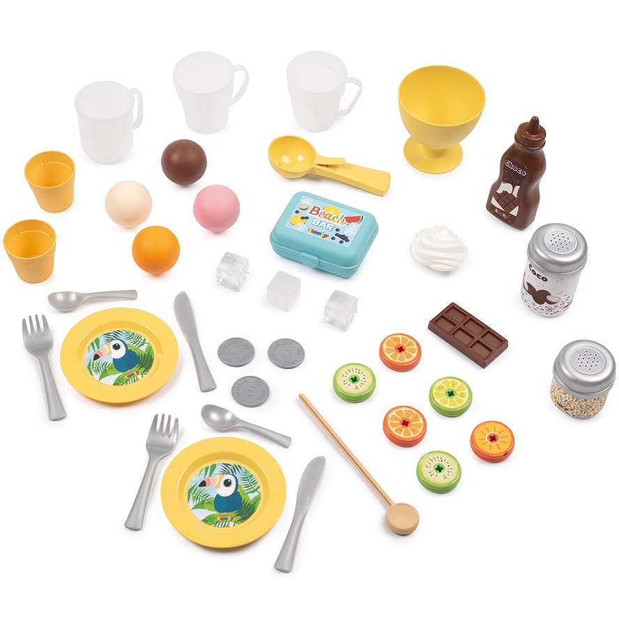 Lapsed armastavad kodusid pidusid ja mänge. Nüüd saavad nad korraldada rannapeo oma sõpradele, vanematele või topistele. Omadused: – rannabaar võimaldab lõbutseda mitmel moel – lapsed saavad teha jäätist glasuuri ja puistega, jooke, puuviljavardaid ja siis kõik kassasse panna, – komplektis on 38 tarvikut – jäätisemasin, jäätis vahvlitega, jäätisepalli lusikas, puuvilja šašlõkk, puistad, nõud, söögiriistad – tänu sellele on lihtne võtta, kassa, söögiriistad park või aed.
