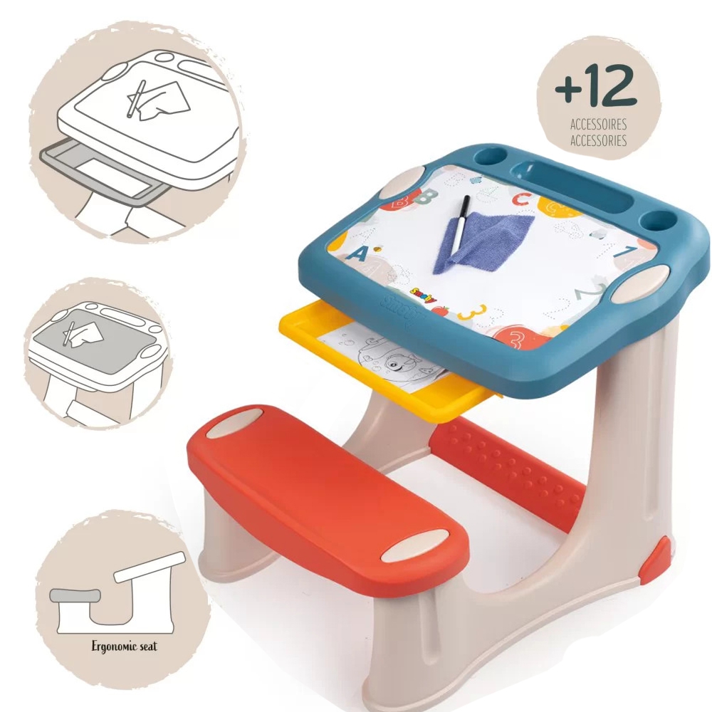 Laud koos joonestuslauaga firmalt Smoby on lastele mõeldud mööbliese, mis on laste mängualal asendamatu. Mugava istmega kirjutuslaud annab teie väikelapsele turvalise ruumi loovuse ja hariva meelelahutuse jaoks. Mänguasja disain ja mõõdud sobivad lastele alates kolmest eluaastast. Lapsed saavad mugavalt leti kohal istuda ja kõik nõud on käepärast. Väljatõmmatav sahtel ja praktilised avad mahutavad jooniseid, markereid, värvipliiatseid ja muid vidinaid. Tahvlil on kustutatav joonistuspind, mida saab puhastada kaasasoleva lapiga. Tänu sellele saavad lapsed luua uusi pilte! Komplekti omadused: – kaldplaadiga laud värvimiseks ja kirjutamiseks – pestav joonistuspind – 12 tarvikut sh värviraamatud, viltpliiats ja lapp tahvli puhastamiseks – hoiustamiseks on sahtel. Komplekti sisu: – 1 x laud tahvliga – 1 x värvileht – 1 x must, pestav marker – 1 x lapp tahvli puhastamiseks
