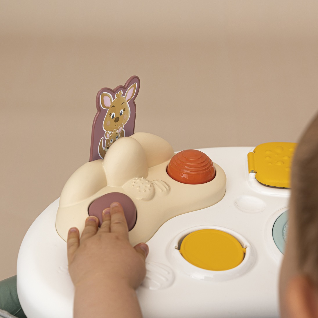 Kolm-ühes interaktiivne tegevuslaud kaubamärgilt SMOBY on lastele mõeldud komplekt, mis on põnev mänguasi, mis toetab väikelapse sensoorset arengut ja üldmotoorikat. Omadused: – täispuhutav iste – see on mugav ning sellel on peatugi ja käetoed. – interaktiivne laud – see on eemaldatav ja pakub palju lõbusaid funktsioone. – 6 kuu vanustele beebidele – seda istet saavad kasutada ka kõige väiksemad lapsed. – kujundid ja tekstuurid – laual on mitmesuguseid kujundeid ja tekstuure, mis köidavad lapse tähelepanu. – vaoshoitud värvid – iste on lapse silmale sõbralikes värvitoonides. – kõrge kvaliteet – toode on valmistatud Prantsusmaal ja valmistatud vastupidavatest materjalidest. – lihtne puhastada Komplekti kuulub: – libisevate helmestega liumägi – pöörlev puu koaala karuga – avanev aken naeratava ahviga – tiirmisratas õnnelike loomade piltidega – peidetud kägu, mida saab aktiveerida nupuga