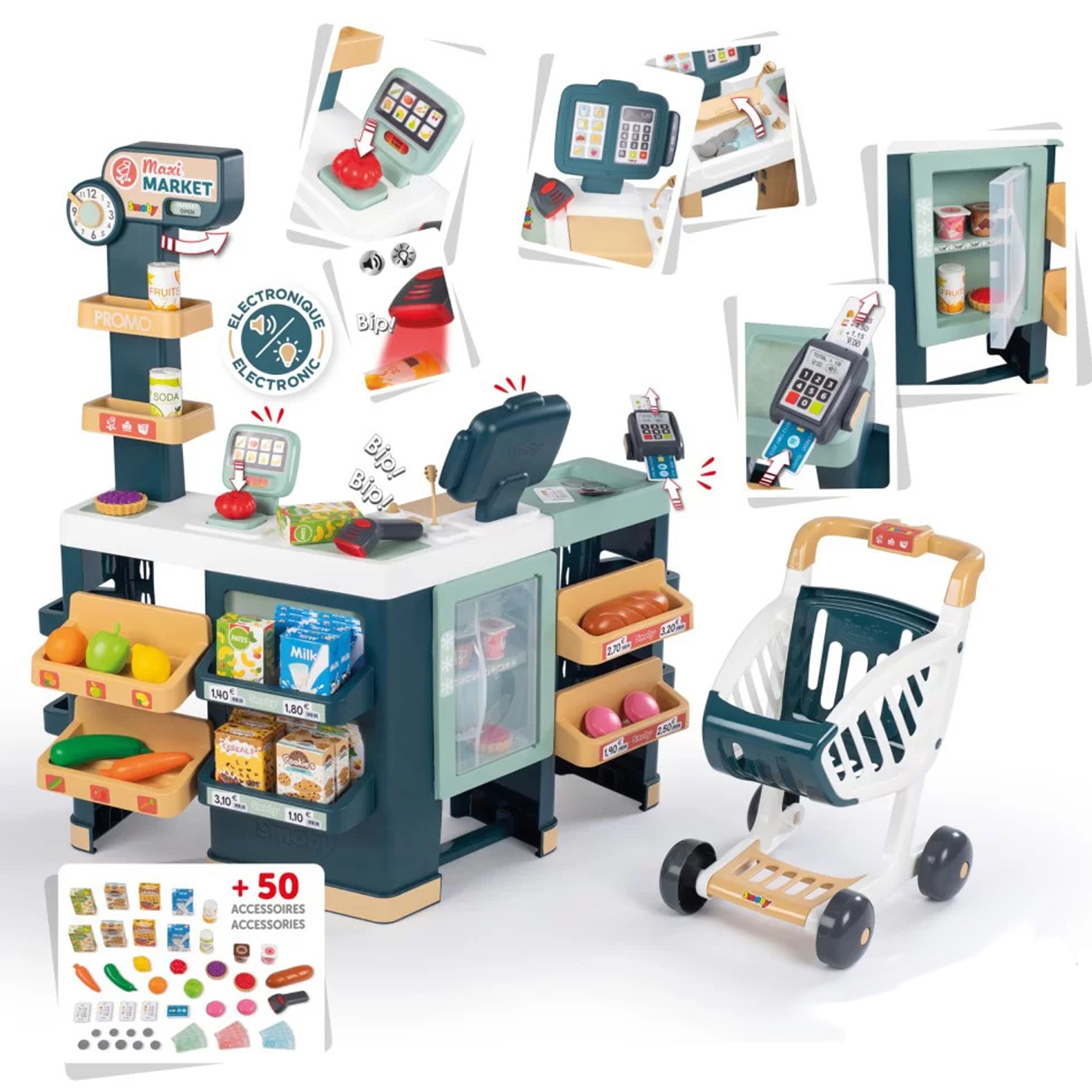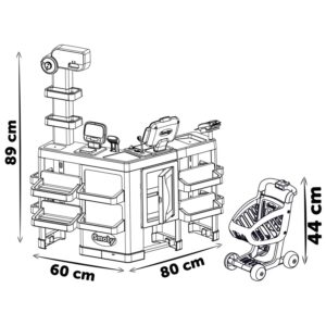 Maximarket by Smoby on fenomenaalne mänguasi lastele, kellele meeldib poes mängida. Supermarketis saavad lapsed müüa, ostleda, loendada ja korraldada kaupu ning eelkõige lõbutseda! Turg on varustatud valguse ja heliga skanneriga kassa, mehaanilise kaalu ja krediitkaardilugejaga. Kõik need seadmed meenutavad neid, mida laps päris poes näeb. Ostukorv tuleb kasuks ostlemisel. Ja mänguasja raha on vaja kauba eest tasumiseks. Tänu kellale saab iga väikeettevõtja ise otsustada, millal poe avab ja sulgeb. Omadused: – supermarket kaalu, krediitkaardilugeja, külmiku ja ostukorviga – valguse ja heliga skanner – 50 tarvikut, sealhulgas münte, pangatähti, juur- ja puuviljade imitatsioone, – käru kõrgus ca. 44 cm Komplekti sisu: – 1 x Maxi Market supermarket – 1 x ostukorvi – 8 x toidupakendit – 2 x purki jooki – 6 x juurvilju ja puuvilju – 4 x küpsist – 1 x päts leiba – 2 x jogurtit – 1 x valguse ja heliga skanner – 4 x kviitung – 1 x krediitkaart – 91 x coin banknotes