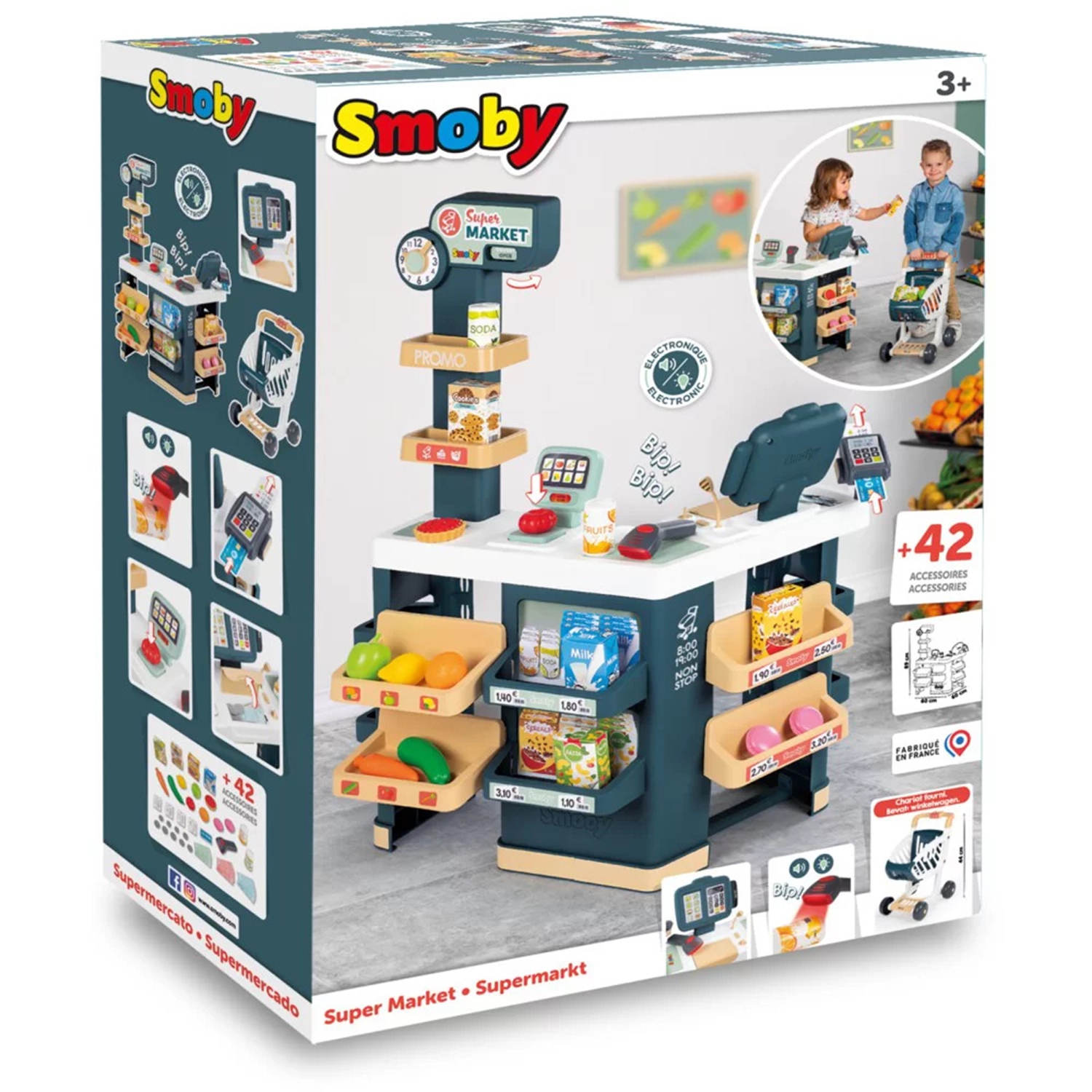 Smoby käru, elektrooniline kassa koos skanneri ja kaaluga supermarket on kaasaegne toidupood, kus lapsed saavad osta ja kaupa müüa. Suur turg on varustatud mehaanilise kaaluga, millel saate puu- ja köögivilju kaaluda. Komplekti kuuluvad maiustused, joogid ja muud toidukaubad. Ostetud kaupa aitavad kokku lugeda valguse ja heliga skanner ning mänguasjaraha avaneva kassaga kassa. Omadused: – valguse ja heliga skanner, mehaaniline kaal, kaardilugeja – koguni 42 värvilist lisatarvikut – arvukalt riiuleid kauba jaoks, käepärane ostukorv, käsitsi reguleeritav kell – mänguasjad, mis on mõeldud laste väikestele kätele Komplekti kuulub: 1 x supermarket koos kassaaparaadi, lugeja ja kaaluga 1 x ostukorv 1 x skanner 4 x purki 3 köögivilju xfr joogipakendit 2 x purki kviitung 1 x maksekaart 9 x mündid 12 x paberraha
