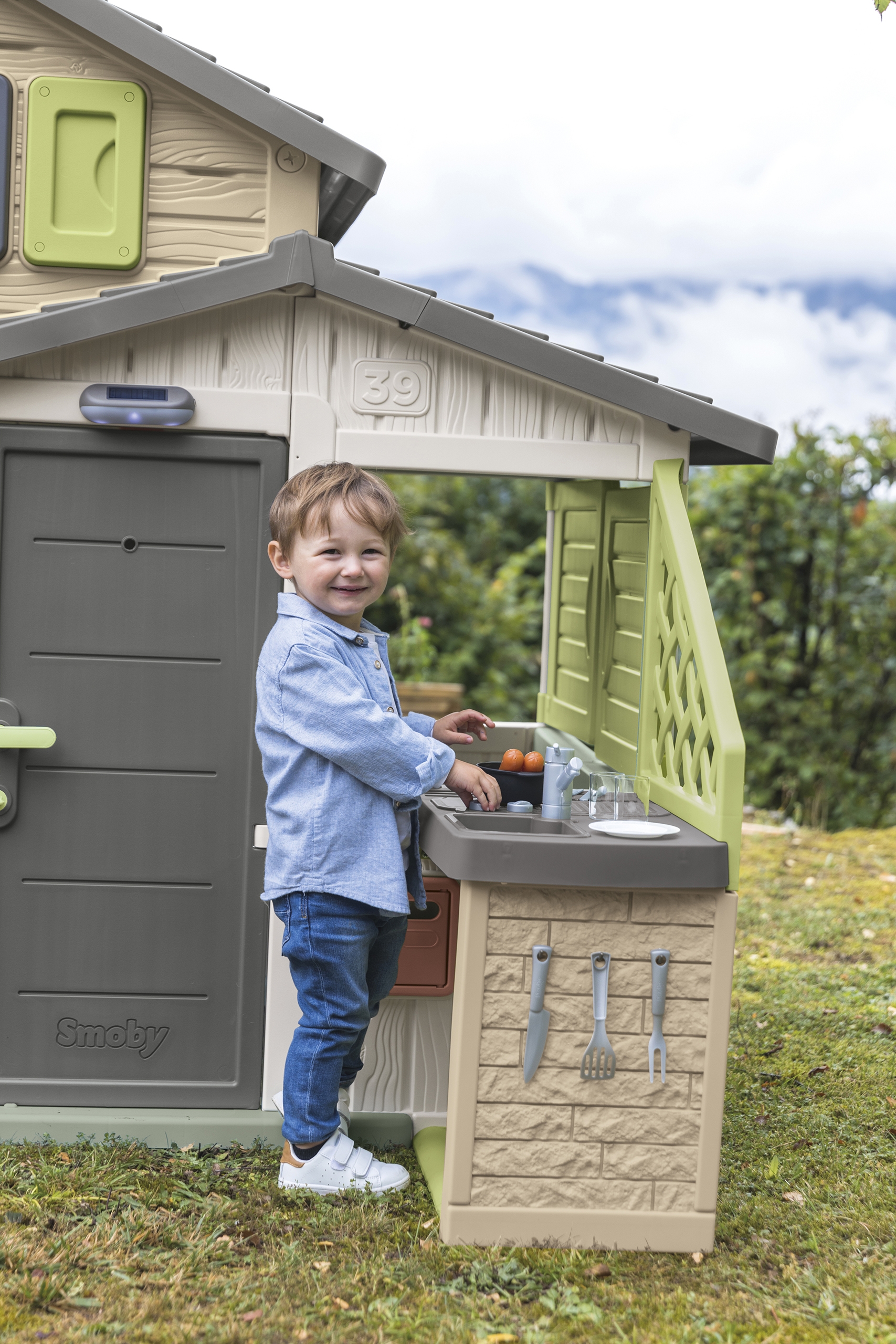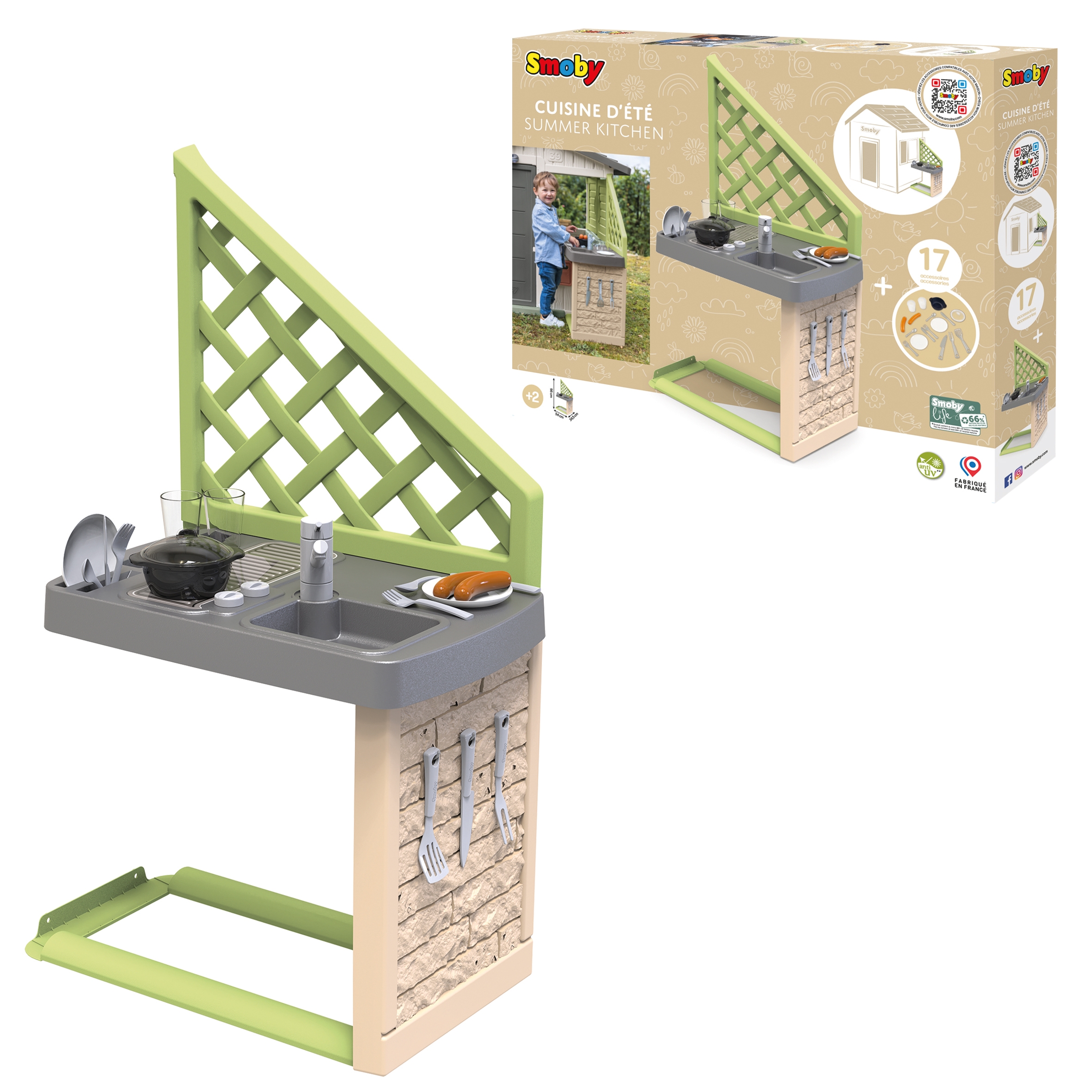 Suveköök koos grilli ja kraanikausiga on suurepärane valik, mis rikastab teie õuerõõme. See võluv komplekt sobib suurepäraselt Smoby aiamajadesse, pakkudes lastele võimalust oma miniatuurses köögipunktis loominguliselt süüa teha, grillida ja korras hoida. Tänu aksessuaaridele, nagu kaanega pott, taldrikud, söögiriistad ja vorstid, saavad lapsed lõbusalt süüa valmistada ja serveerida. Lisaks aitab nõudepesu mängimine neil arendada oma korrashoiuoskusi. Köök on valmistatud vastupidavast plastikust spetsiaalse ANTI-UV kattega, mis kaitseb seda päikesevalguse kahjulike mõjude eest. Mänguasi on esteetiliselt kujundatud tagasihoidlikes värvides, mis sobivad tänapäevaste Smoby aiamajadega. Komplekti sisu: – 1 x suveköök (54 x 34,5 x 98 cm) – 1 x kaanega pott – 2 x taldrik söögiriistade komplektiga – 2 x klaasid – 2 x vorstid Omadused: – Vanus: 2 aastat – UV-vastane kate – kaitseb värvide tuhmumise eest päikese käes – Värvid on vaoshoitud, looduslähedased 66% materjalist pärineb taaskasutusest. Mänguasi arendab: – motoorset arengut – söögi valmistamist ja nõude pesemist toetab käelisi oskusi – loovust – laps oskab ise retsepte välja mõelda ja “köögipidusid” korraldada – sotsiaalseid oskusi – õdede-vendade või sõpradega kokkamist mängides arendab koostööoskusi – Värvide ja vormide äratundmist – õppida ära tundma erinevaid köögitarvikuid Sobib Smoby majadesse numbritega: – 810737, -3107, -70, -3 810740, – 810504, – 810407, – 810408, – 810208 – 810206. [img-126003-left-thickbox_default] [img-126006-left-thickbox_default]