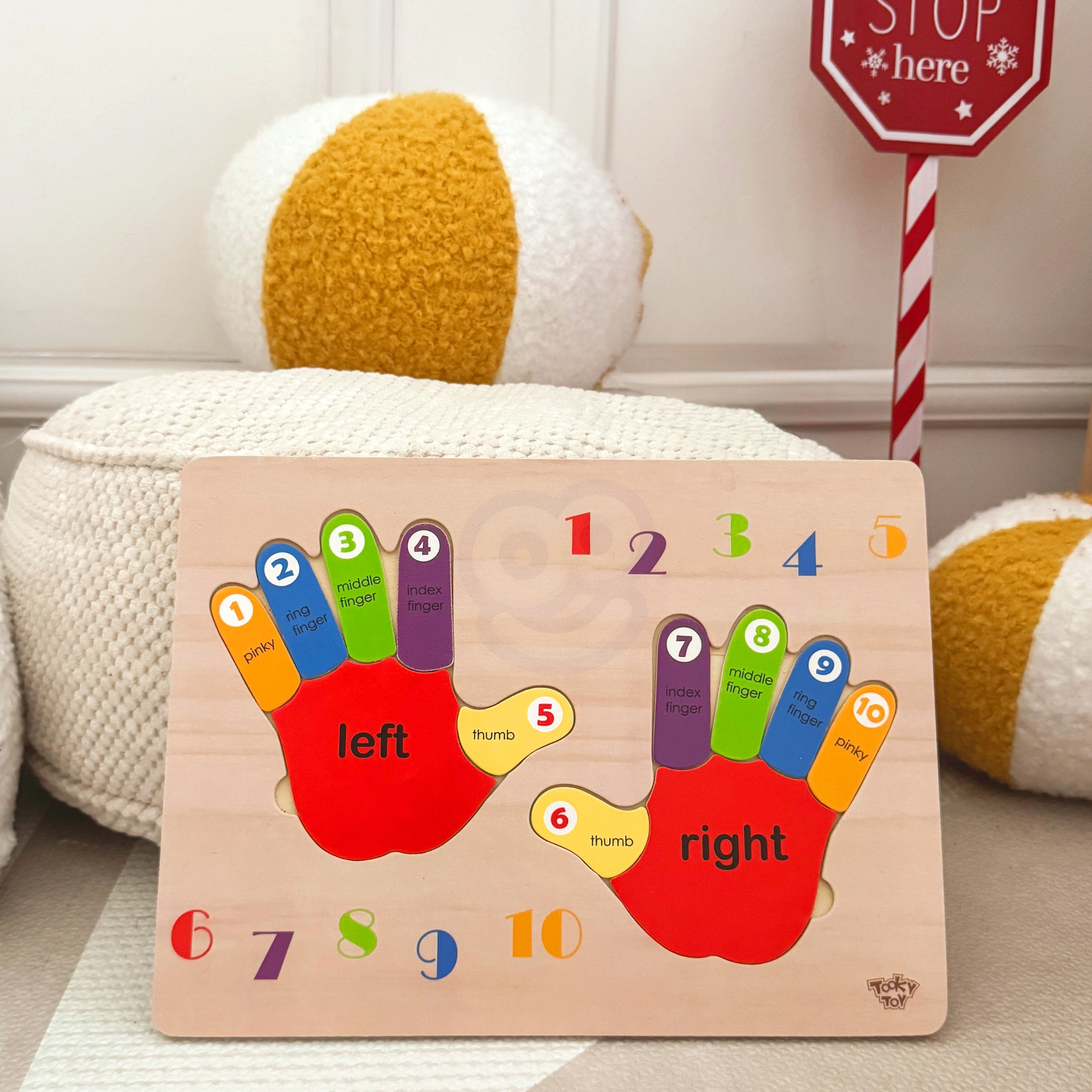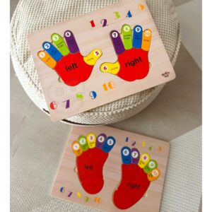 Puidust käte ja jalgade pusled kaubamärgilt TOOKY TOY on suurepärane õppevahend loendamise õppimiseks, külgede ja värvide äratundmiseks – Ideaalne inglise keele õppimiseks! Laud ja kõik selle elemendid on valmistatud kvaliteetsest puidust ja on täpselt kohandatud lapse jalgadele. See on suureks abiks väikestele, kes alustavad oma matemaatilist seiklust. Värvilised käed ja jalad on kirjeldatud paremal ja vasakul küljel. Igale sõrmele on määratud ka number, nii saab laps omandatud teadmised tõlkida oma sõrmedel loendamiseks, kui ta põhimõttest aru saab. Lisaks on igal sõrmel oma värv, mis aitab neid eristada. Värvilised sõrmed tahvlil on täpselt kirjeldatud sõrmenimedega – õppimine ei pea olema igav! Omadused: – Mänguasi vanuses 3 aastat – Ohutuid puidust elemendid – Pilkupüüdvad värvid – Aitab õppida lugema, tundma värve ja sõrmede nimesid Mänguasi arendab: – käelisi oskusi – loovust – keskendumisvõimet – käe-silma koordinatsiooni – kriitilist mõtlemist