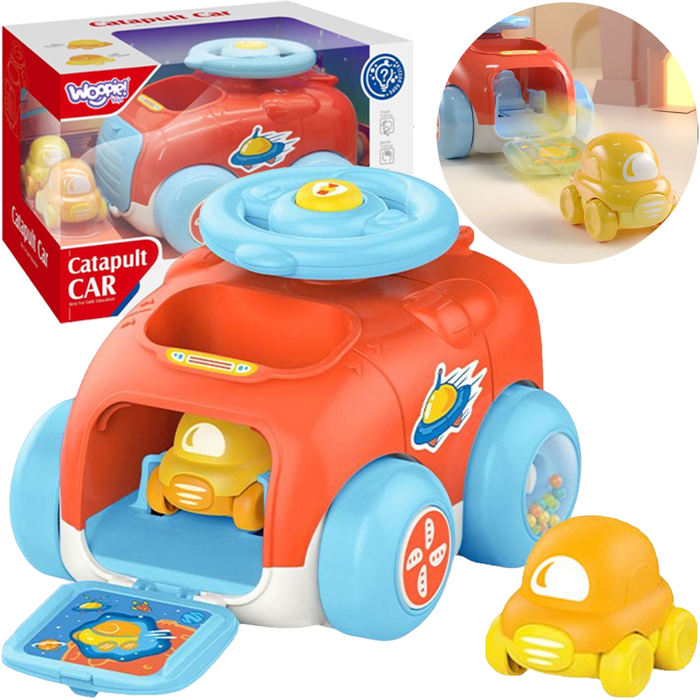 WOOPIE kaubamärgi kanderaketiga auto on lastele suurepärane idee. Auto sees on kaks väiksemat ratastel sõidukit. Kogu komplekt sisaldab käivitajat, mis võimaldab melu veelgi mitmekesistada. Asetage auto ragulka, keerake rooli ja vajutage helisignaali ning teie auto hüppab sõidukist välja! Autol on ka sensoorsed elemendid, näiteks helid ratastes, kui need pöörlevad. Suurepärane võimalus mängida koos sõpradega või üksi. Omadused: – mänguasi alates 18. elukuust, – varustatud katapulteerivate sõidukite kanderakettiga, – omab sensoorseid elemente: pöörlevate rataste tekitatud helid, – suurepärane lõbu ühele või mitmele inimesele, – stimuleerib lapse meeli: arendab käe-silma koordinatsiooni ja soodustab aktiivset mängu. koordinatsioon käsi-silm – nägemine – keskendumisvõime – loogiline mõtlemine