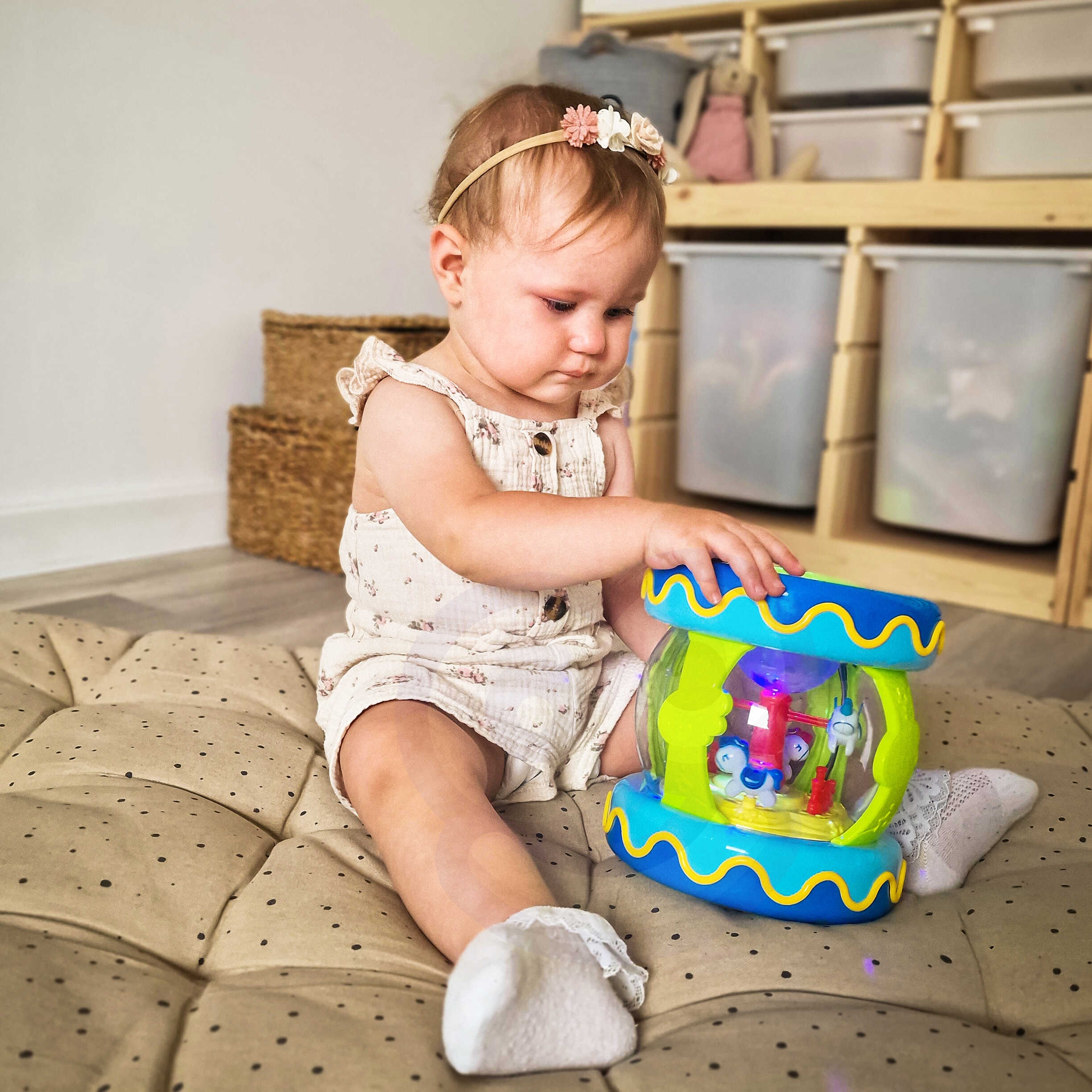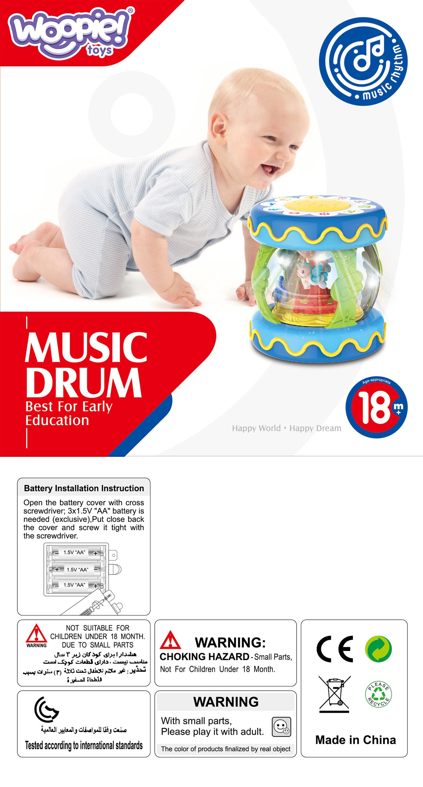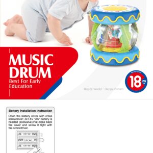 Brändi WOOPIE Musical Drum Music Box on mänguasi, mida iga laps vajab. Mänguasi on mõeldud peamiselt meelte arendamiseks ja rahustava abivahendina uinumisel. mänguasi töötab ka muusikakastina, mille sees on keerlevad hobused. Sellel on 11 helinuppu, sealhulgas suur trumm. Meloodiate esitamisel vilguvad tuled. Öösiti toimib mänguasi projektorina – tuled helendavad ja jäljendavad tähti. Mänguasi arendab kõrgelt lapse meeli ja hoiab lapsel pikka aega keskendunud. Omadused: – mänguasi alates 18. elukuust – 3 ühes – trumm, muusikakast, projektor – 11 funktsiooni/helinuppu – silinder/rullik roomama õppimiseks – helifunktsioonid – valgusfunktsioonid – vajalik patarei: 3x 1,5V “AAA” (ei kuulu komplekti) 11 nuppude helifunktsiooni – laste trummimuusika – loomaheli lülitus