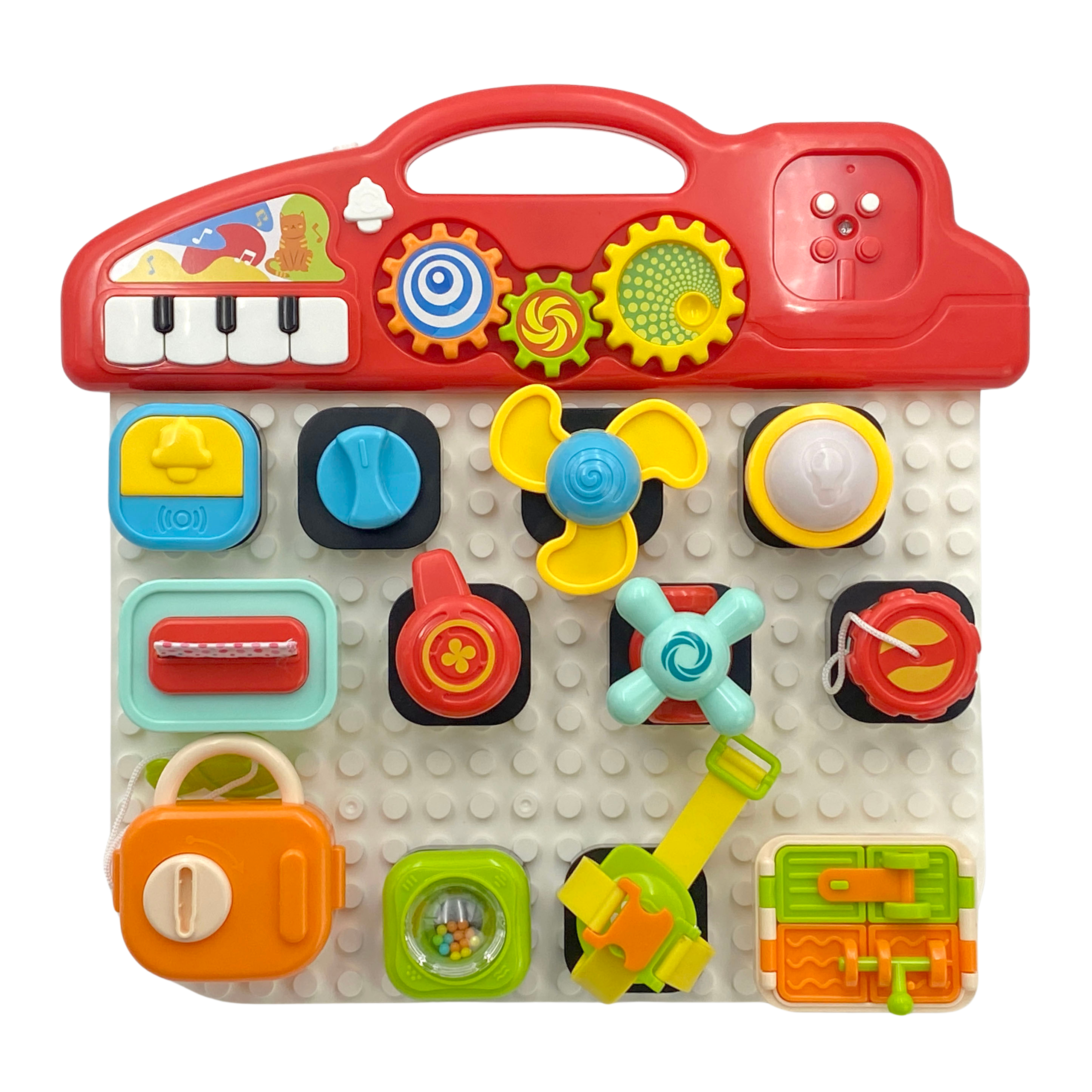 Brändi Woopie värviline tegevuspaneel on põnev arendav mänguasi, mis on loodud toetama laste sensoorset ja motoorset arengut. Paneel koosneb erinevatest interaktiivsetest elementidest, mida saab nagu plokke vabalt kinnitada ja lahti võtta. Komplekti kuulub ka kassikujuline auto, mille külge saab plaadilt elemente vabalt kinnitada. Kinnitatud plokkidel on erinevat tüüpi lülitid, nupud, nupud, eemaldatavad salvrätikud, võtmega tabalukk ja riiviga avanevad aknad. Nad arendavad lapse motoorseid, kognitiivseid ja sensoorseid oskusi ning harjutavad käe-silma koordinatsiooni. Omadused: – mänguasi lastele alates 18. elukuust – vabalt eemaldatavad ja kinnitatavad manipuleerimisklotsid – komplektis on tahvel, manipuleerimisklotsid ja kassipoegade auto – esteetiline pakend, sobib suurepäraselt kingituseks Mänguasi arendab: – peenmotoorikat – käe-silma koordinatsiooni – loogilist mõtlemist