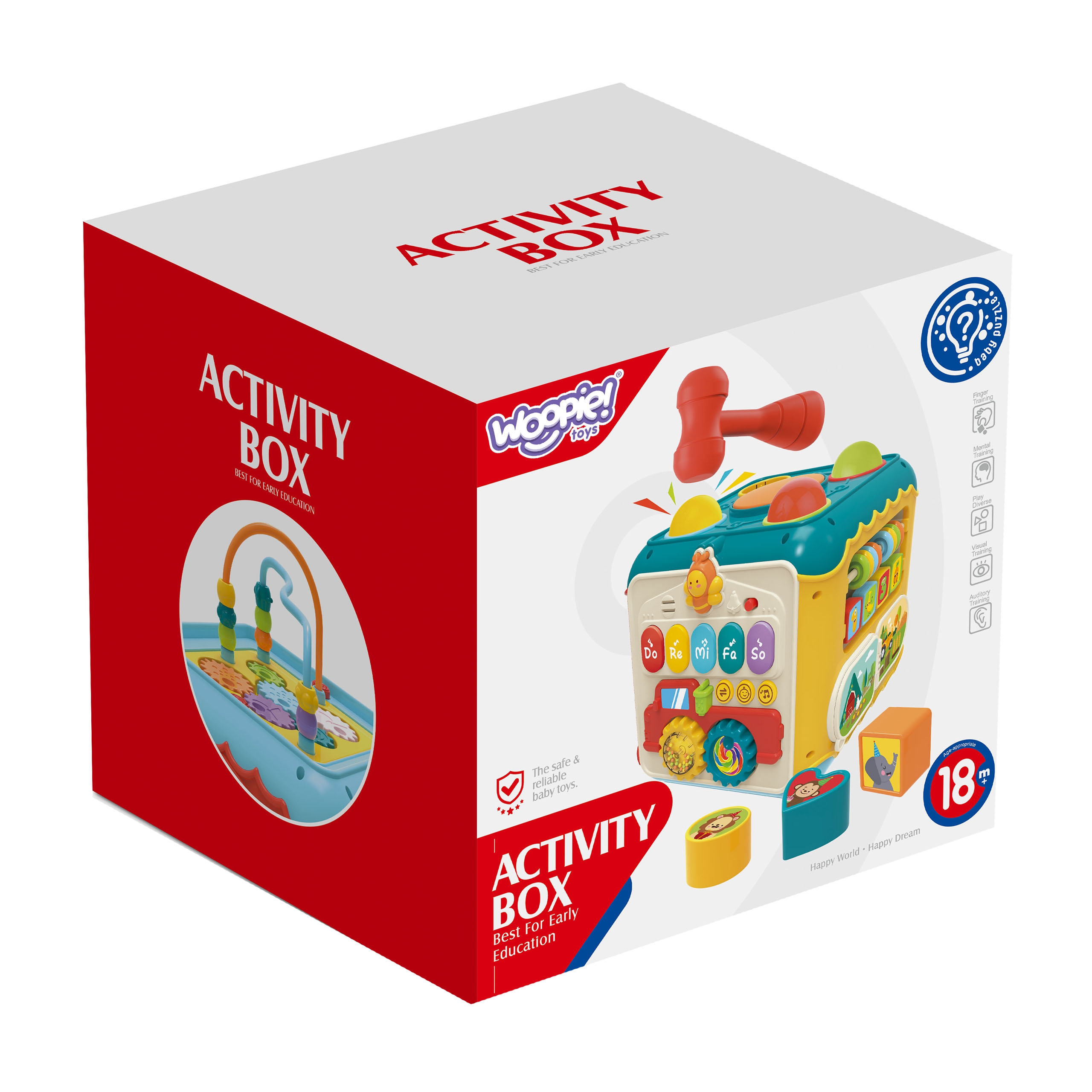 Woopie Baby 6in1 Montessori multifunktsionaalne tegevuskuubik on ideaalne mänguasi lastele alates umbes 18. elukuust. Kuubi iga külg pakub erinevat tegevust: klaver, sorteerija, labürint, haamriga haamer, pusle ja lukuga uks. Mänguasi äratab uudishimu ja võimaldab lapsel katsetada värve, kujundeid ja helisid. See on suurepärane kingiidee – universaalne ja arendav mänguasi, mis toetab paljusid lapse meeli. Omadused: – Minimaalne vanus: alates 18 kuust – Paljud funktsioonid: 6 in 1 klaver, sorteerija, labürint, haamriga naelapulk, lukustusseade ja lukuga uks – Vajalikud patareid: 3 × AA (ei kuulu komplekti) Komplekti kuulub: – haamriga naelakeeraja ja värvilised pallid, – naelakeeraja koos haamri ja värviliste kuulidega, – avamisseade koos kellaga, – ukse ja lukustusseadmega, + kõristi, – klaver autoga, – labürint. Mänguasi arendab: – Silma-käe koordinatsiooni – Peenmotoorikat – Kujundite ja värvide äratundmist – Kuulmise arendamist – Põhjus-tagajärg mõtlemist – Kognitiivseid oskusi ja uudishimu