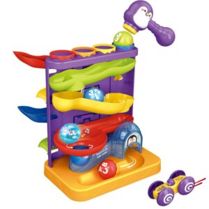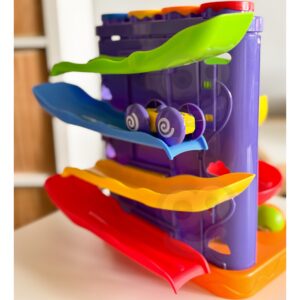 3-in-1 Ball Track mullirada haamri liuguriga mänguautodele kaubamärgilt WOOPIE on multifunktsionaalne mänguasi, mis arendab ja pakub lapsele huvi. Sellel on 3 põhifunktsiooni. Varajane arendusmänguasi: torkake 4 palli läbi aukude, et näha, kuhu need lähevad! Vaadake, kuidas nad vihmaveerennist alla veerevad. Haamer on kerge ja väike, mistõttu on seda lihtne käes hoida. Väikesed lapsed saavad hõlpsasti kaasa lüüa, asetades läikivad pallid piludesse, lüües neid haamriga ja vaadates, kuidas nad mööda kaldteid üles lendavad. Komplekti kuulub ka mänguauto. Teisest küljest on mänguasjal liugused ja see on koht, kuhu me auto asetame ja vaatame, kuidas see alla libiseb. Komplektis on erinevad pallid, millega saab õpetada nt. lugemine ja tähestik. Parandab käe-silma koordinatsiooni ja peenmotoorikat mängu ja kujutlusvõime kaudu. Omadused: – alates 3 eluaastast, – 3 in 1 – pallirada, haamer, liumägi autodele, – on 2 seinaga, – on pehme ja kerge vasaraga, – on pallid õppimiseks, – õppimine läbi mängu. Komplekti kuulub: – 1× kahepoolne rada, – 4× veerev kuul, – 1× väike auto, – 1× haamer.