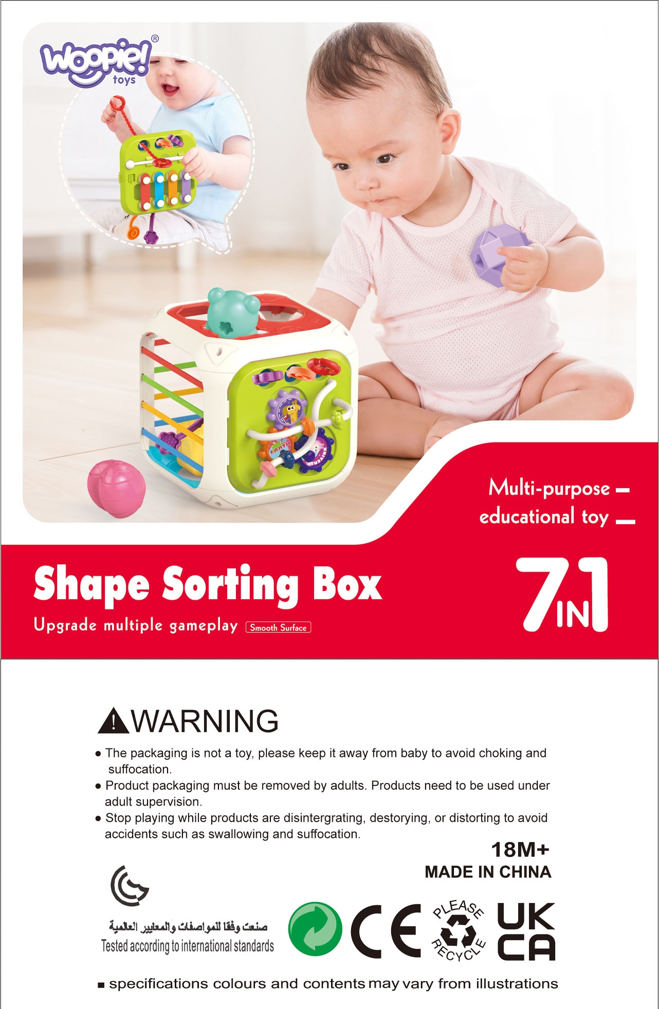 Brändi WOOPIE hariv kuubik on ideaalne kingitus teie lapsele, kui soovite, et ta avastaks maailma läbi mängu – iga heli, kuju ja tekstuur muutub tema jaoks järjekordseks põnevaks seikluseks. Beebikuubik on uuenduslik hariv mänguasi, mis on loodud väikelapse igakülgseks arenguks. Tänu oma mitmekesisusele ja funktsioonide rikkalikkusele muutub see kuubik mitte ainult rõõmuallikaks, vaid ka õppevahendiks, mis toetab lapse kognitiivsete ja motoorsete oskuste arengut. Mänguasjas on ühendatud erinevad elemendid, mis ergutavad lapse meeli ning aitavad tal loomulikul ja meeldival viisil areneda. Eemaldatav paneel miniksülofoniga, värvilised paelad, pöörlevad käigud ja helmestega labürint – need on vaid mõned atraktsioonid, mis Sinu pisikest ootavad. Iga mängides veedetud hetkega õpib laps tundma kujundeid, värve, helisid ning arendab silma-käe koordinatsiooni. Sorterikuubik pole lihtsalt mänguasi – see on alushariduse võti, mis tutvustab lapsele põneval viisil teadusmaailma. Tänu oma mitmekülgsusele on see suurepärane valik kingituseks beebidele, pakkudes neile rõõmu ja arendades oskusi. Ideaalne igaks sündmuseks, alates sünnipäevast kuni pühadeni. Mänguasja omadused: – Mänguasi alates 6 kuust – Sisaldab eemaldatavat paneeli, millel on erinevad elemendid, nagu miniksülofon, pöörlevad hammasrattad, helmeste ja nööridega labürint, mida tõmmata. – Kuubiku kumbki pool on erinev kujundite pusle, mida rikastavad painduvad värvilised paelad ja kuus kellukesi sisaldavat sorteerimis- ja virnastamisplokki. – Valmistatud kvaliteetsetest ABS- ja silikoonmaterjalidest, mis on lastele ohutud. Mänguasi vastab kõigile lastetoodete standarditele. – Kuubi ülaosa on eemaldatav ja seda saab kasutada eraldi, lisades mängule uue mõõtme. – Erineva tekstuuriga nöörid ja käepidemed toetavad sensoorset arengut ja motoorseid oskusi. Mida mänguasi arendab: Motoorika areng: Laps harjutab täpseid käeliigutusi, silma-käe koordinatsiooni ja manipuleerimisoskusi. Sensoorne uurimine: mitmesugused tekstuurid, värvid ja helid stimuleerivad meeli, mis toetab sensoorse taju arengut. Kujundite ja värvide äratundmine: klotse sorteerides õpib teie väikelaps ära tundma erinevaid kujundeid ja värve, mis toetab kognitiivset arengut. Loogiline mõtlemine ja loovus: mänguasi julgustab probleeme lahendama ja arendab lapse kujutlusvõimet. Mänguasja funktsioonid: Mini-ksülofon: Mänguasja helielement, mis tutvustab lapsele muusikamaailma. Pöörlevad käigud ja labürint: mehaanilised elemendid, mis arendavad käelisi ja koordinatsioonioskusi. Paindlikud paelad ja tekstuuriga käepidemed: stimuleerivad kompimismeelt ja toetavad haaramise õppimist. Klotside sorteerimine: mänguasi võimaldab õppida kujundeid sobitades ja värve ära tundes.