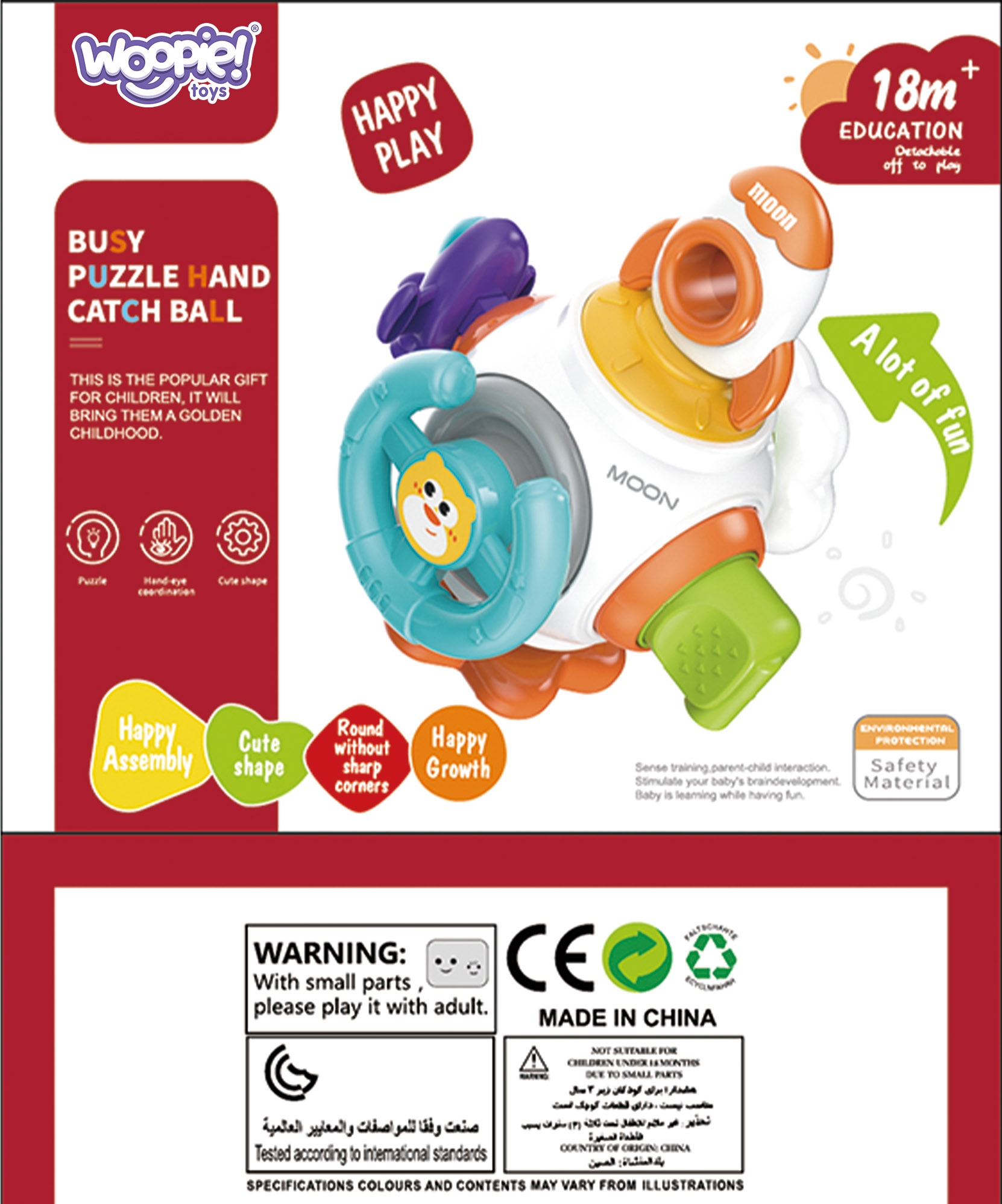 WOOPIE kaubamärgi Montessori Rocket Space Ball on värviline, hariv sensoorne kuubik lastele alates 18. elukuust. See sisaldab kuut tegevuspaneeli, mis stimuleerivad teie lapse meeli ja arendavad motoorseid oskusi. Sellised funktsioonid nagu rool, pilvenupp, analoogpistik, pöörlevad mänguasjad, raketimänguasjad ja kosmoselaeva mänguasjad pakuvad erinevaid kogemusi. Mänguasi on ohutu, valmistatud kvaliteetsetest materjalidest ning disainitud lapse arengut ja turvalisust silmas pidades. Omadused: – lastele alates 18. elukuust – 6 in 1 sensoorne mänguasi – multifunktsionaalne raketikujuline Kosmosepall – pöörleva vurr ja presselementidega – sisaldab rooliratast ja puslet (sorterit) – valmistatud vastupidavast plastikust – julgustab mängima värvide ja kujunditega Mänguasja üksikud elemendid: – arendage lapse motoorseid oskusi ja koordinatsioone. – Pilvenupp: ergutab lapse kuulmis- ja nägemismeeli, arendades peenmotoorikat. – Analoogpistik: aitab lapsel arendada osavust ja käe-silma koordinatsiooni, tutvustab mõisteid “sisse” ja “välja”. – spiner: õpetab põhjuslikku seost ja arendab motoorseid oskusi. – reket: Arendab motoorseid oskusi ja käe-silma koordinatsiooni, tutvustab ruumimõisteid. – kosmoselaev: Arendab osavust ja käe-silma koordinatsiooni, ergutab lapse kujutlusvõimet. Mänguasi arendab: – peenmotoorikat ja käte osavust – silma-käe koordinatsiooni – kompimis-, kuulmis- ja nägemismeelt – loogilise mõtlemise võimet (pusle) – loovust ja uudishimu