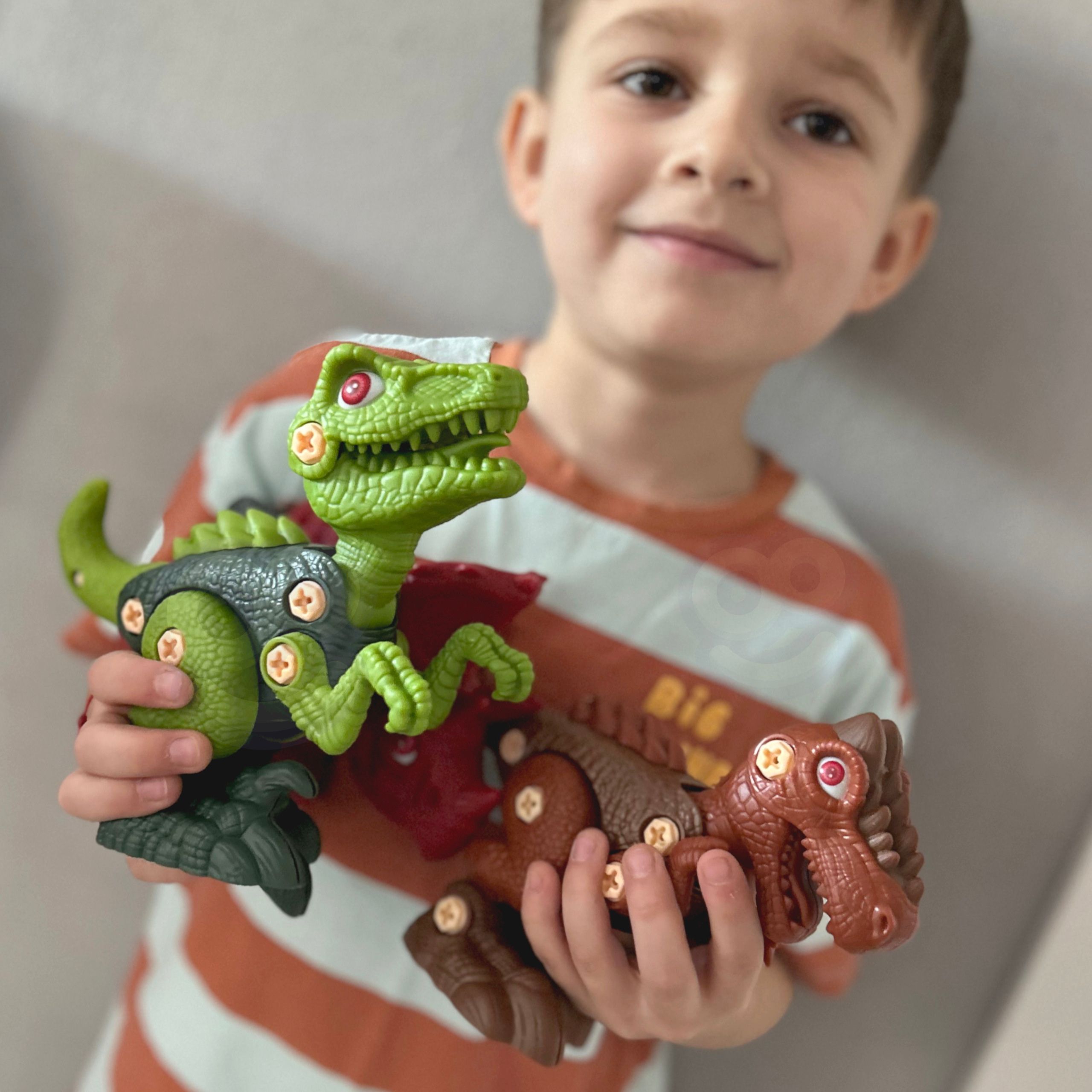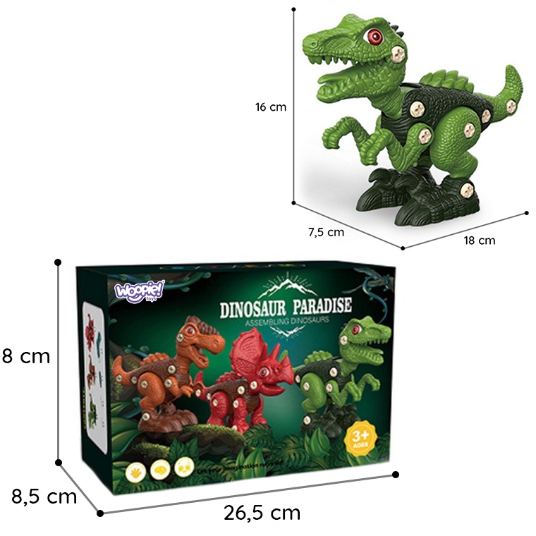 Kuulsa WOOPIE kaubamärgi komplekt on ideaalne mänguasi väikestele konstruktoritele, mis tutvustab teie lapsele eelajaloolisi aegu. Komplekt sisaldab koguni 89 elementi, sealhulgas osi, millest laps saab funktsionaalse kruvikeeraja või otstega elektritrelli abil dinosauruse kokku panna. Puur pöörleb mõlemas suunas, mis võimaldab seda keerata või lahti keerata. Komplektis on 3 dinosaurust (Tyrannosaurus Rex, Velociraptor, Triceratops). Pärast kokkupanekut on dinosaurusel liikuvad elemendid: pea, saba ja jäsemed, mis annab suuremad mänguvõimalused. Mänguasi arendab käelisi oskusi, nn peenmotoorikat – käte liikumist. Keeratav ja kokkupandav mänguasi viib lapse väikese meistrimehe maailma. Dinosaurus on ajatu teema, mida armastavad kõik lapsed. Eelajalooliste olenditega mängides laiendab teie laps oma kujutlusvõimet ja loovust. Omadused: – mänguasi vanuses 3 eluaastat, – komplekt sisaldab 89 elementi, sh 3 dinosaurust, puur ja kruvikeeraja, – trellil on keeramis- ja lahtikeeramisfunktsioon, – liigutatavad elemendid: pea, saba ja jäsemed, – mänguasi arendab lapse käelisi oskusi, ergutab loovust ja ergutab kujutlusvõimet maailma. of – värviline pakend, ideaalne kingituseks, – vajalikud patareid: 2 x “AAA” (ei kuulu komplekti), Mänguasi arendab: – käelisi oskusi, – loovust, – kujutlusvõimet. Woopie on üks juhtivaid plastist mänguasjade tootjaid Euroopas. Woopie tooteid müüakse edukalt koduturul ja kogu Euroopas. Woopie kaubamärgi mänguasjadel on üks eesmärk – teha lastele rõõmu! Rikkalikust sortimendist leiab Woopie muuhulgas karnevalikostüüme ja kostüüme lastele, aga ka rippkiikesid, vahtplastist mänguasju, erinevat tüüpi aiamänguasju ja palju muud! Laske end lõbusalt kaasa haarata – laske end Woopil kaasa haarata!