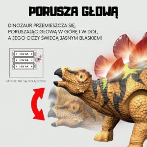 Reisige ajas tagasi dinosauruste ajastusse Woopie imelise kaugjuhitava Stegosaurusega! See realistlik mänguasi on ideaalne kingitus igale väikesele uurijale ja eelajalooliste olendite fännile. Täiustatud funktsioonide ja intuitiivsete juhtnuppudega pakub meie Stegosaurus tunde sõltuvust ja põnevat lõbu, võimaldades teie lapsel kontrollida tõelise dinosauruse liigutusi ja helisid. Ole valmis möirgama, tantsima ja unustamatuid seiklusi nautima! Omadused: – Lastele alates 3. eluaastast – Dinosaurus liigub edasi ja tagasi, imiteerides tõelise stegosauruse kõnnakut – Dinosauruse pea ja saba kõiguvad liikumisel – Dinosauruse seljal olevad silmad ja taldrikud süttivad – Teeb võimsaid möirgamisi, simuleerides tõelisi dinosauruste helisid – Dinosauruse jada, millel on eriline tants, esitamise režiim. lisab mängule interaktiivsust – Ergonoomiline kaugjuhtimispult võimaldab hõlpsalt juhtida kõiki funktsioone – 3 sagedusrežiimi (ABC) paljude dinosaurustega samaaegseks mängimiseks. – Tugev konstruktsioon tagab vastupidavuse ja pikki tunde. – Dinosauruse ja kaugjuhtimispuldi jaoks on vaja 5 x 1,5 V AA patareid (ei kuulu komplekti) Mänguasi arendab: – kujutlusvõimet – loovust – käelisi oskusi