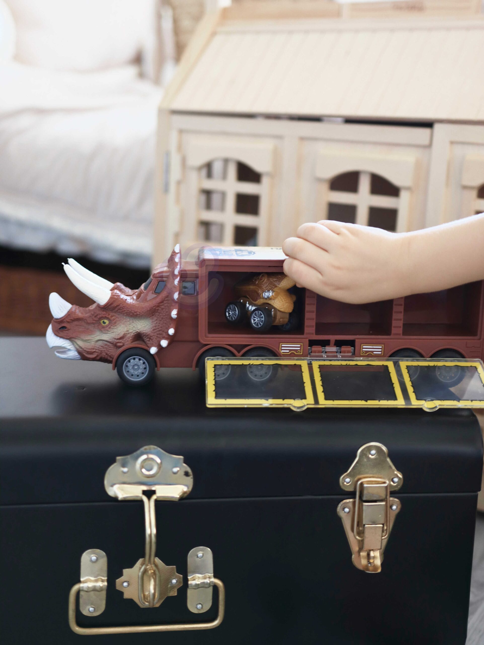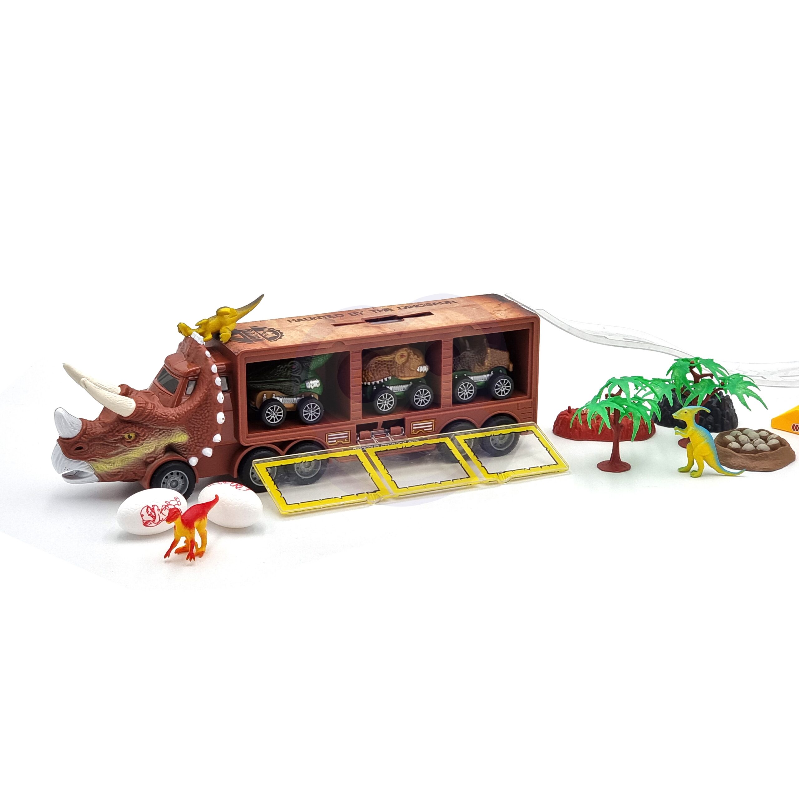 Woopie dinosauruse kujuline veoauto on suurepärane idee lastele. Mängu kaudu sukeldub laps dinosauruste ajastu maailma. Väga realistlikult valmistatud sõidukid, pöörates tähelepanu igale detailile. Suure veoauto sees on 3 väiksemat ratastel dinosauruse sõidukit. Kogu komplekt sisaldab käivitajat, mis võimaldab melu veelgi mitmekesistada. Asetage, klõpsake, hüppage välja! Komplektis on ka palju tarvikuid, nagu dinosaurused, puud, kivid jne.. Veokil on ka valgus- ja heliefektid, mida saab sisse lülitada 3 nupu abil (iga nupp lülitab sisse erineva heli või meloodia ning iga nupp süütab haagise sees olevad tuled). Suurepärane võimalus mängida koos sõpradega või üksi. Omadused: – mänguasi vanuses 3 ja vanemad, – komplektis on 3 dinosauruse autot, liumägi ja kanderakett jne, – lohista üks kolmest väiksemast autost tahapoole, lase lahti ja vaata, kuidas see ise sõidab! – heli- ja valgusefektid – 3 nuppu, – hõlpsasti kasutatav kanderakett, – “korraga” saab käivitada ainult ühe sõiduki, – kingituseks täiuslik pakend, – peensusteni viimistletud, – suure veoki sarved on kummist, – kaasas akud. Komplekti kuulub: – liumäega veoauto, – kanderakett, – 3 autot/dinosaurust, – 3 dinosaurust, – 2 kivi, – 2 puud, – 2 muna, – voodi munadega.