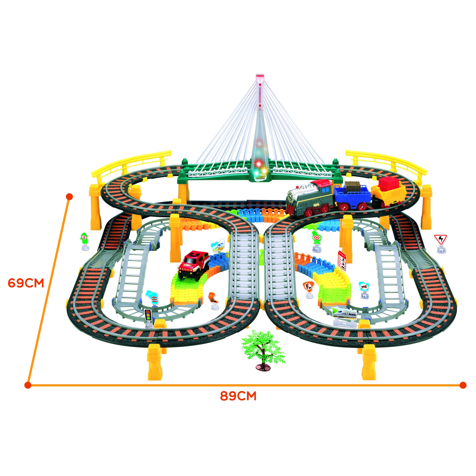 WOOPIE kaubamärgi 2-in-1 võidusõidurada + elektrirong loodi väikestele võidusõidufännidele mõeldes! Komplekti lisaeelis on kaasas olev raudtee ja viadukt. Sõidukid liiguvad eraldi radadel, muutes selle hämmastava komplekti kaks-ühes mänguasjaks. Veduril on 2 vagunit, millesse väikeraudteelane saab koormaid paigutada. Rööpad on iseseisvad – sõita saab korraga nii rongi kui autoga. Värvikad värvid ja mänguasja töötluse kvaliteet loovad ainulaadse atmosfääri ja lisavad autentset välimust. Komplektis on ka puud ja muud raja ümbrust mitmekesistavad elemendid. Komplektis on koguni 192 elementi, sealhulgas vedur, auto ja värviliste tuledega tõstesild. Komplekti lisaeelis on rongi tekitatav realistlik heli! Mänguasi on teie väikelastele täiesti ohutu. Mängides arendab mudilane käelisi oskusi ja kujutlusvõimet. Omadused: – mänguasi, mis on mõeldud lastele alates 6. eluaastast, – kahetasandiline rong viadukti/silla ja võidusõidurajaga – koguni 192 elementi, – vedur tõmbab koormaga 2 vagunit, – pärast läbimist viaduktil säravad värvilised tuled, – rongi poolt tekitatud realistlik heli, – A-auto: 5 patareid kaasas 2A -1. 1 x 1,5 V AA patareid (ei kuulu komplekti), – sild: 3 x 1,5 V AA patareid (ei kuulu komplekti). Komplekti kuulub: – 96x auto rööbastee osa – 23x raudteerööbaste osa, valgustatud akutoitega sild – 14x toed – 2x turvapiirded – 2x vagunid – 1 x akuga auto – 1 x akuga vedur realistlike helidega – 1 x puu – kaubad vagunitele – teeviidad – postid silla jaoks