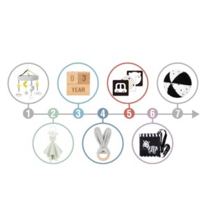 Avastage WOOPIE GREENi ainulaadne õppekast! bränd, mis on loodud kõige pisematele beebidele vanuses 0-2 kuud. See on 6 hoolikalt valitud sensoorse ja hariva mänguasja komplekt, mis toetavad teie lapse arengut alates esimestest elupäevadest. Iga element on loodud Montessori meetodi vaimus, et stimuleerida nägemis-, kompimis- ja kuulmismeeli ning arendada loogilist mõtlemist ning käe-silma koordinatsiooni. Karbist leiate ka juhendi lapsevanematele, tänu millele saate teada, millal ja kuidas konkreetseid mänguasju tutvustada. See on ideaalne kingitus vastsündinule ja noorele emale, mis ühendab õppimise, lõbu ja arengu ühes! Omadused: – Beebidele vanuses 0 kuni 2 kuud – Sisaldab 6 õpetlikku mänguasja ühes pakendis – Montessori meetodi vaimus – Toetab tervislikku psühhomotoorset arengut – Sisaldab juhendit vanematele – Ideaalne kingiidee vastsündinule ja emale Komplekti kuulub: – Hällikarussell “Öötaevas” – tähtede kujuliste pehmete ripatsidega, mis rahustavad ja ergutavad silmi. – Kahepoolsed kontrastkaardid – toetavad beebi nägemise arengut ja keskendumist. – Plush kontrastne pall – harjutab kõhul lamades haaramist, nägemist ja motoorseid oskusi. – Sensoorne kaisujänku – pehme kaaslane, mis annab turvatunde. – Heliefektidega pehme kontrastne raamat – arendab nägemist, kuulmist ja motoorseid oskusi, innustades mängima. – Puidust ökoloogiline hambahari “Bunny” – vaigistab igemevalu ja toetab kompimismeele arengut. – Puidust klotsid “Child’s age” – sobivad suurepäraselt suveniirfotodeks ja ruumikaunistusteks. Mänguasi arendab: – Meeli: nägemine, kuulmine ja kompimine – Käe-silma koordinatsioon – Loogiline mõtlemine ja taju – Peen- ja jämedat motoorset oskust – Turvatunnet ja emotsionaalset sidet vanemaga