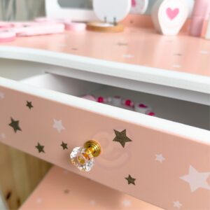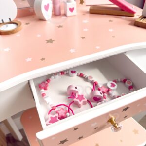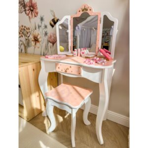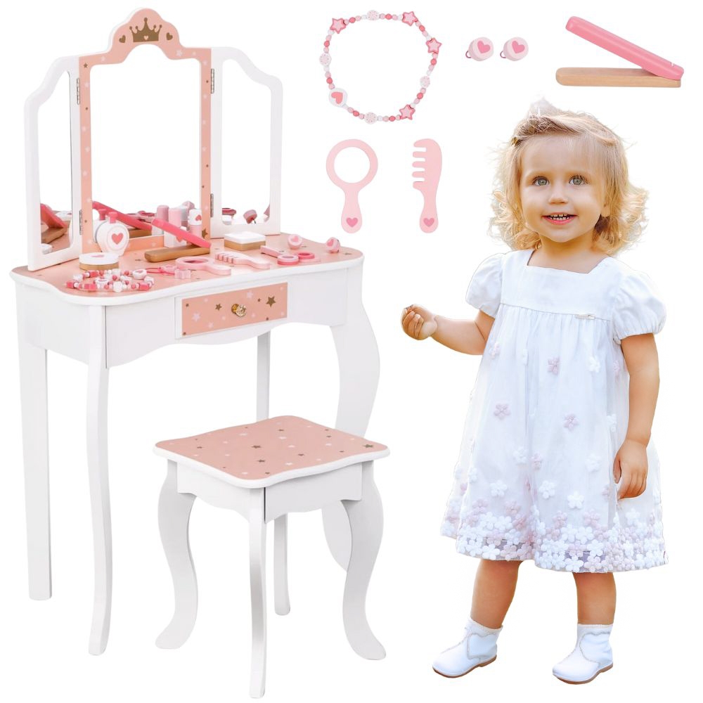 Puidust tualettlaud aksessuaaridega lastele firmalt Woopie Green on äärmiselt võluv ja viimistletud mänguasi igas detailis, mis viib lapsed kujutlusvõime, ilu ja loomingulise mängu maailma. Mõeldud kõige pisematele stiili- ja esteetikasõpradele, see pole mitte ainult kaunis mööbliese tuppa, vaid ka lapse emotsionaalset, sotsiaalset ja käelist arengut toetav tööriist. Tualettlaud avaldab muljet oma elegantse disainiga, mis on inspireeritud klassikalisest täiskasvanutele mõeldud mööblist – sellel on õrna kirjutuslaua kuju, millel on kolmekordne peegel, sahtel väikeste esemete jaoks ja mugav, lapse pikkusele kohandatud taburet. Kogu asi on valmistatud kvaliteetsest puidust, roosade, valgete ja kuldsete toonidega. Kolmeosaline liigutatavate tiibadega peegel võimaldab vaadata ennast erinevatest külgedest ning lai lauaplaat annab palju ruumi kõikidele vajalikele tarvikutele. Komplekti kuulub ka rikkalik aksessuaaride komplekt, mis muudavad lõbu veelgi realistlikumaks. Omadused: – Mänguasi lastele alates 3. eluaastast – Tugev puitkonstruktsioon – valmistatud naturaalsest puidust, garanteerib kasutamise ajal vastupidavuse, stabiilsuse ja ohutuse – Kolmeosaline peegel – liigutatavate tiibadega võimaldab vaadata ennast erinevatest külgedest, mis lisab mängule realistlikkust – Lauaplaadi suur pind – võimaldab mugavalt paigutada kõik aksessuaarid, praktilised lastekaunistused ja juuksurikaunistused kord ja korraldus korraga – Ohutu viimistlus – kõik servad on ümarad ja tualettlaua värvimiseks kasutatud värvid on mürgivabad ja lapsesõbralikud – Pastelsed värvid – õrnroosa, valge ja kuldne tähed loovad lastetuppa muinasjutulise atmosfääri – Kaasas mugav tabureti – reguleeritud tualettlaua kõrgusele, tagades selle suurepäraselt mugavuse mängimisel – Funktsionaalne ja dekoratiivne lastetuppa sobitamine – dekoratiivne kaunistus – Ideaalne kingiidee Komplekti kuulub: – Puidust tualettlaud peegli ja sahtliga – Komplektiga sobitatud taburet – Puidust aksessuaarid meigiks ja soenguks – Kamm, käärid, föön, käsipeegel – Peegliga pulber, lauvärv, huulepulk, küünelakk – Ehted: kaelakee, käevõrud, väikesed juuksepaelad ja aksessuaarid, rõngad kujutlusvõime ja loovus – laps loob ise lugusid ja mängib rolle, arendades fantaasiat ja stsenaariumite väljamõtlemise oskust – oskuste käsiraamat – karpide avamine, “meikimine” ja ehete kinnitamine harjutused käeliigutuste täpsus – silma-käe koordinatsioon – täpsust nõudvate tegevuste sooritamine – parandab lapse peenmotoorikat – täpsuse õppimist – kannatlikkust – keskendumist – täpsust oskus luua oma stiile annab iseseisvuse ja tegutsemisvõime tunde – planeerimisoskused – laps õpib tualettlaual järjekorda ja esemete loogilist paigutust – suhtlemist ja koostööd – õdede-vendade või sõpradega koos mängimine arendab sotsiaalseid oskusi