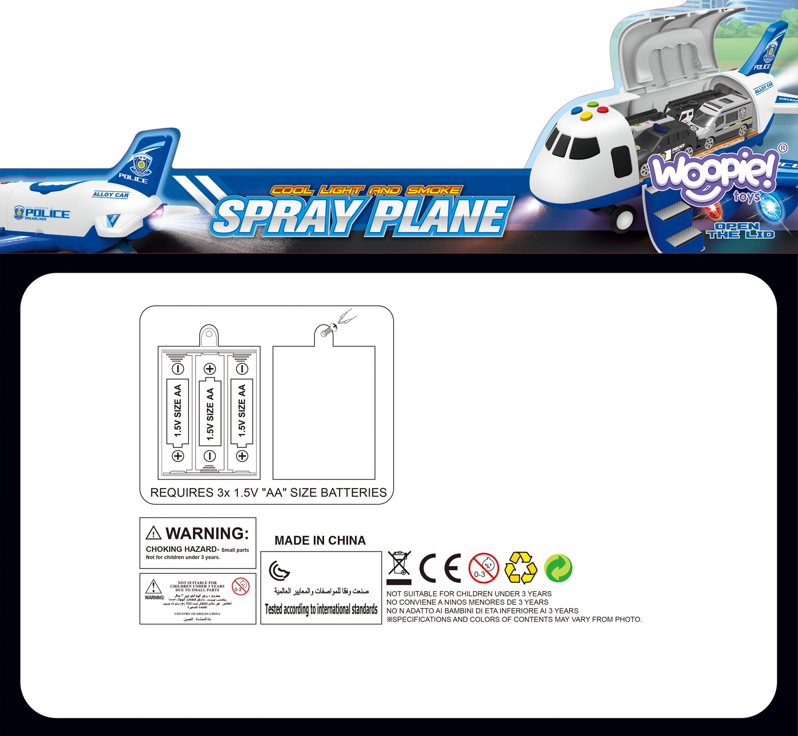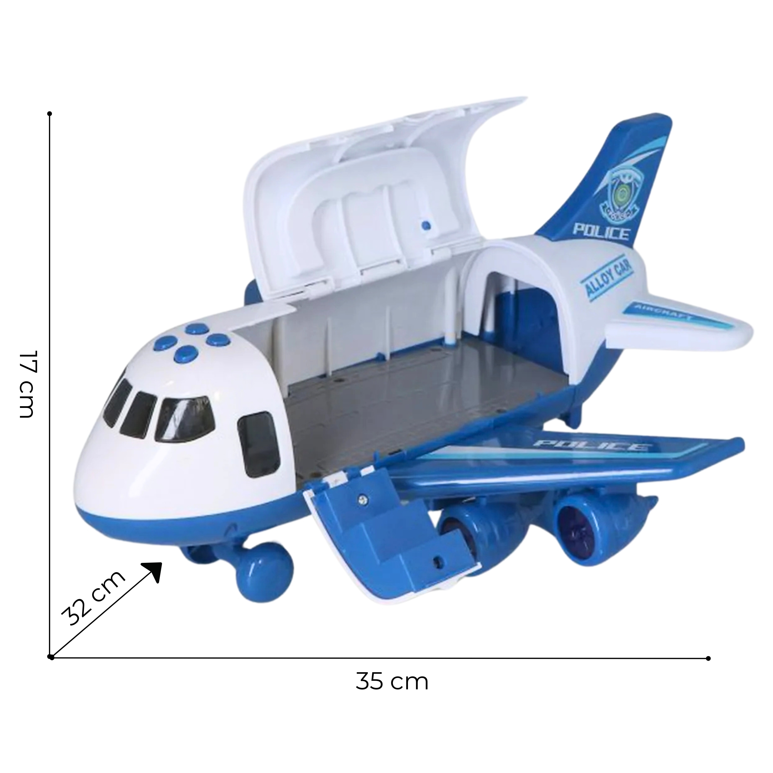 Interaktiivne politseilennuk kaubamärgilt WOOPIE rõõmustab kindlasti iga väikest action-fänni! Lennuk oli mõeldud sõidukite transportimiseks tänu spetsiaalselt kohandatud kaubaruumile, kuhu saab autosid paigutada. Lennuki avanev pool ja trepp võimaldavad autod sisse panna ning lennuki tagaosas on kaldtee autode kiireks lahkumiseks. Heli- ja valgusefektid lisavad meie taevasõidukile atraktiivsust. Neli nuppu teevad politseisireeni häält ja tulistamise helid tekitavad teie lapses tunde, nagu oleks ta politseioperatsioonil. Mänguasja ülaosas olev käepide võimaldab mugavalt mööda taevast liuelda. Omadused: – Mänguasi vanuses 3 ja vanemad – Veeauru funktsioon, mis imiteerib suitsu nagu päris lennukis! – Pakub fantastilist lõbu, sellel on 4 nuppu, mis lülitavad sisse vilkuvad LED-id ja signaalid. – Kaubaruumi avanevat luuki kasutatakse sõidukite laadimiseks. – Meeleolu mitmekesistavad valgus- ja heliefektid – Toiteallikaks on 3 AA patareid (ei kuulu komplekti). – autosid pole kaasas.