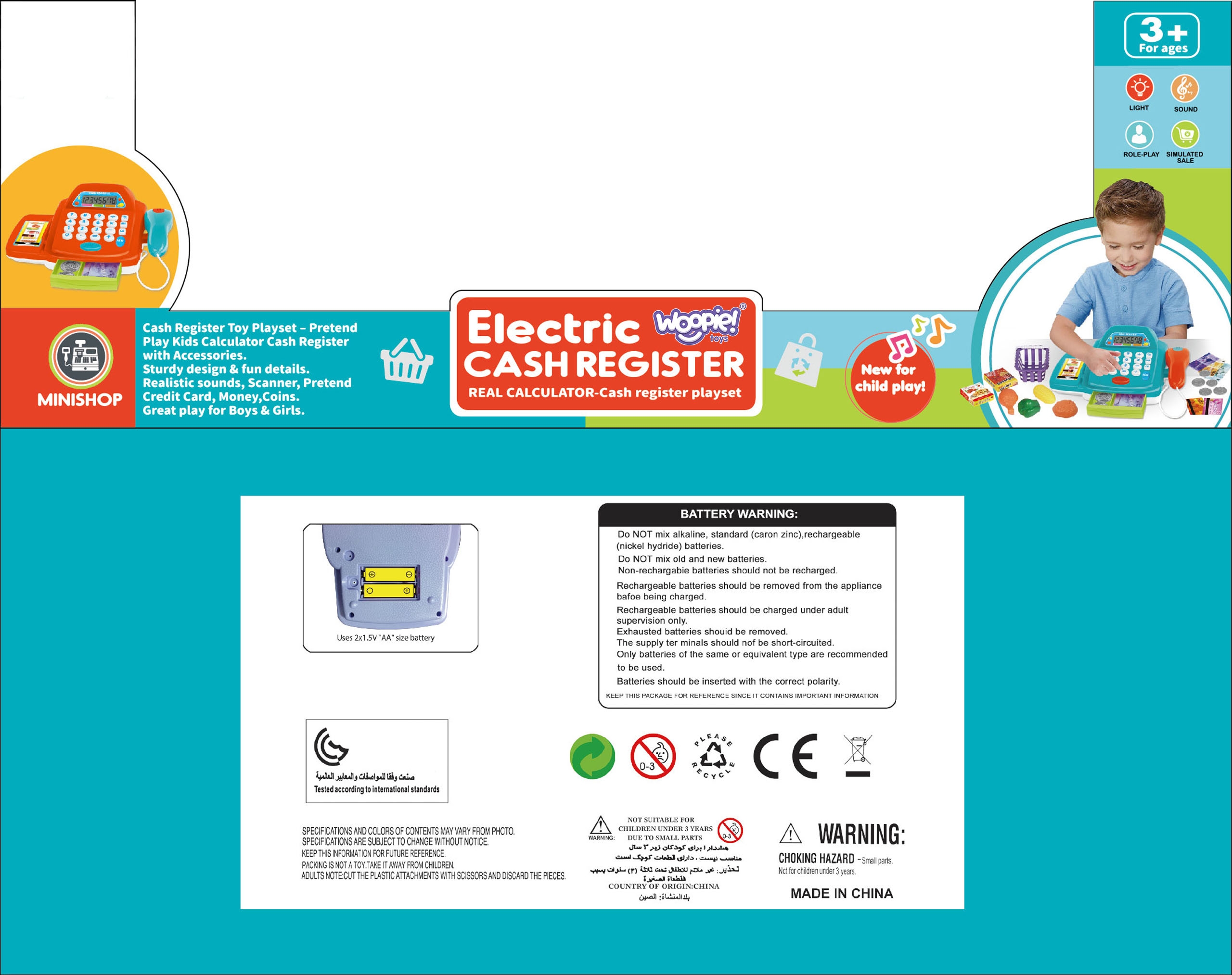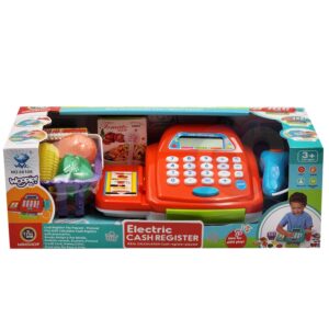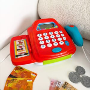 WOOPIE poe kassakomplekt koos tarvikutega on ideaalne pakkumine lastele, kes armastavad rollimänge. See interaktiivne hariv mänguasi ühendab õppimise meelelahutusega, tutvustades kõige pisematele ostlemise, loendamise ja kassaaparaadiga töötamise maailma. Tänu realistlikele funktsioonidele ja rikkalikule tarvikute komplektile saab laps tunda end nii müüja kui ka kliendina. Lapsed saavad valida ostetavad tooted, pakkida need korvi ja seejärel lugeja abil kassasse täita. Seejärel saab ostja maksta raha või maksekaardiga. Mänguasi sobib ideaalselt suuremas seltskonnas kasutamiseks ja rollideks jagatud. Omadused: – Interaktiivne poe kassa koos ekraaniga – Töötavad numbrinupud ja kalkulaatori funktsioon – Avatav kassakast – Liigutatav heli ja valgusega skanner – Tooge see lihtsalt toote lähedale – Maksekaardilugeja – Kaasas plastkaardid – Kassa realistlikud helid, skaneerimine ja sahtli avamine – Ostukorv toidukaupadega – Rahatähtede, müntide ja maksekaartidega avamise komplekt – Kassakomplekt sisaldab: poehoidjaga mängimiseks mõeldud kalendri plastist toiduained, nt. paprika, mais või kanakoib – mündid – krediitkaardid – rahatähed – ostukorv – skanneri häälte tegemine Mänguasi arendab: – suhtlemisoskust – matemaatika ja kalkulaatori kasutamise aluseid – peenmotoorikat – loovust ja kujutlusvõimet