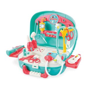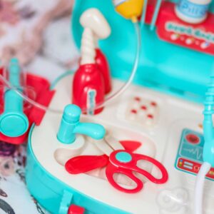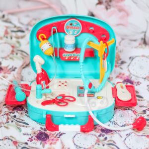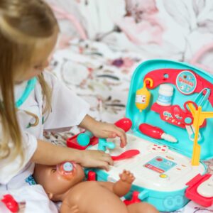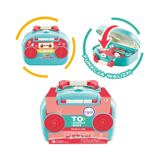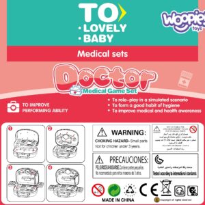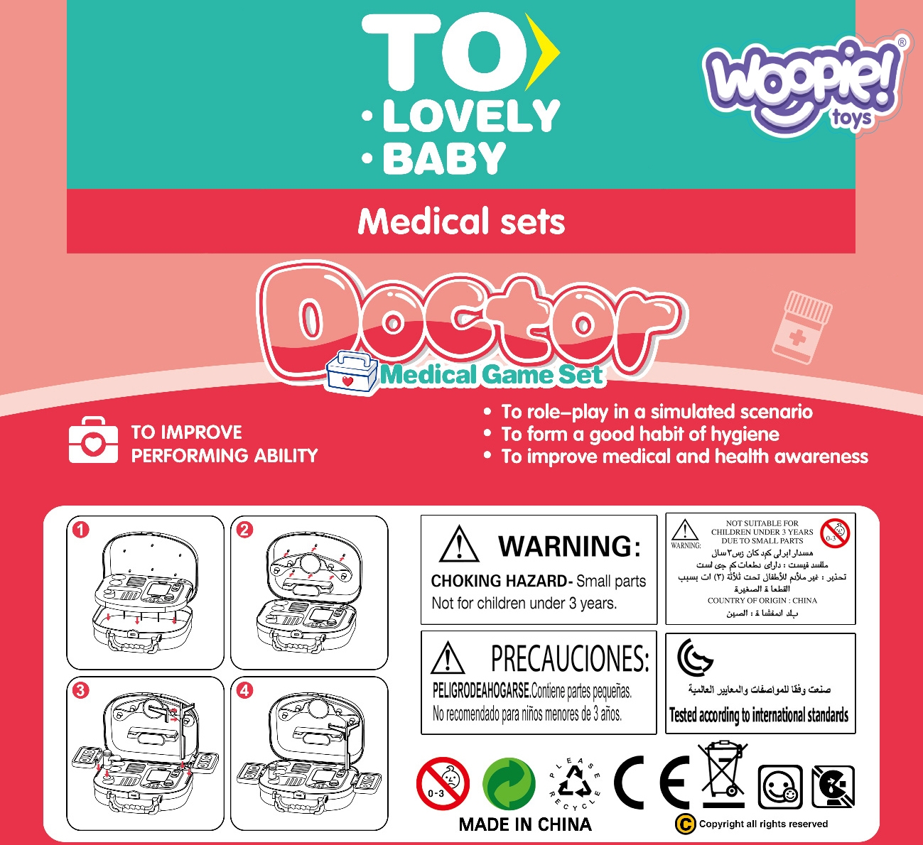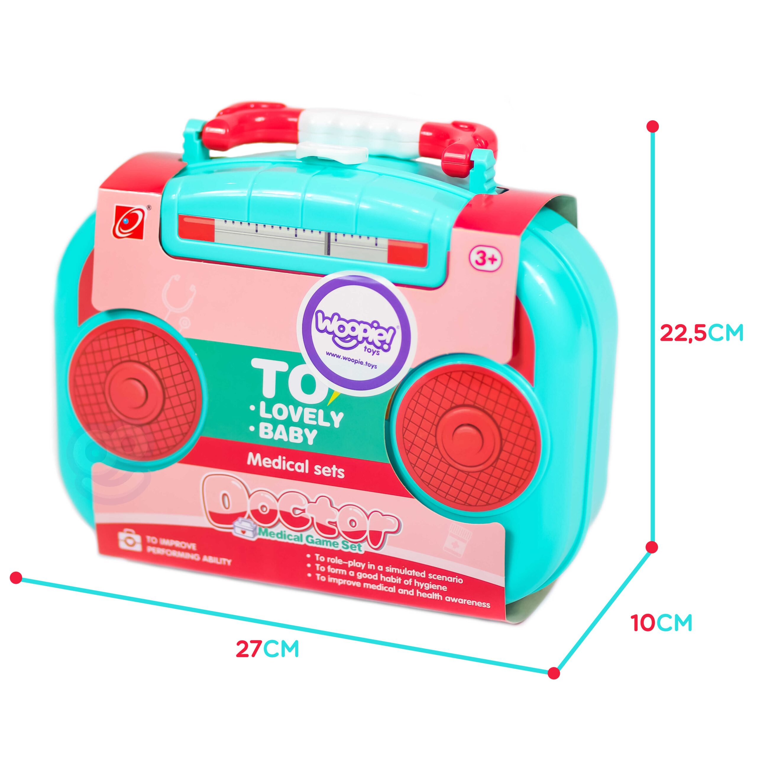 Woopie Little Doctor Set on iga väikese lapse unistus, sest kes ei tahtnud väikese inimesena saada arstiks ja ravida kõiki oma topitud sõpru ja perekonda? Komplektis on palju raviseadmeid, sh stetoskoop, tilguti, termomeeter ja palju muud. Kõik see on paigutatud kohvrisse, mis ühendab CTG-seadmete funktsiooni. Laps saab täita arsti või patsiendi rolli ning rühmas teistega koos mängides arendada sotsiaalseid ja lõimumisoskusi. Kogu komplekt on pakitud kaunisse kohvrisse, mis võimaldab komplekti erinevatesse kohtadesse tassida ja teiste lastega teadmisi jagada. Omadused: – “arsti” mängimine – rollimäng, – mugav käepide, mis teeb kaasaskandmise lihtsaks, – kohvri funktsioon – kõiki tarvikuid saab mugavalt ära peita, – ilusad türkiissinised ja punased värvid, – valmistatud kvaliteetsetest ja lastele ohututest materjalidest. Komplekti kuulub: – stetoskoop, – sihverplaadiga termomeeter sobiva temperatuuri kuvamiseks, – süstal, – käärid x 2, – kirurgiline nuga, – pintsetid, – tilguti, – ravimikarp, – värvilised kleebised, – kohver. Woopie kaubamärgi mänguasjadel on üks eesmärk – teha lastele rõõmu! Rikkalikust sortimendist leiab Woopie muuhulgas karnevalikostüüme ja kostüüme lastele, aga ka rippkiikesid, vahtplastist mänguasju, erinevat tüüpi aiamänguasju ja palju muud! Laske end lõbusalt kaasa haarata – laske end Woopil kaasa haarata!
