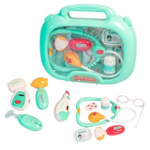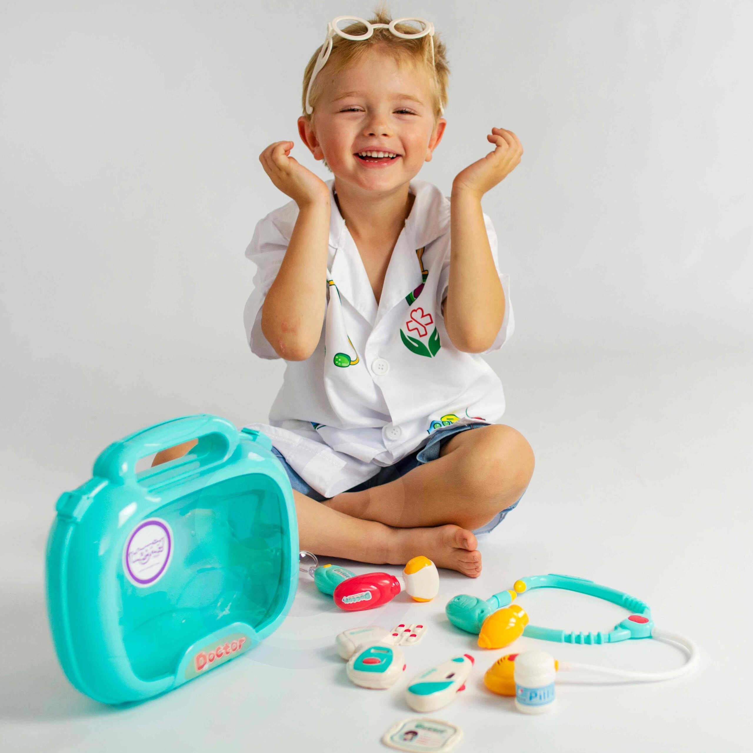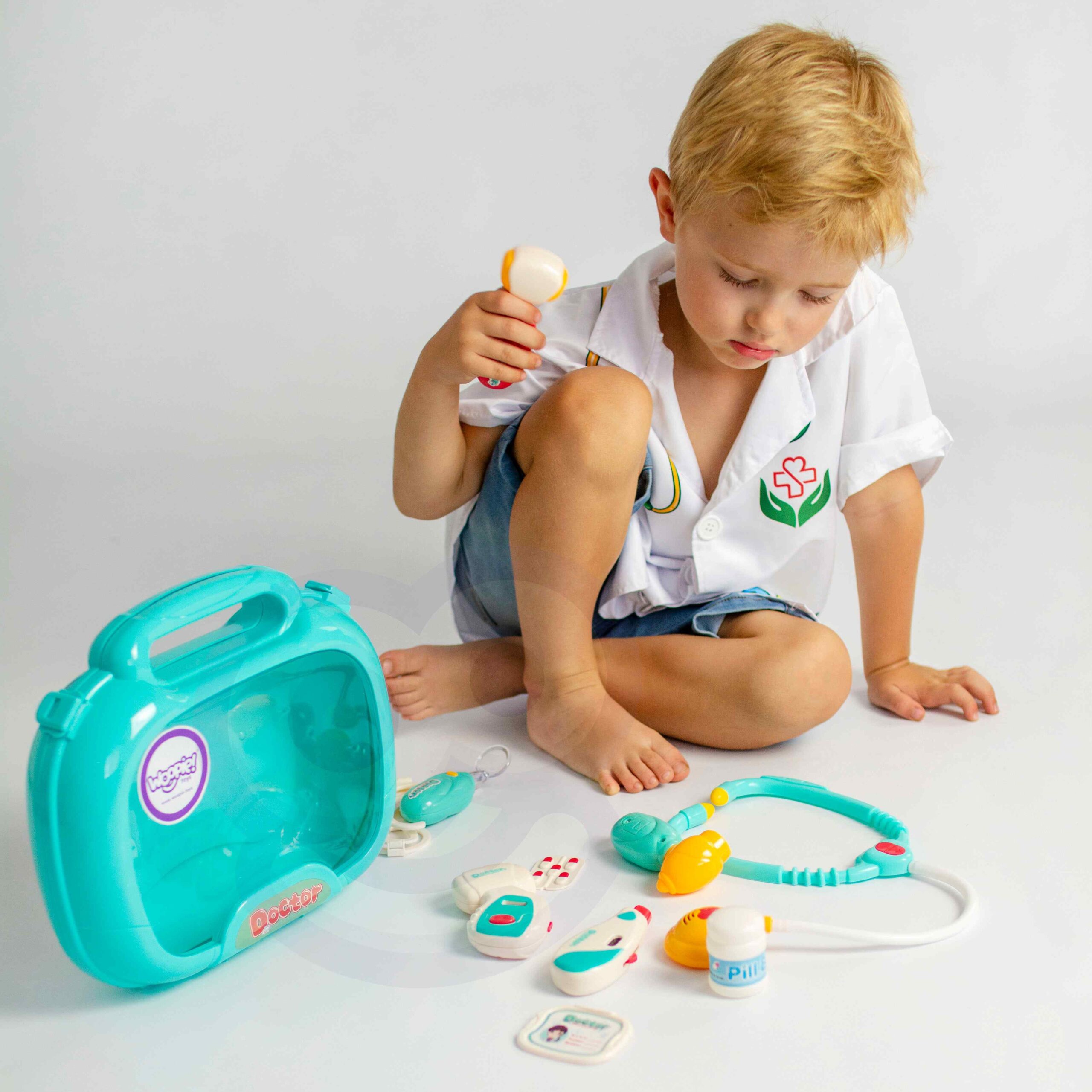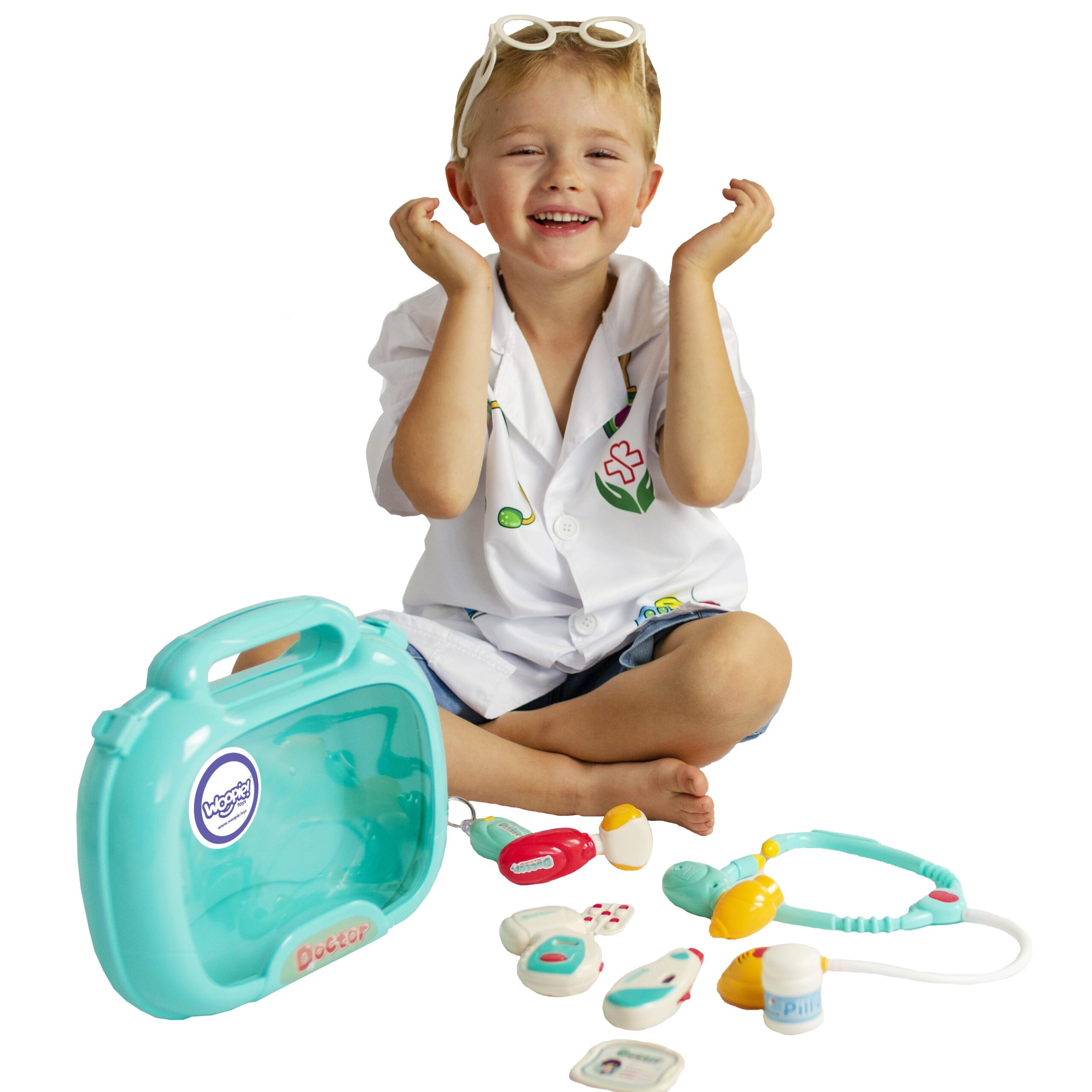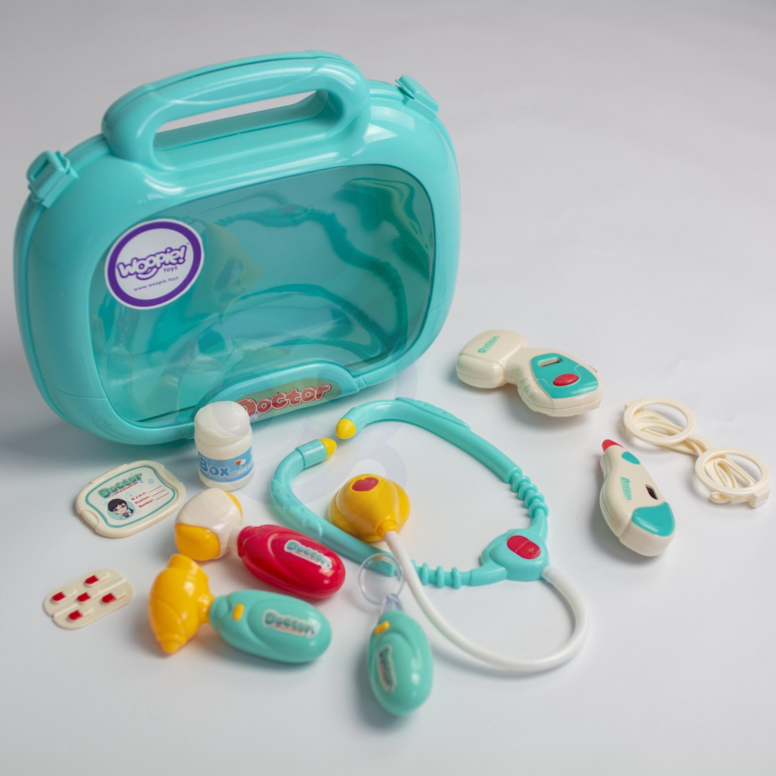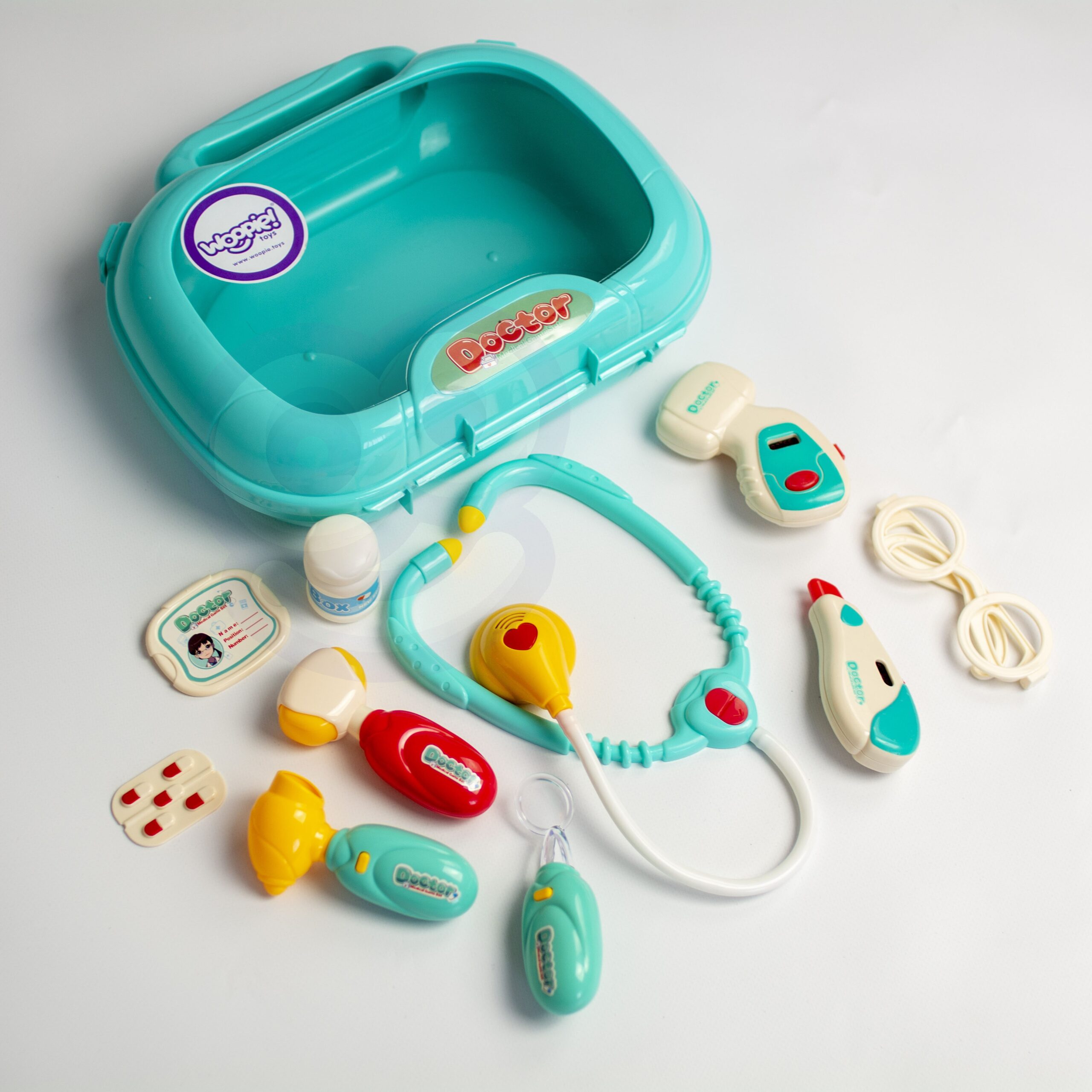 Woopie Little Doctor Set on iga väikese lapse unistus, kes soovib saada arstiks! Komplektis on palju raviseadmeid, sealhulgas: stetoskoop, vererõhuaparaat, termomeeter ja palju muid tarvikuid. Instrumentidel on erifunktsioonid, mis panevad lapse tundma tõelise arstina. Stetoskoobil on laiad mugavad kõrvaklapid ja valgus, mis uuringu ajal pulseerib ja tekitab südamelööke. Vererõhumõõtja näitab 3 mõõtmist ja sellel on taustvalgustusega ekraan. Termomeeter näitab üht kolmest temperatuurist (reguleeritav nupuga) ja tõstab esile mõõtmistulemuse ning otoskoobil ja käsipeeglil on tuled. Kõik see on paigutatud käepidemega mugavasse kohvrisse. Laps saab arendada oma kujutlusvõimet ja mängida arsti või patsiendi rolli! Omadused: – 3-aastastele ja vanematele lastele – mängib “arsti” – rollimäng – mugav käepide, mis teeb kaasaskandmise lihtsaks – kohvri funktsioon – kõiki tarvikuid saab mugavalt ära peita – seadmed sobivad lapse käele – pikkus ca. 11-12 cm – ilusad türkiissinised ja punased värvid – valmistatud kvaliteetsetest materjalidest, lastele ohutu – toiteallikas: 2 x AG13 ja 8 x AG10 patareid (kaasas) Komplekti kuulub: – stetoskoop – vererõhumõõtja – termomeeter – otoskoop – “peegel” – plastikust patsiendikaart – meditsiinilised prillid – haamer – arenduskostüümid – imagopillid loovus – empaatia ja hoolivus teiste vastu – sotsiaalsed oskused ja rollimäng – aitab taltsutada hirmu arsti külastamise ees