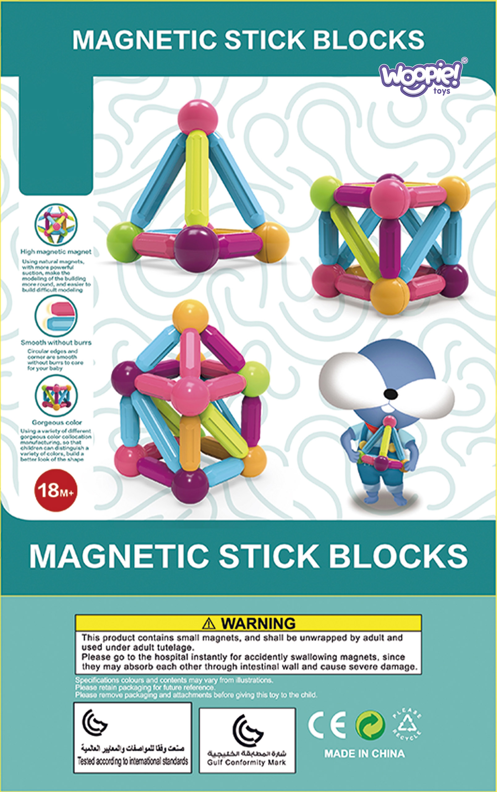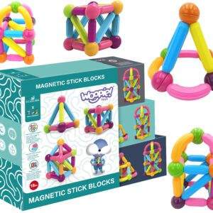 Paksude magnetklotside komplekt kaubamärgilt WOOPIE ühendab endas lõbu ja õppimist! Noorel disaineril pole vaja teha muud, kui elemendid omavahel ühendada ning hakata looma uhkeid hooneid ja palju muid paigutusi, nt. geomeetrilised kujundid või minimaja! Ainus piirang on teie kujutlusvõime. Komplekt sisaldab 28 elementi ja lisavihikut koos juhiste ja näidismustritega. Klotsid on paksud, värvilised ja turvalised – sobivad suurepäraselt väikeste laste kätele. Kõik pakitud mugavasse karpi. Klotsidest konstruktsioonide kokkupanek arendab lapse loovust, käelisi oskusi (“peenmotoorikat”), ruumilist kujutlusvõimet ja keskendumisvõimet. Omadused: – mänguasi alates 18. elukuust, – 28 elemendist koosnev magnetklotside komplekt, – paksud, ohutud klotsid, mis sobivad ideaalselt väikeste laste kätele, – piiramatu erinevate konstruktsioonide ehitamise võimalus, – arendab loovust, kujutlusvõimet, käelisi oskusi (“peenmotoorikat”), ruumilist kujutlusvõimet ja keskendumisvõimet, – ideaalne pakend kingituseks. Komplekti kuulub: – 8x metallist kuulid klotside ühendamiseks, – 4x kaarekujulised pulgad, – 10x lühemad pulgad, – 6x pikemad pulgad, – vihik juhiste ja näidismustritega. Klotside mõõdud: – ploki paksus – 2 cm, – pikkus (nt pikem sirge pulk) – 8,7 cm, – kuul – läbimõõt 3,5 cm.