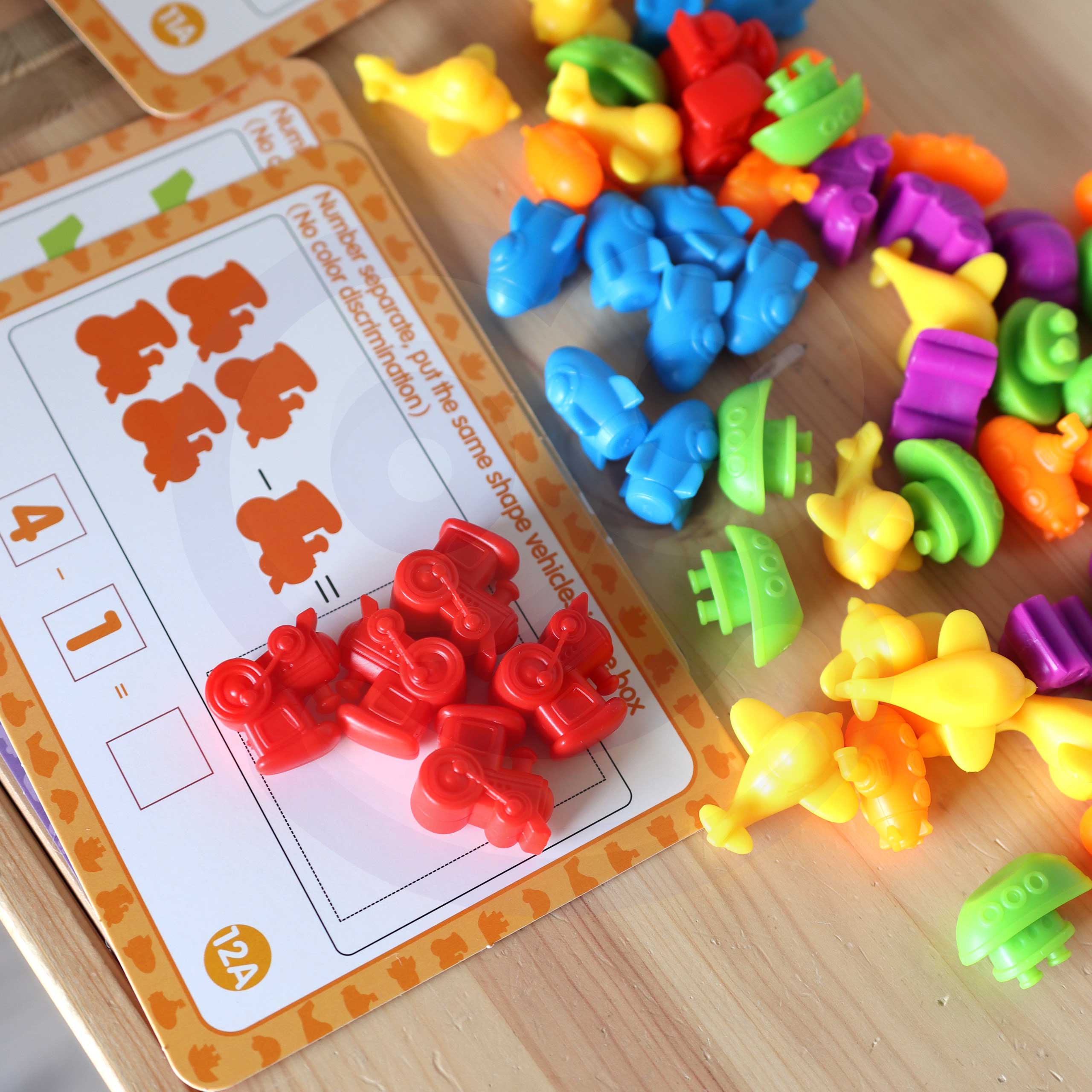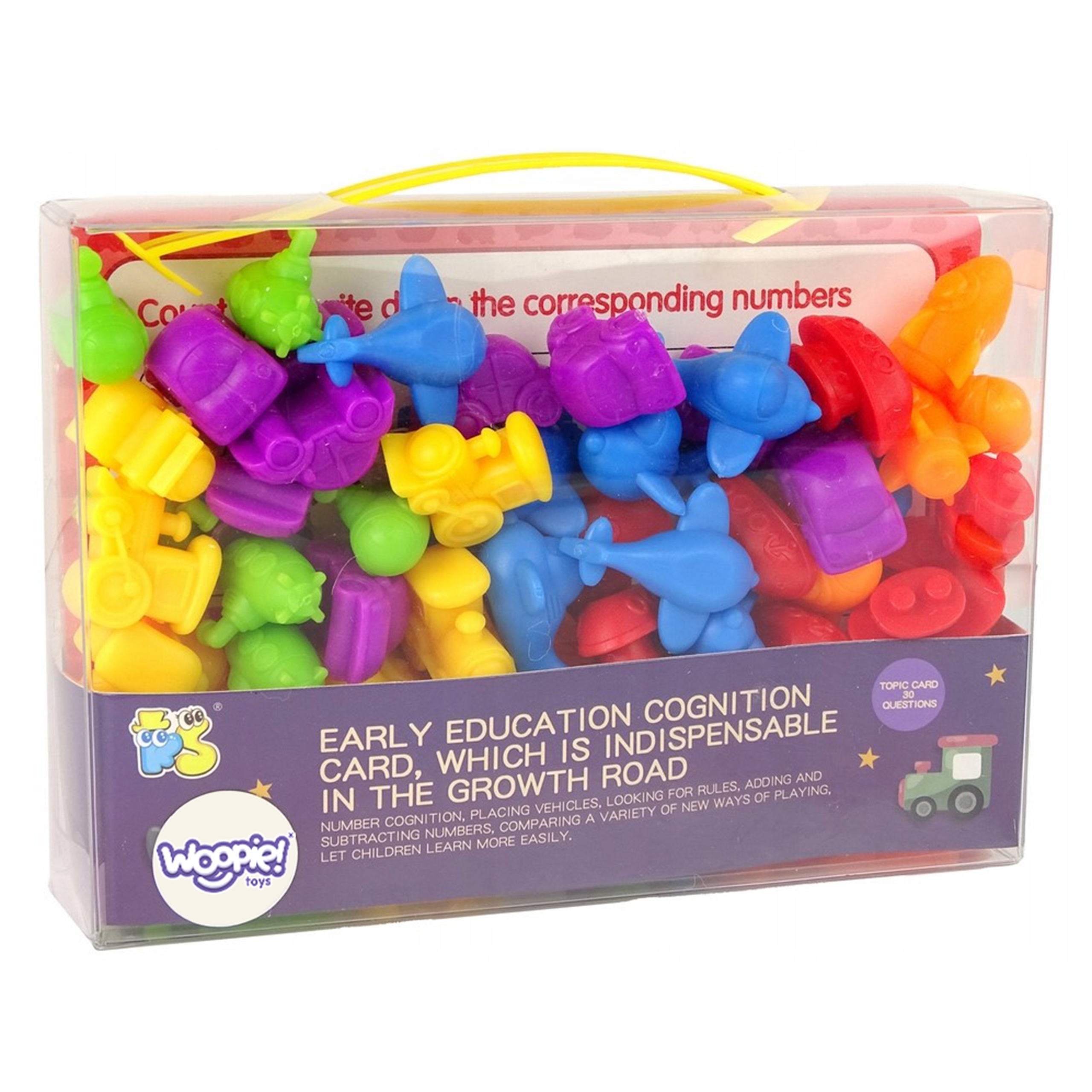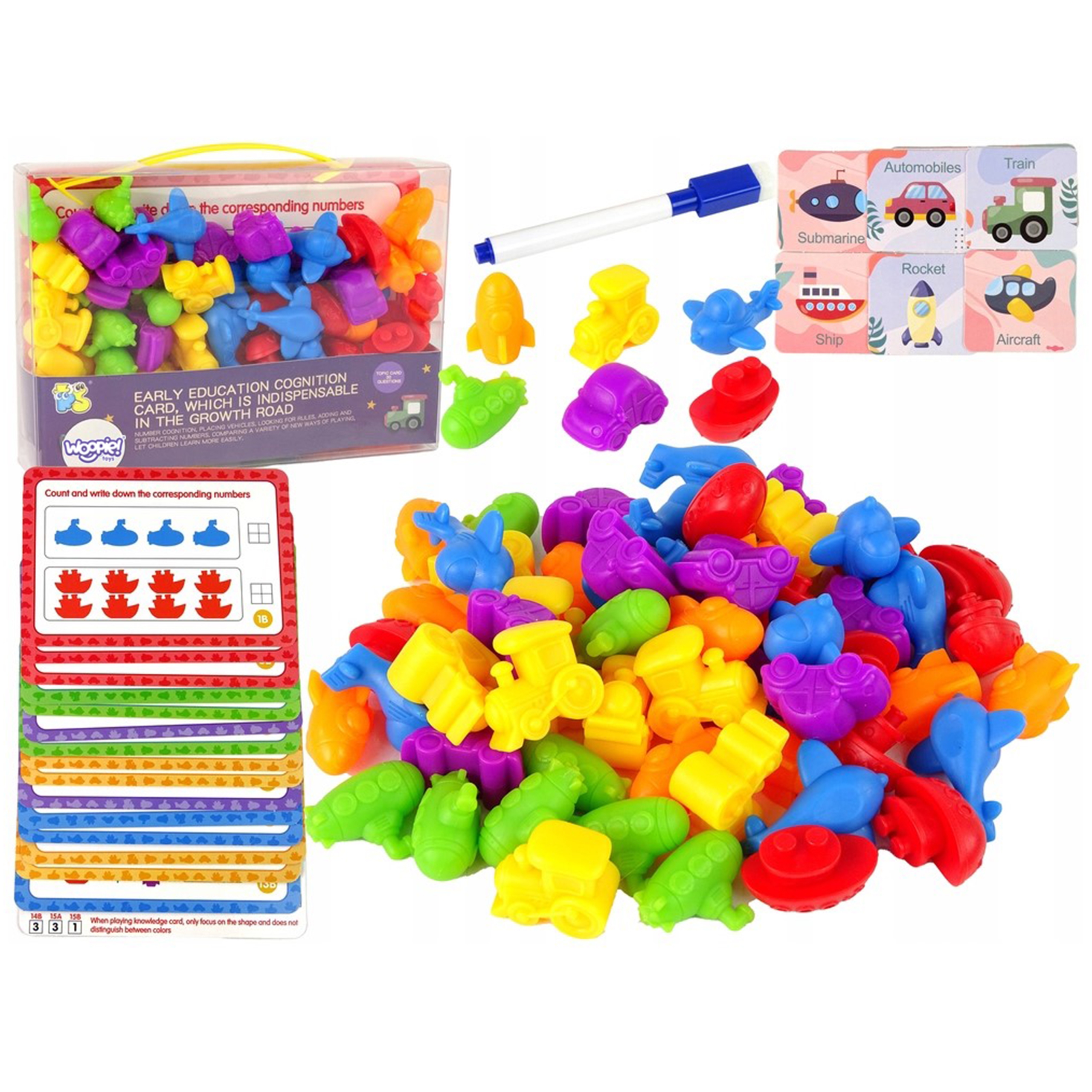 WOOPIE kaubamärgi Vehicles Educational Set on lihtne, kuid tõhus abivahend õppimiseks ja lõbutsemiseks. Mäng hõlmab matemaatilise harjutuse sooritamist kaardil lausetega, kasutades kujundeid ja markerit. Näidisülesanne on: mustri leidmine ja sellele sobiva sõiduki asetamine, joonistatud sõidukite loendamine ja kirjutamine selleks ettenähtud kohta jne. Lisaks on mänguasjal palju harivaid võimalusi. Lisaks loendamise õpetamisele saab figuure kasutada ka värvide õppimiseks. Mänguasi kasvab koos lapsega, sest seda saab kasutada keele õppimiseks hilisematel noorukiea aastatel. Komplekt on suurepärane alternatiiv tavapärasele õpetamisviisile – õppimisele läbi mängu! Tunnused: – mänguasi vanuses 3 aastat, – komplekt sisaldab 83 elementi, – mõeldud värvide ja numbrite ning inglise keele õppimiseks, – mäng hõlmab matemaatika harjutuse sooritamist kaardil lausetega, kasutades kujukesi ja markerit, – kujukesed on kummist ja lastele ohutud, – mängu kaudu õppimine, – mänguasi inglise keeles – kasvab koos lapsega kasutatav keel (noorukieas) kasvab koos lapsega. Komplekti kuulub: – 16 ülesandekaarti, – 10 punast kosmoselaeva, – 10 kollast laeva, – 10 lillat rongi, – 10 rohelist autot, – 10 sinist stingray’t, – 10 oranži allveelaeva, – 6 kaarti sõidukite kirjeldustega (inglise keeles). – markerpliiats, Kaardiülesande maht: – mudilase ülesandeks on paigutada sobiv arv figuure ja need kokku lugeda, – loendada joonistatud sõidukid ja kirjutada need selleks ettenähtud kohta, – leida muster ja asetada sellele sobiv sõiduk, – võrrelda ja loendada. Kontrollige, millised on vähem – liitmine ja lahutamine.
