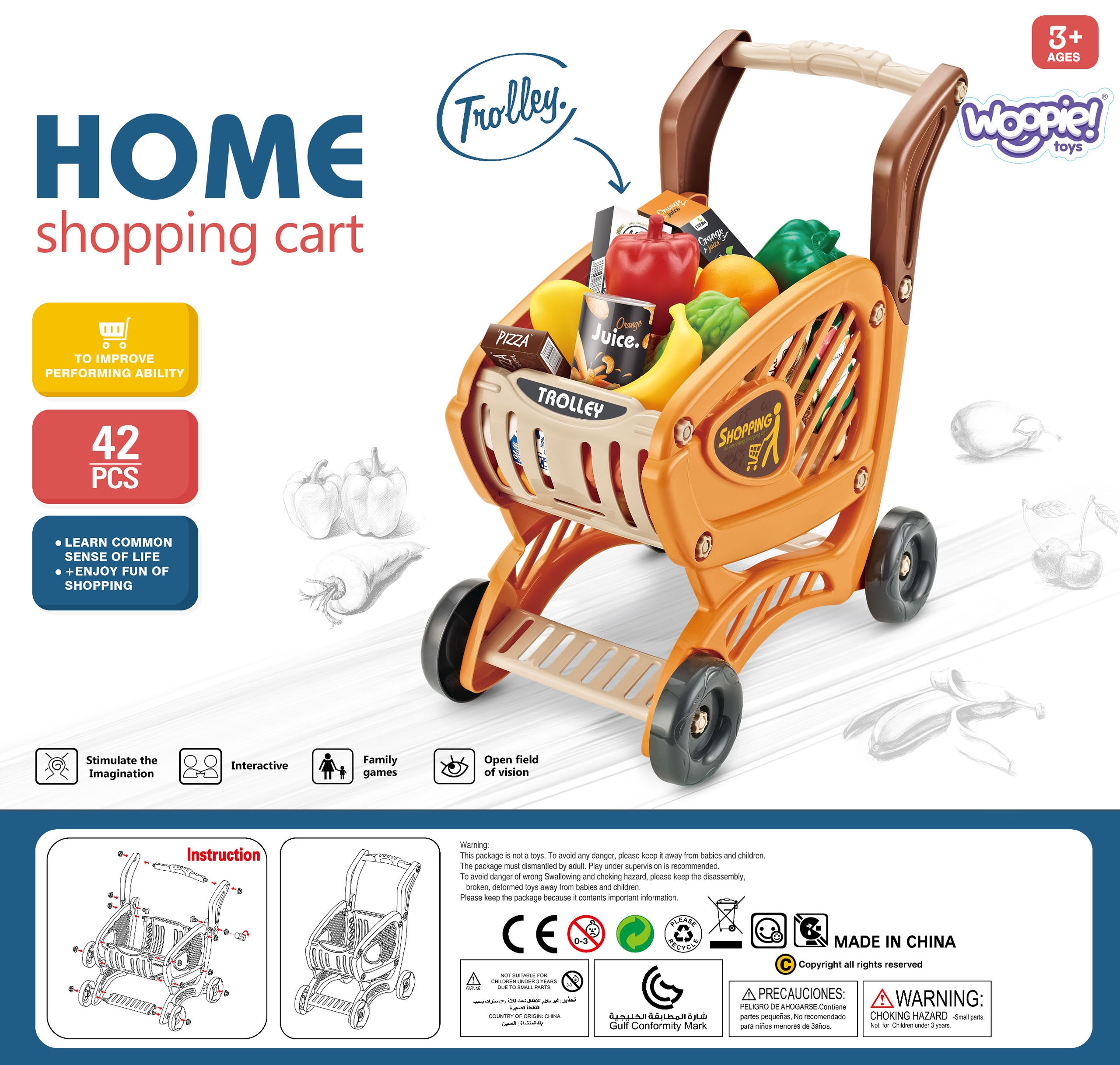 Nüüdsest saab teie laps tänu maineka Woopie kaubamärgi Ostukorvile ostleda oma reeglite järgi. Mis võib tema ostukorvi minna? Kõik hõrgutised – küpsised, värsked puuviljad, köögiviljad ja palju muud. Korraldage lastetoa vahekäigud erinevatesse kohtadesse paigutatud poetoodetega ja ülejäänu jätke väikese kliendi kätesse. Lõbutsemisel ei tule lõppu! Oskus poes või supermarketis ostlemise kohustuse täitmisel täiskasvanuid jäljendada võimaldab lapsel õppida iseseisvust, loogilist mõtlemist ja mõista raha väärtust. Toidutooteid saavad lapsed mängida mitte ainult klassikalises poes, vaid ka koduköögis või restoranis. Omadused: – Alates 3. eluaastast, – Toode on lastele ohutu, – Vastupidavast materjalist elemendid, – Ideaalne igaks elujuhtumiks mänguasi, – Vanker avaneb eest kruvi keerates. Komplekti kuulub: – Ostukorv, – 42 tarvikut, sealhulgas: – joogid, – piim, – puuvili, – juurviljad, – munad, – maiustused, – küpsised, – kommid, – raha. Woopie kaubamärgi mänguasjadel on üks eesmärk – teha lastele rõõmu! Rikkalikust sortimendist leiab Woopie muuhulgas karnevalikostüüme ja kostüüme lastele, aga ka rippkiikesid, vahtplastist mänguasju, erinevat tüüpi aiamänguasju ja palju muud! Laske end lõbusalt kaasa haarata – laske end Woopie’l kaasa haarata!